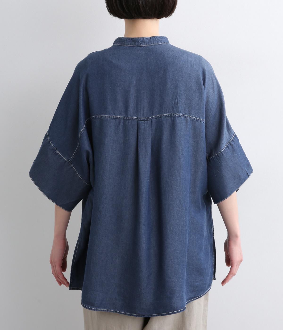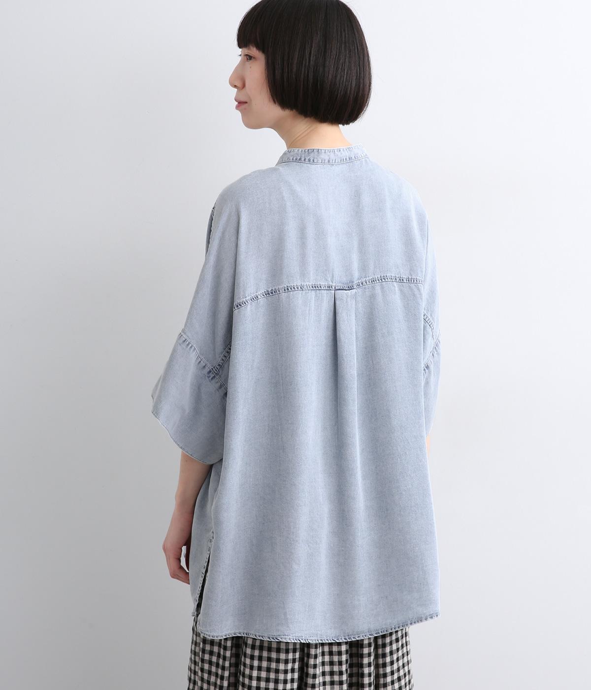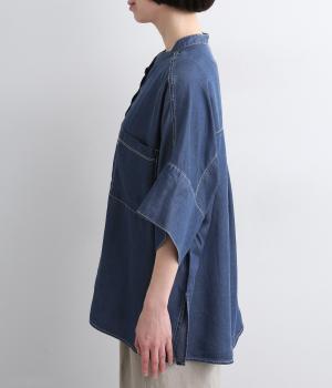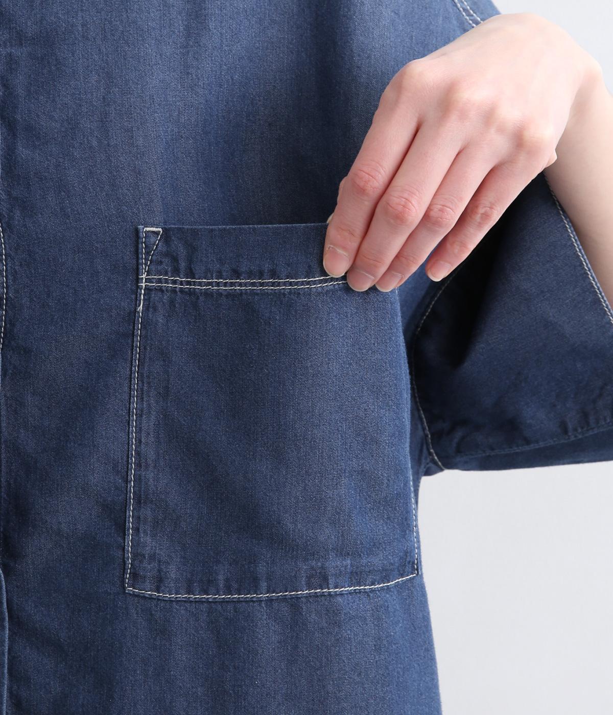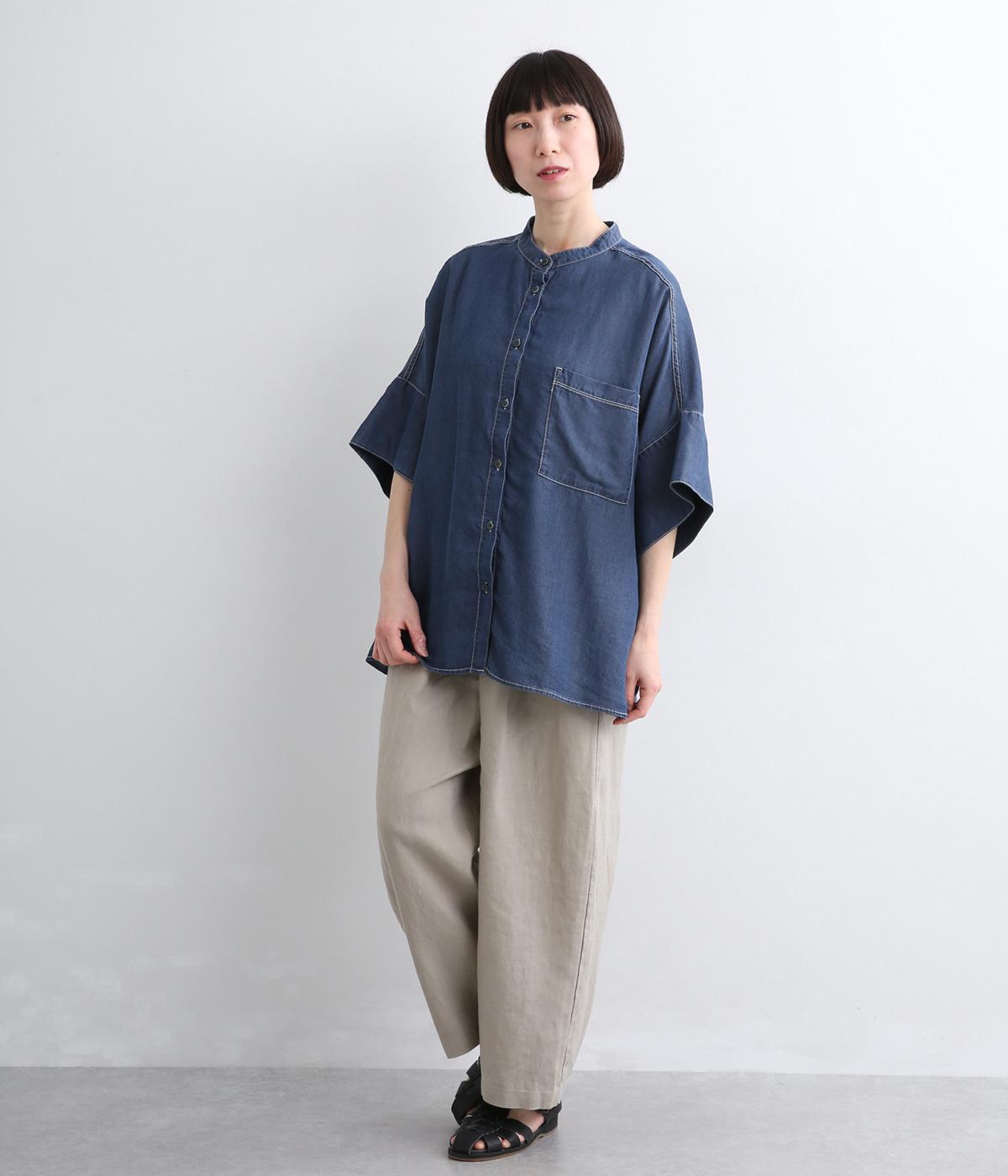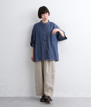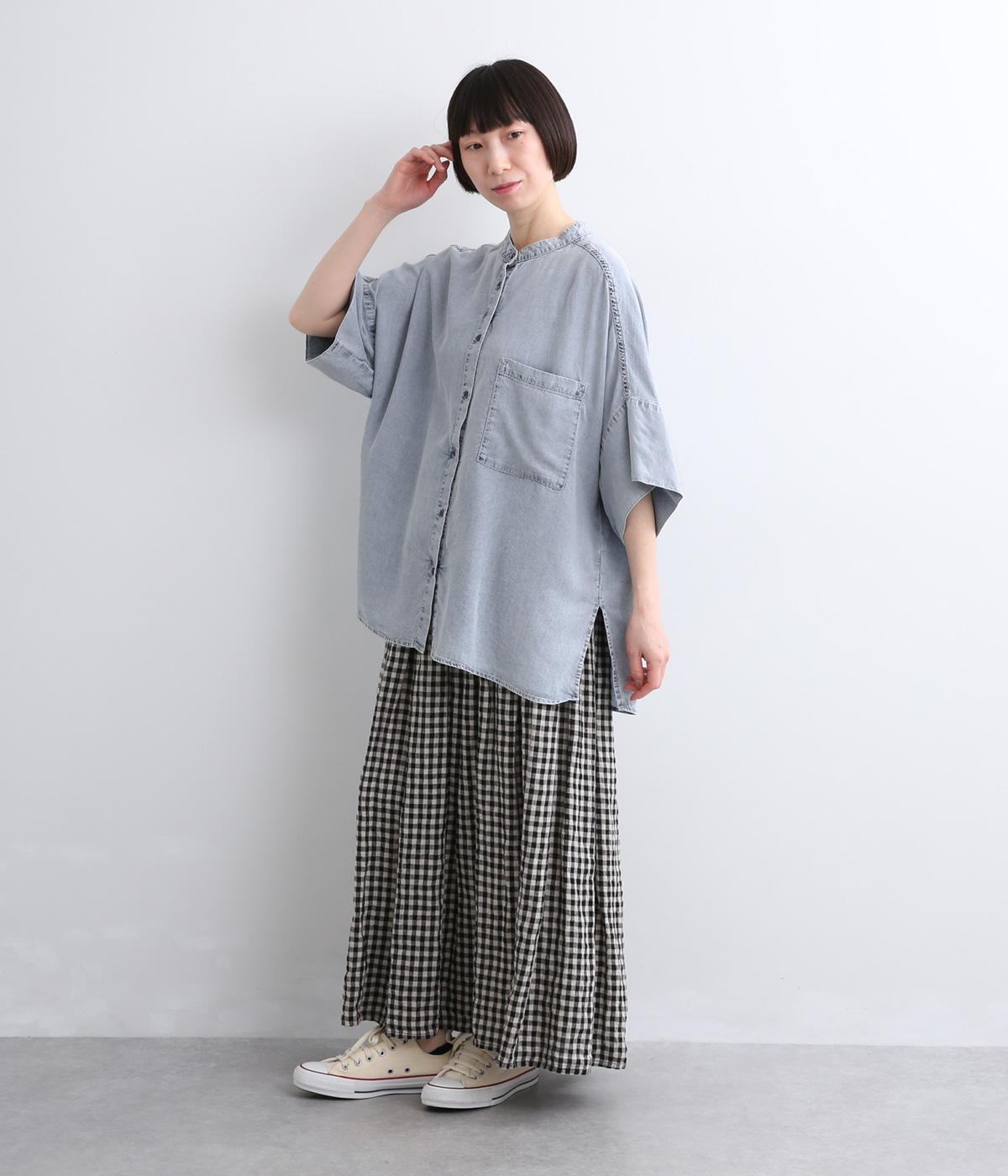 たっぷりと身幅を取ったワイドシルエットの前開きシャツです。羽織りものとしても活躍し、肘まで隠れる袖丈は春から初夏にかけての軽やかな季節にぴったり。大きく前後差をつけた裾がこなれ感を演出します。