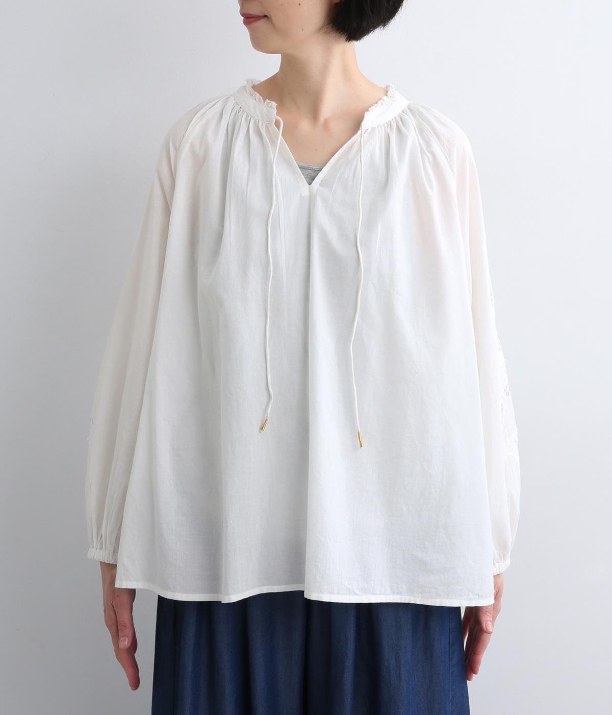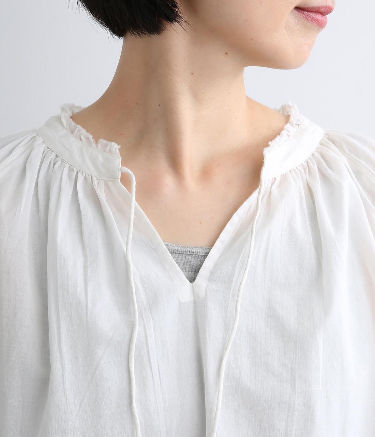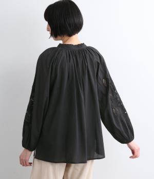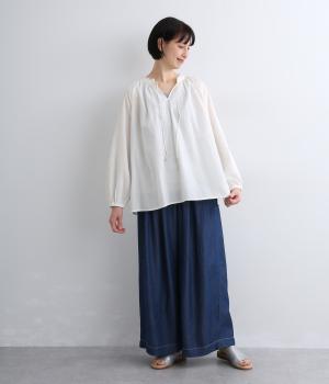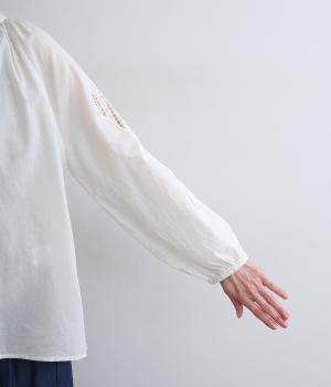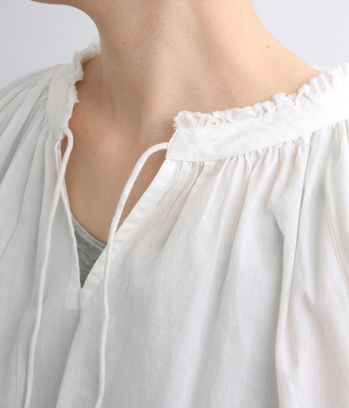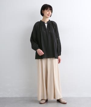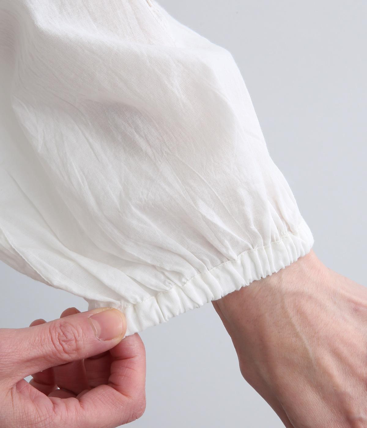 随所にあしらったたっぷりのギャザーと、袖のシフリーデザインがポイントのプルオーバーです。袖口がゴム仕様なので、楽に腕まくりしてボリュームを出すこともできます。首元はすっきりと抜け感のあるデザインで、甘さを抑えているのもポイントです。