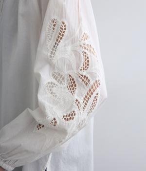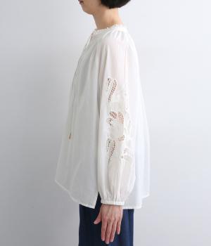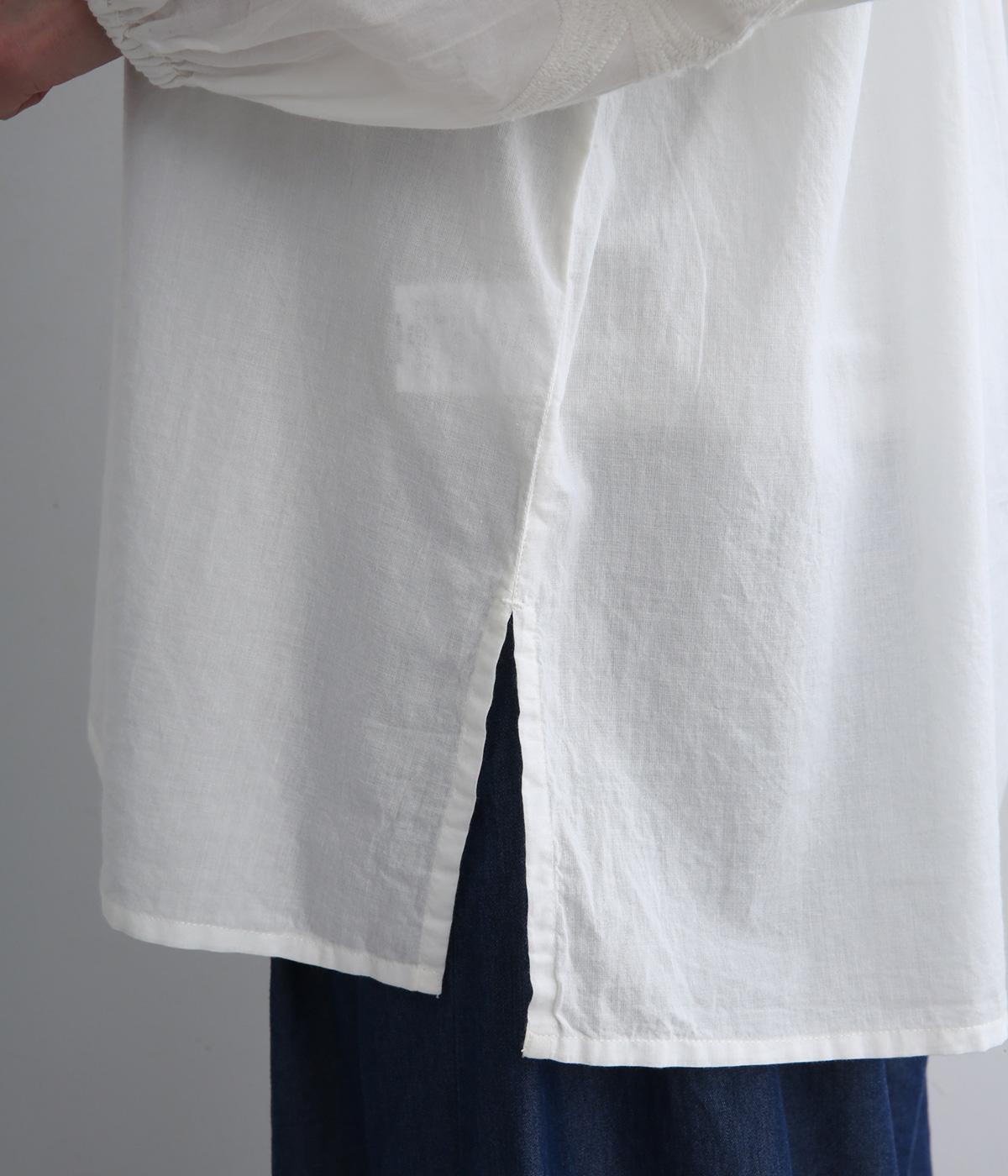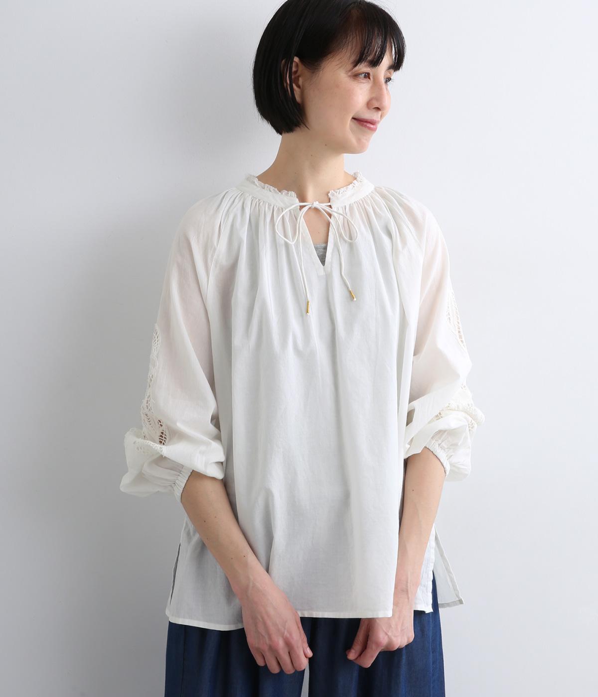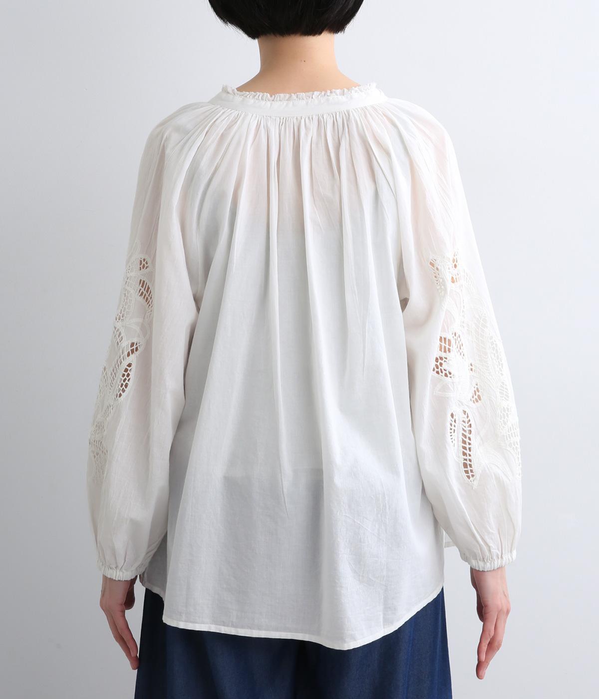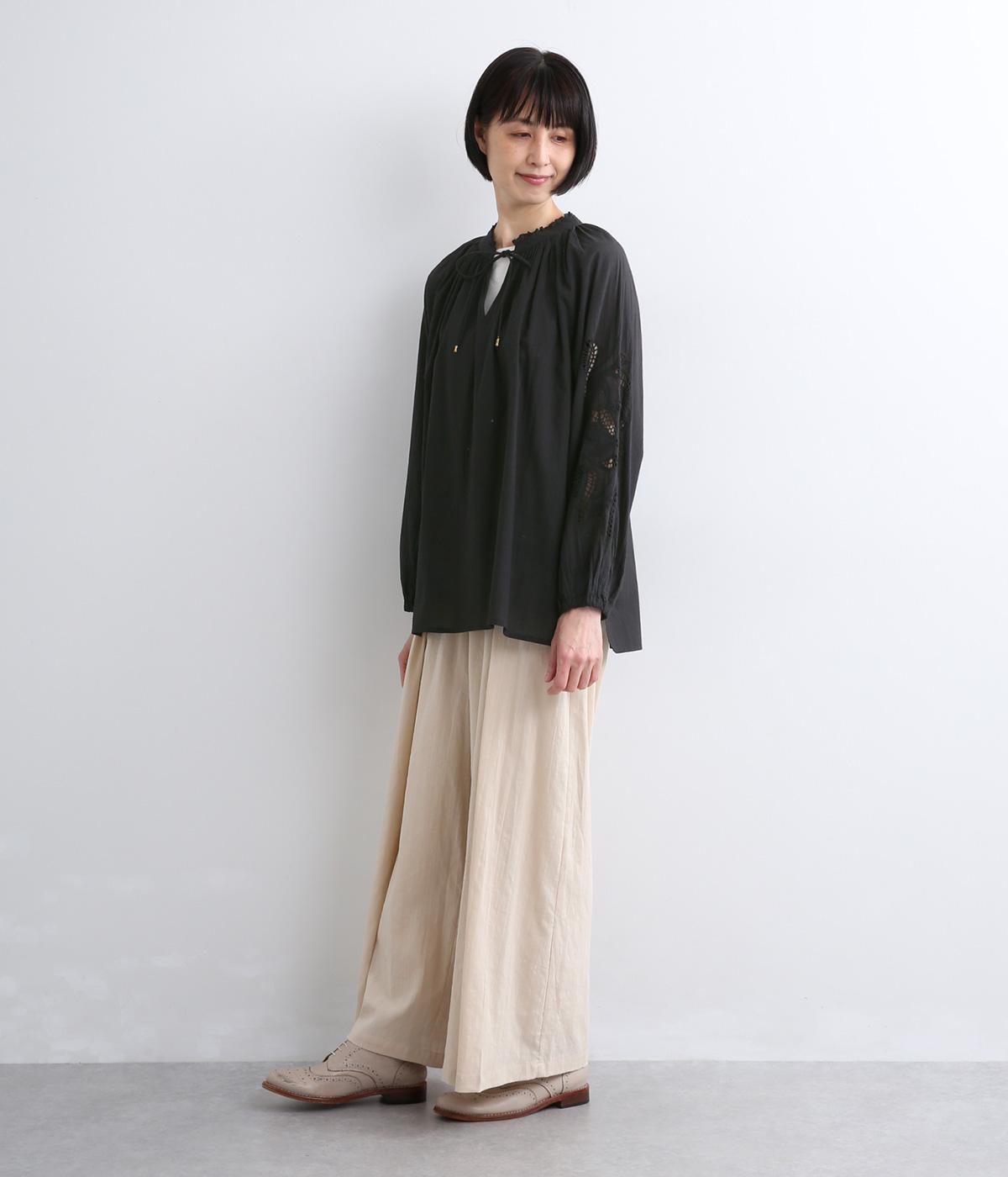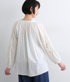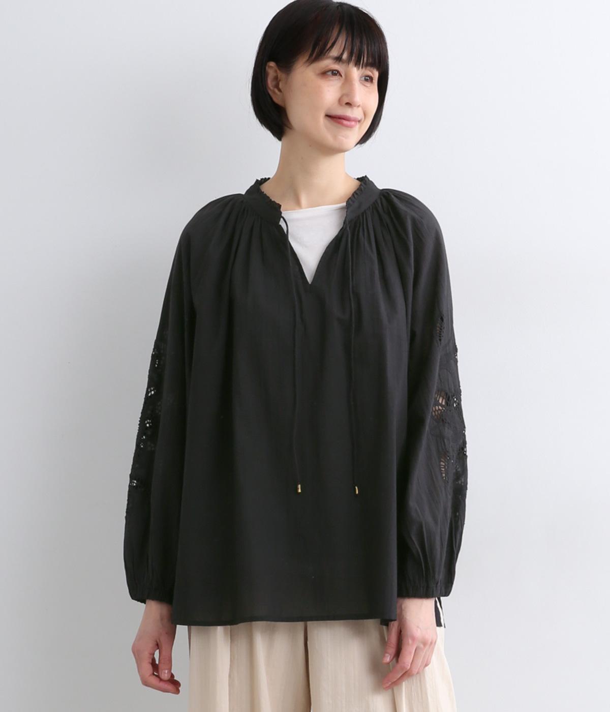 随所にあしらったたっぷりのギャザーと、袖のシフリーデザインがポイントのプルオーバーです。袖口がゴム仕様なので、楽に腕まくりしてボリュームを出すこともできます。首元はすっきりと抜け感のあるデザインで、甘さを抑えているのもポイントです。