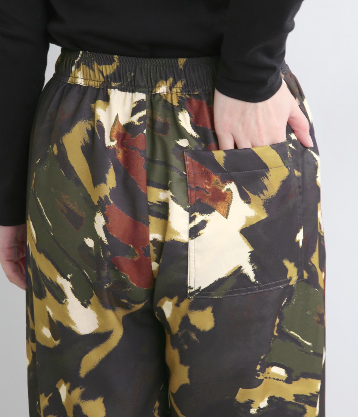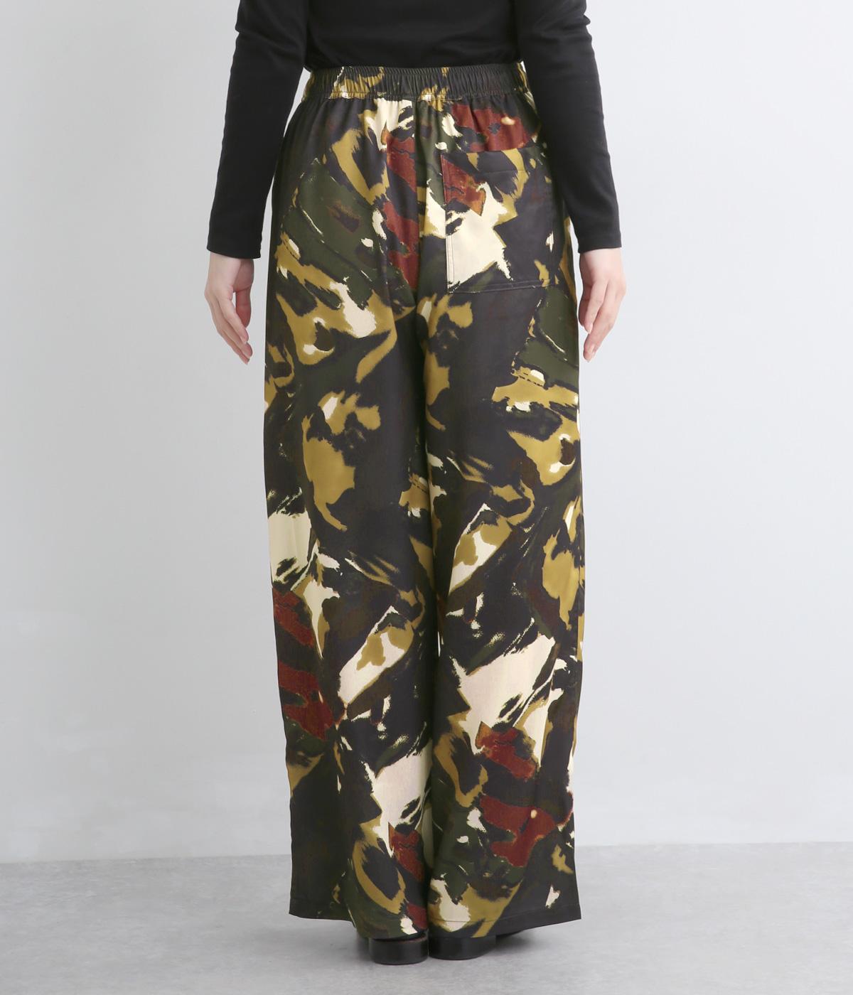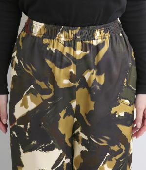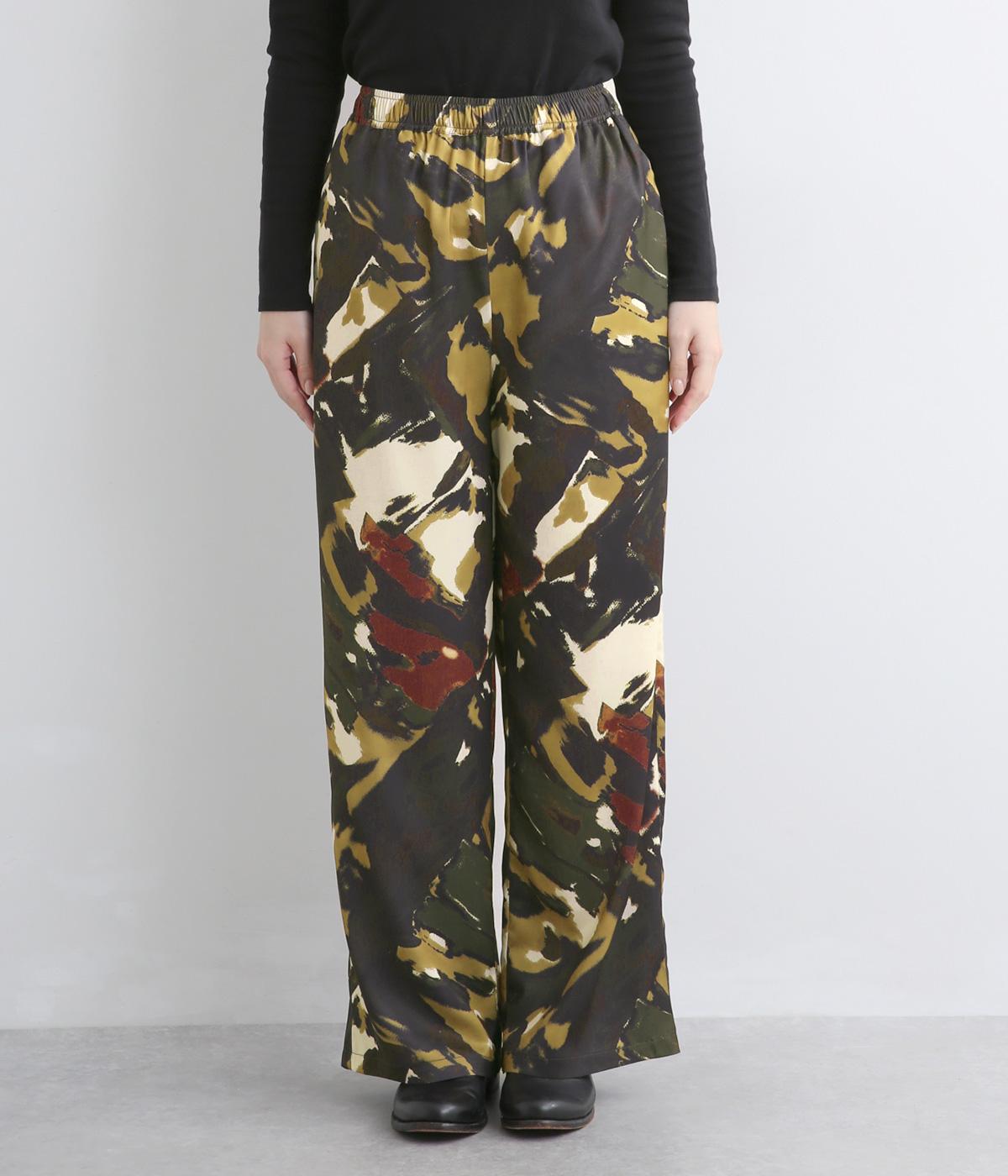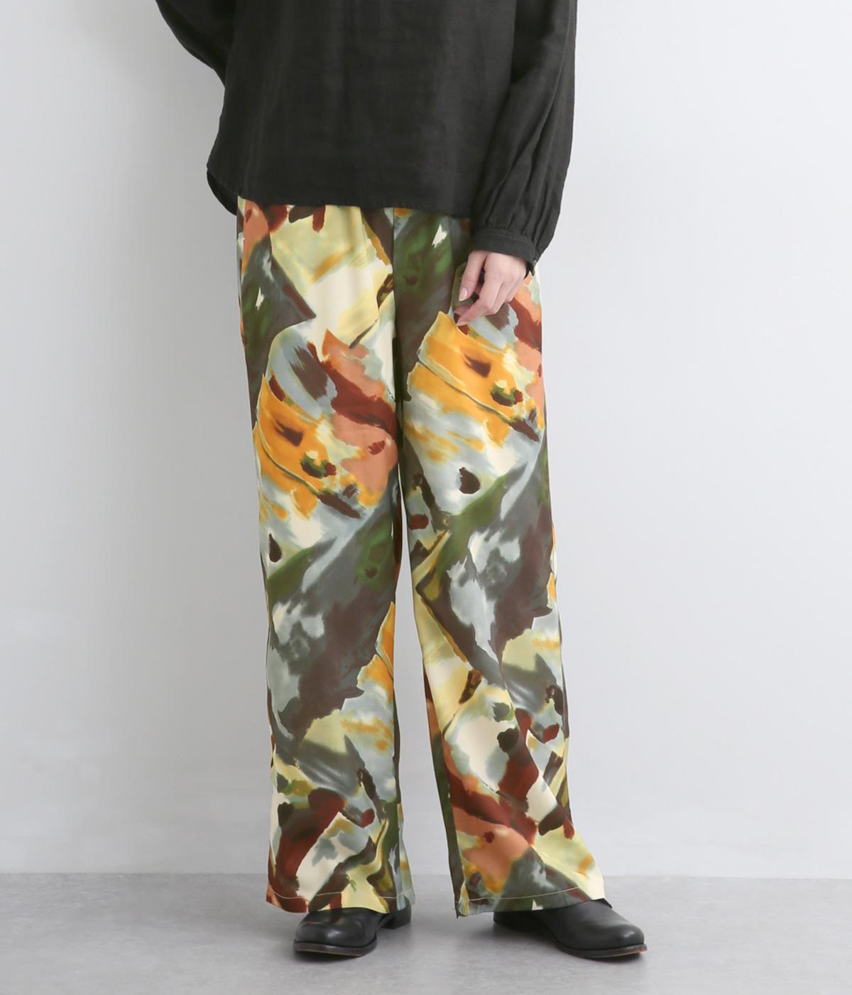筆で描いたようなアブストラクト柄が目をひくワイドパンツ。ロングスカートやワンピースなどとレイヤードしてスタイリングのアクセントにするのもおすすめです。ウエストゴムデザインでストレスフリーな穿き心地です。