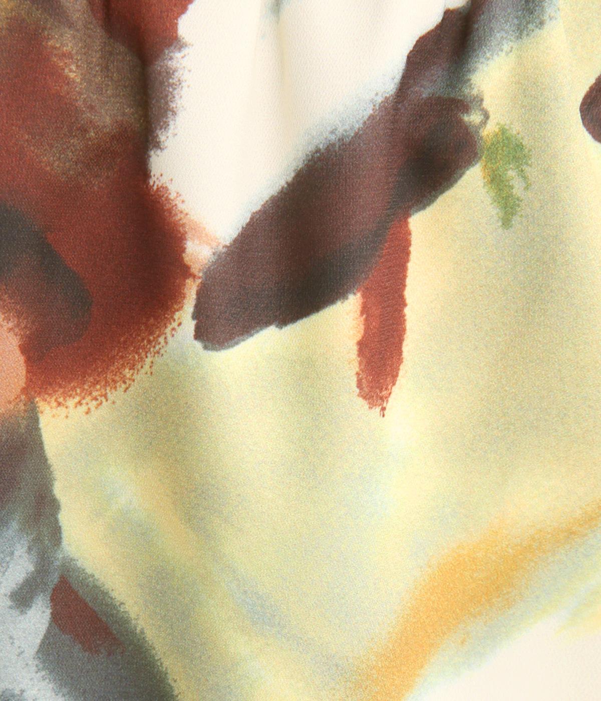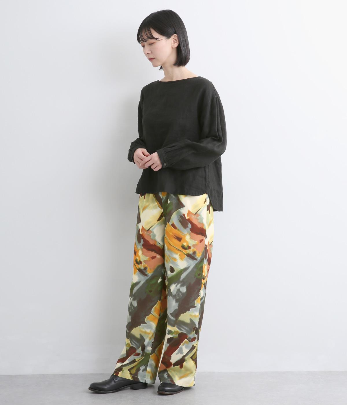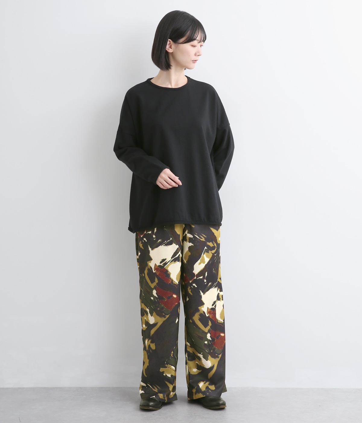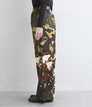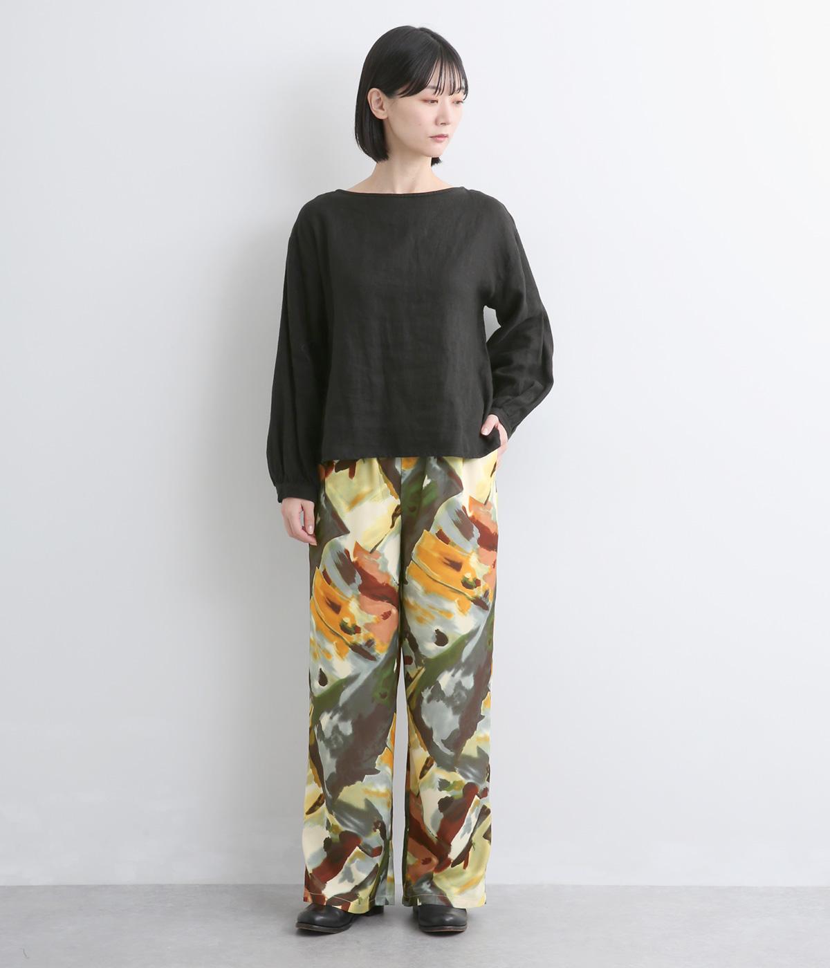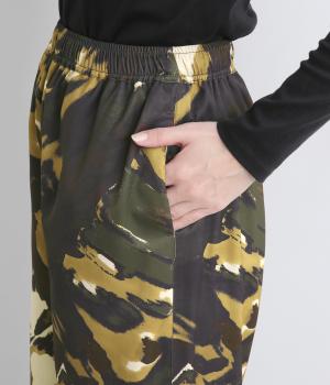 筆で描いたようなアブストラクト柄が目をひくワイドパンツ。ロングスカートやワンピースなどとレイヤードしてスタイリングのアクセントにするのもおすすめです。ウエストゴムデザインでストレスフリーな穿き心地です。