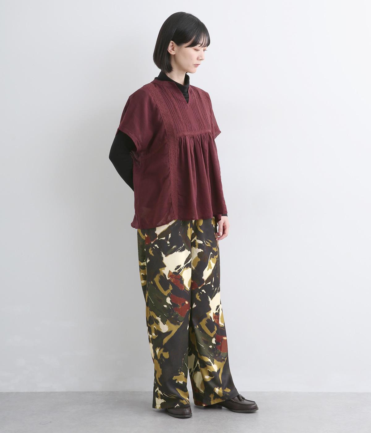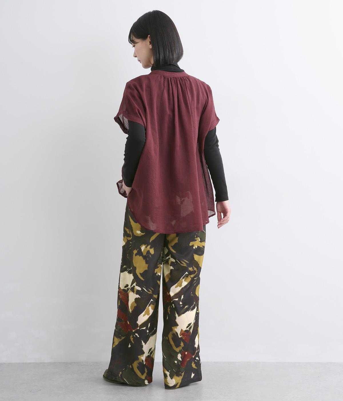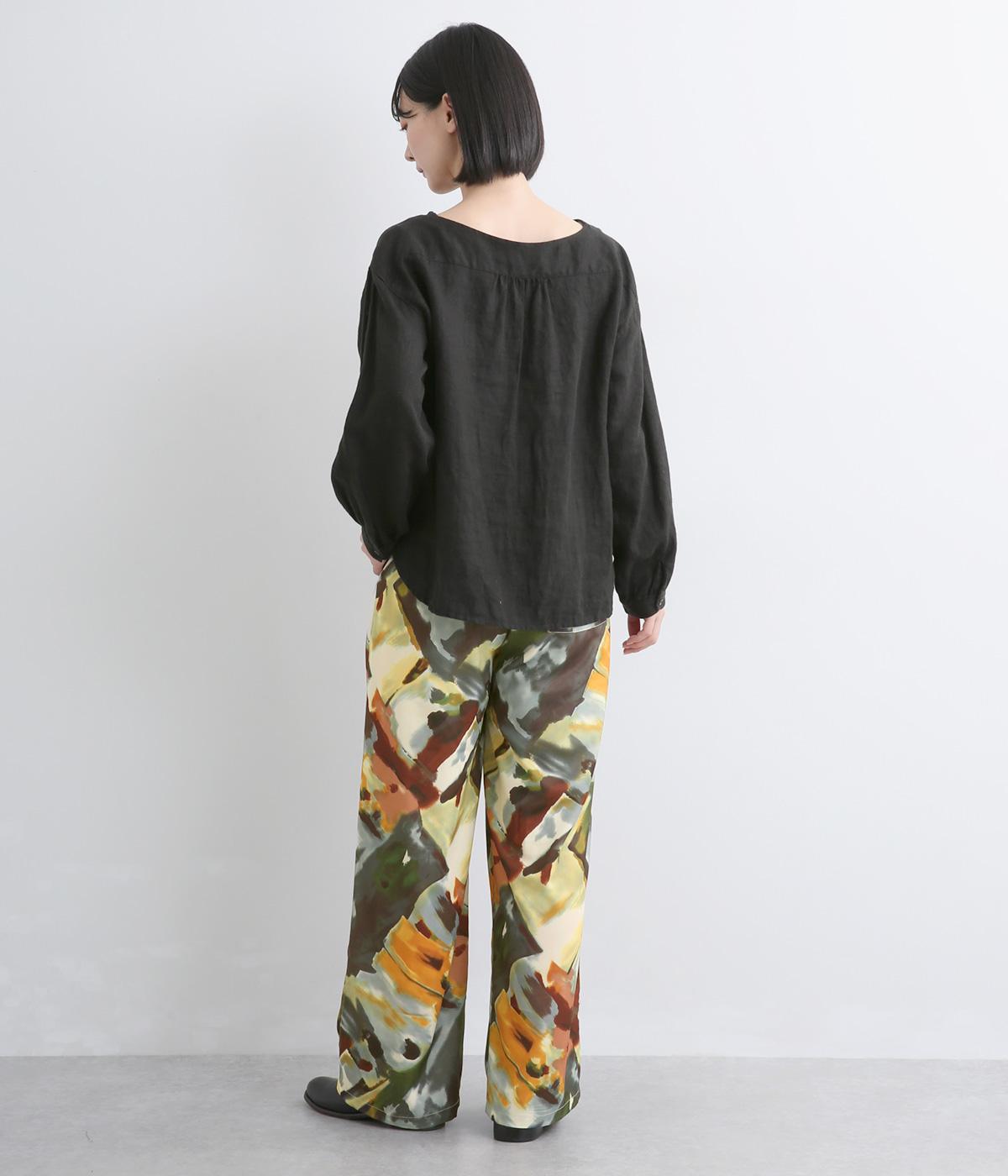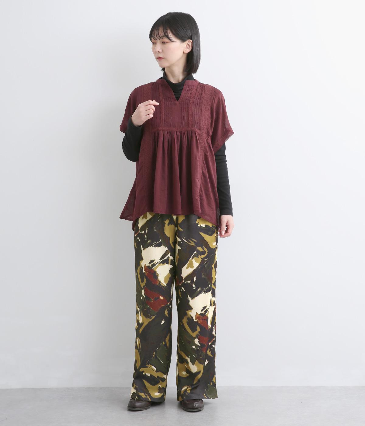 筆で描いたようなアブストラクト柄が目をひくワイドパンツ。ロングスカートやワンピースなどとレイヤードしてスタイリングのアクセントにするのもおすすめです。ウエストゴムデザインでストレスフリーな穿き心地です。