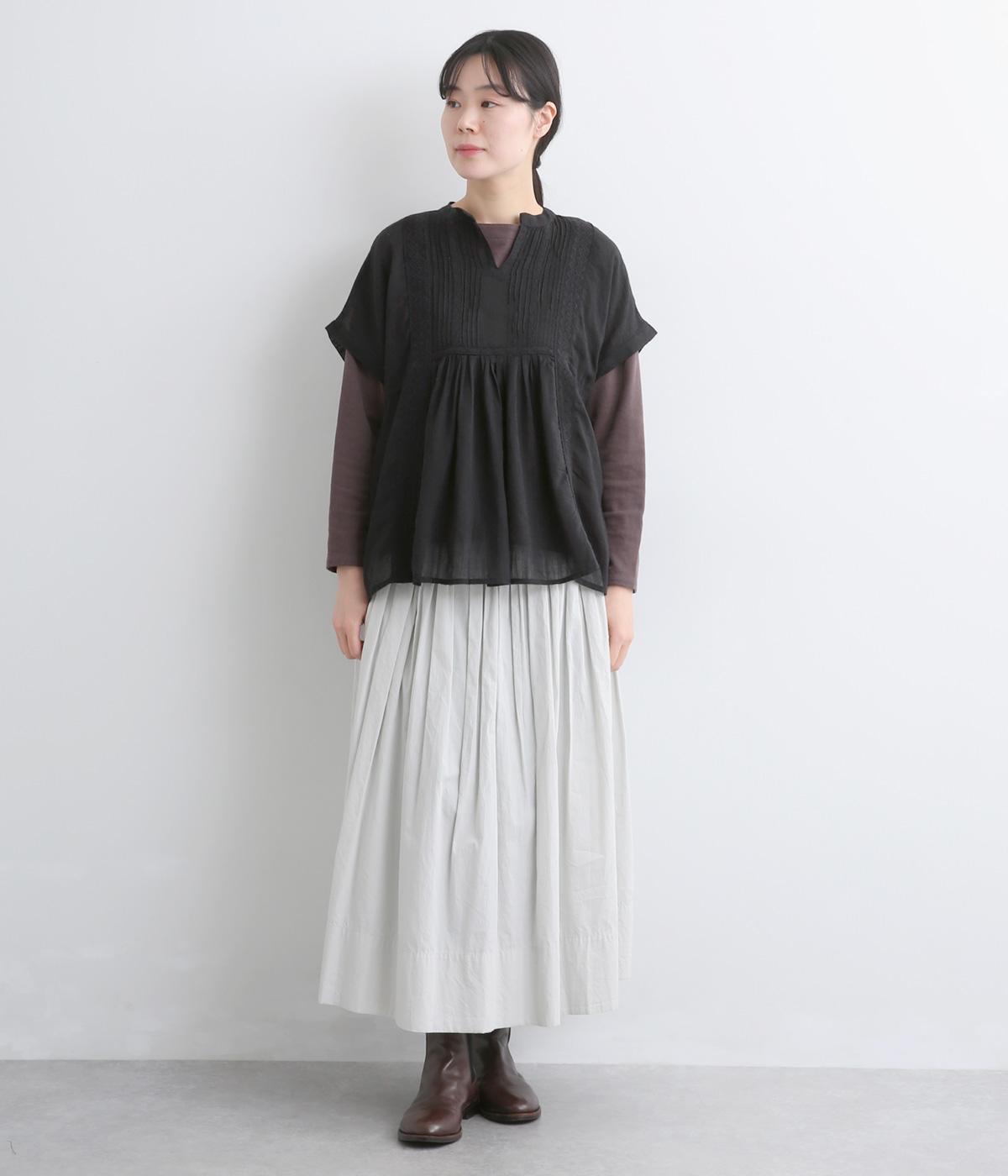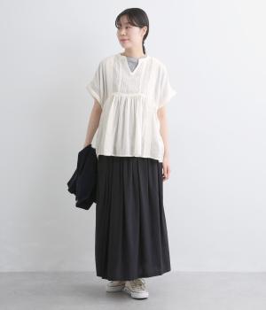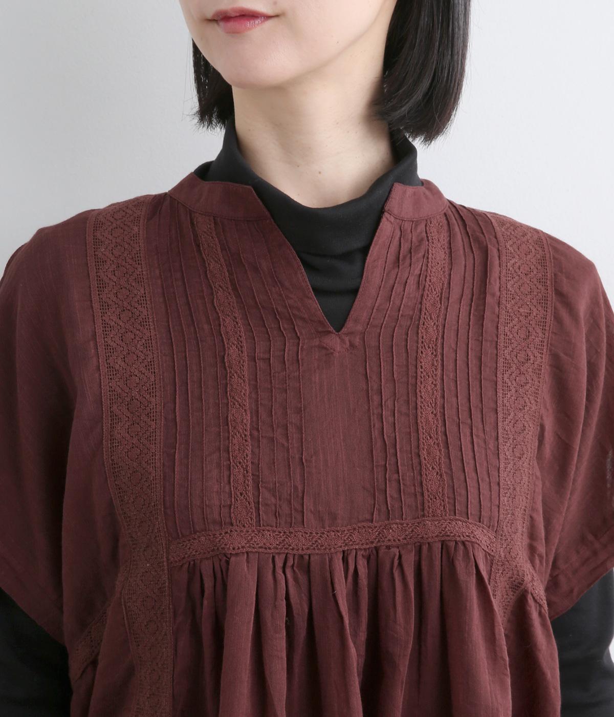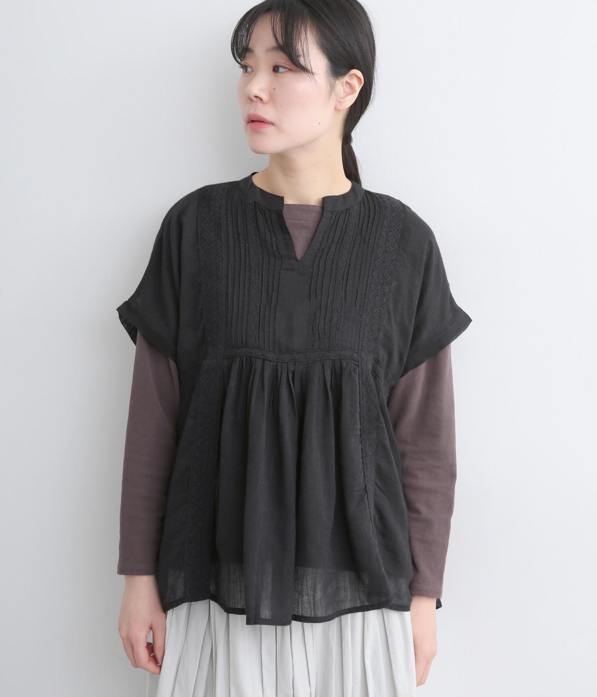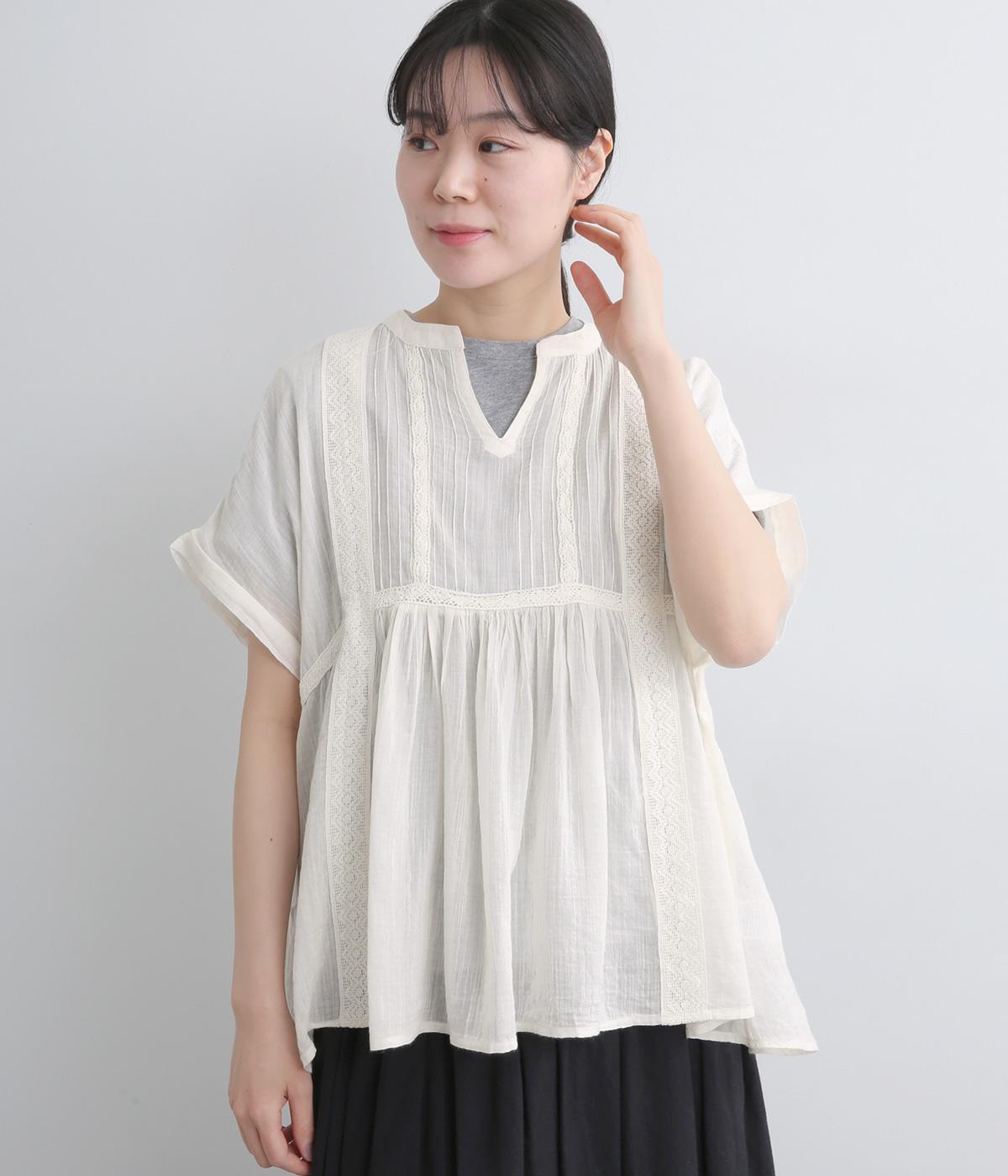 ピンタックとレースが華やかさを演出するプルオーバー。スキッパー開きの首元でさらに抜け感をプラスしました。暑い季節はもちろん、タートルニットなどとも好相性で、シーズン問わず着まわせる一枚です。