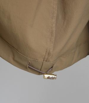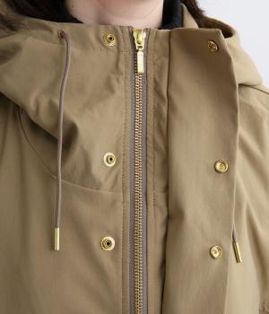 飽きのこないベーシックなデザインが魅力のフードブルゾンです。裾は絞れるドローコード入りで、ダブルジップなのであわせるボトムとバランスを取りやすくしています。ゴールドの金具が華やかさをプラス。