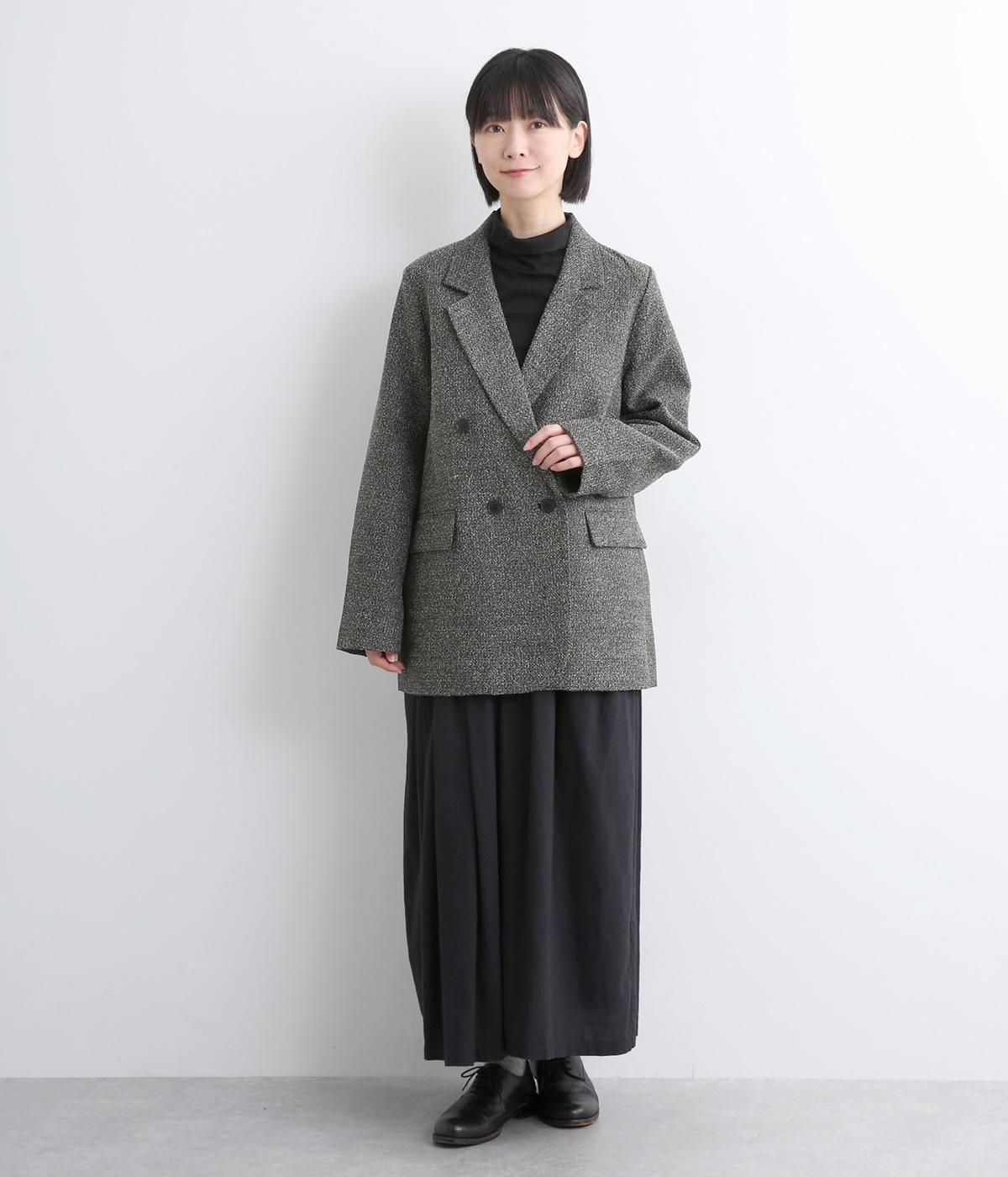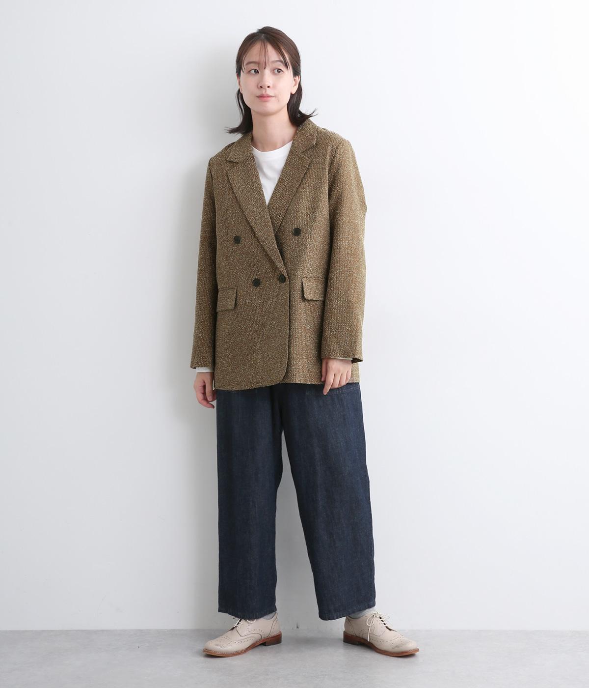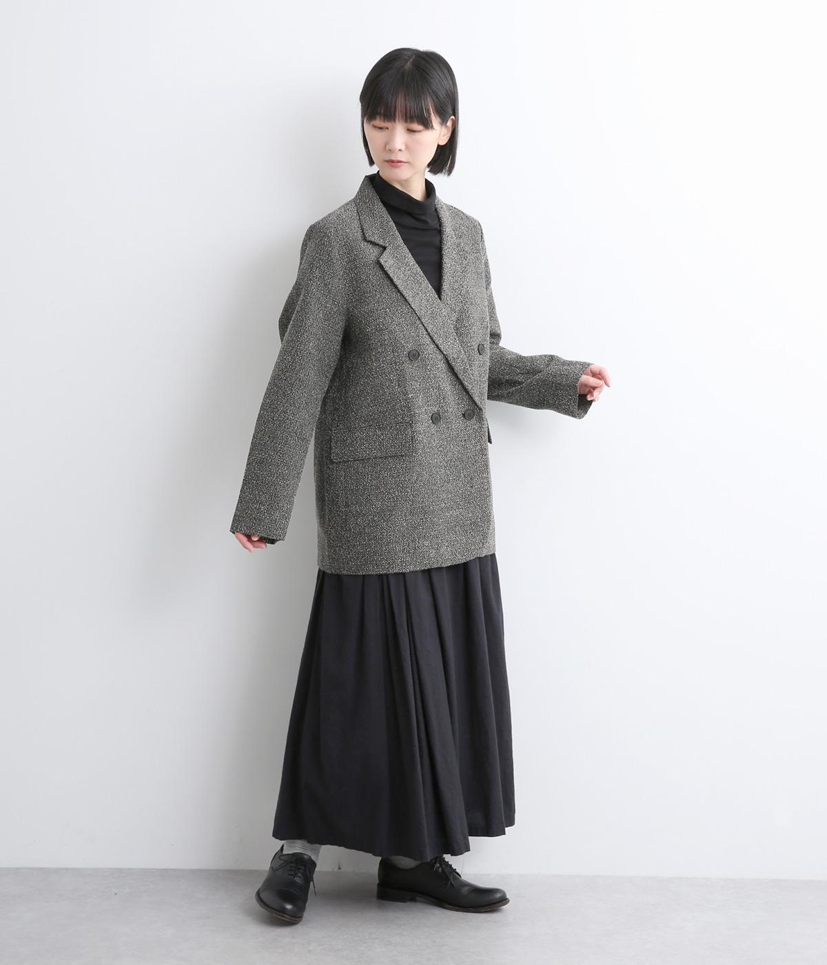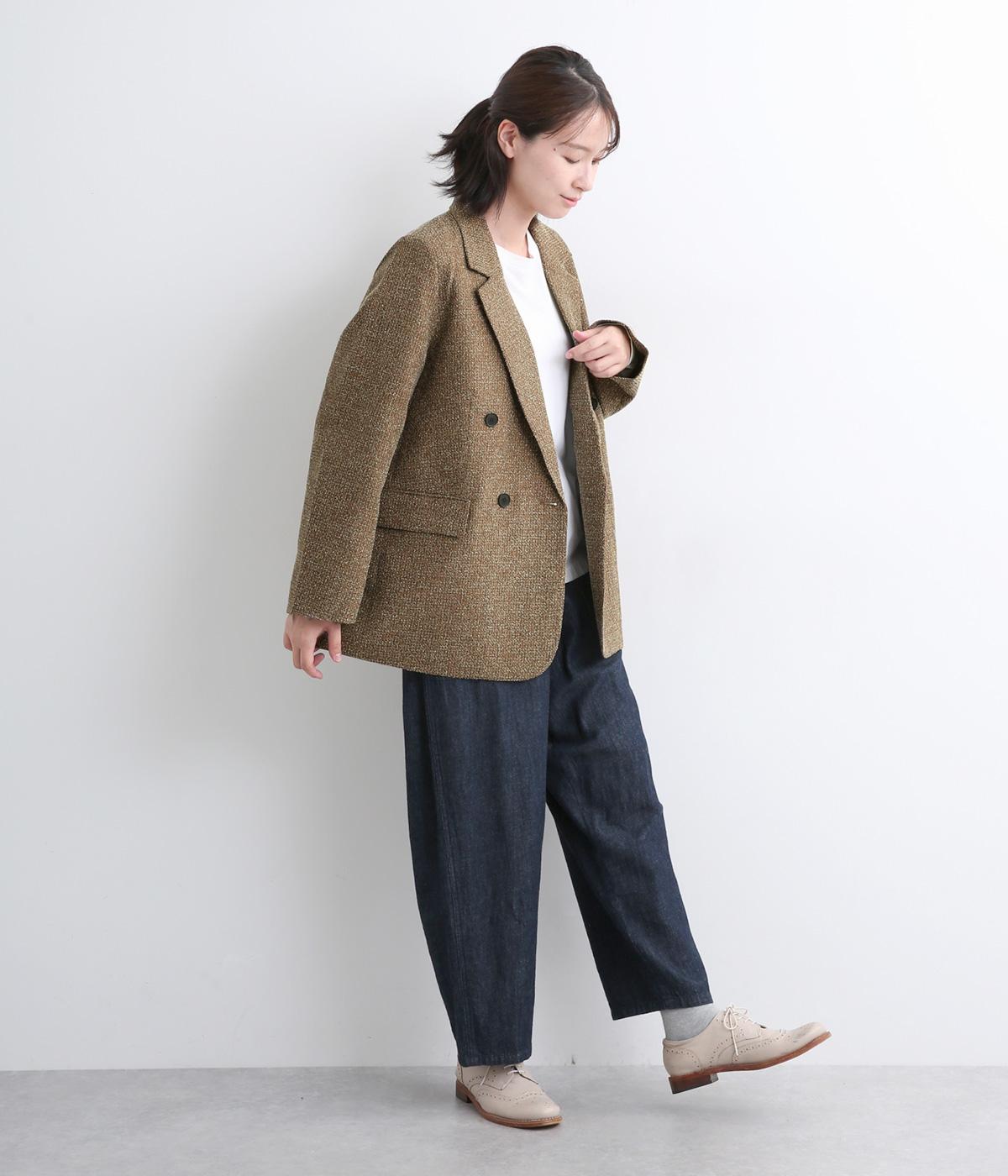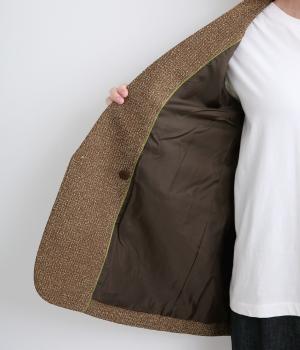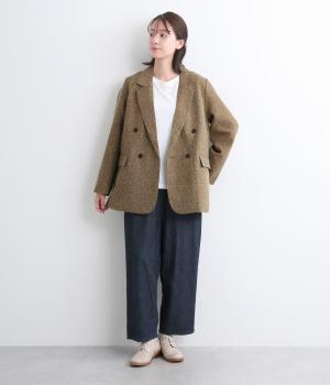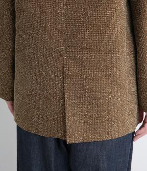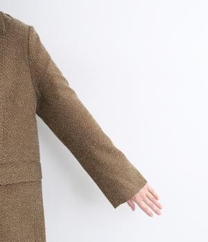 表地はポリエステル、レーヨン。裏地はポリエステル。糸の繊維が絡んでできる不規則な節が入った生地が特徴で、素朴でカジュアル、あたたかみのある印象を与えてくれます。
