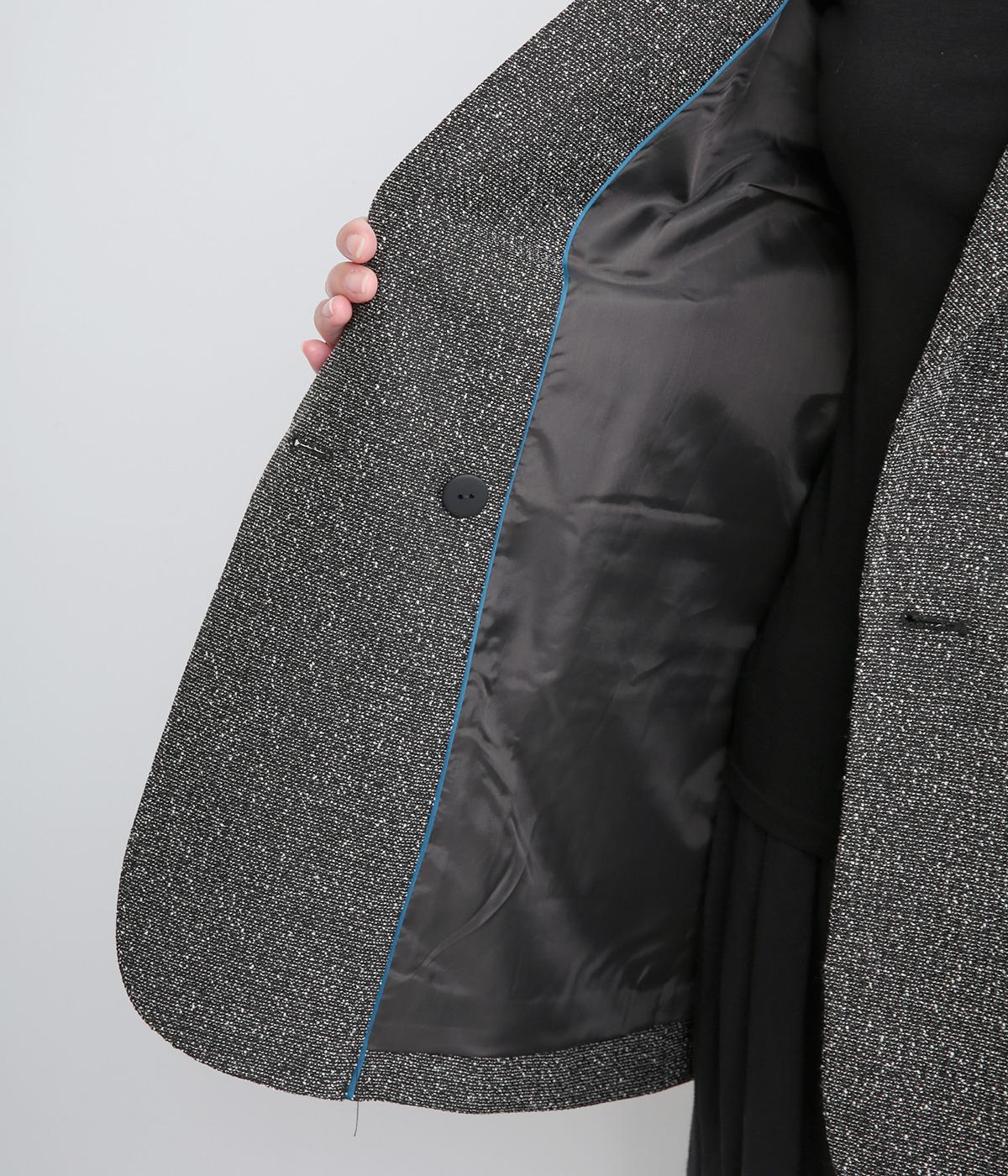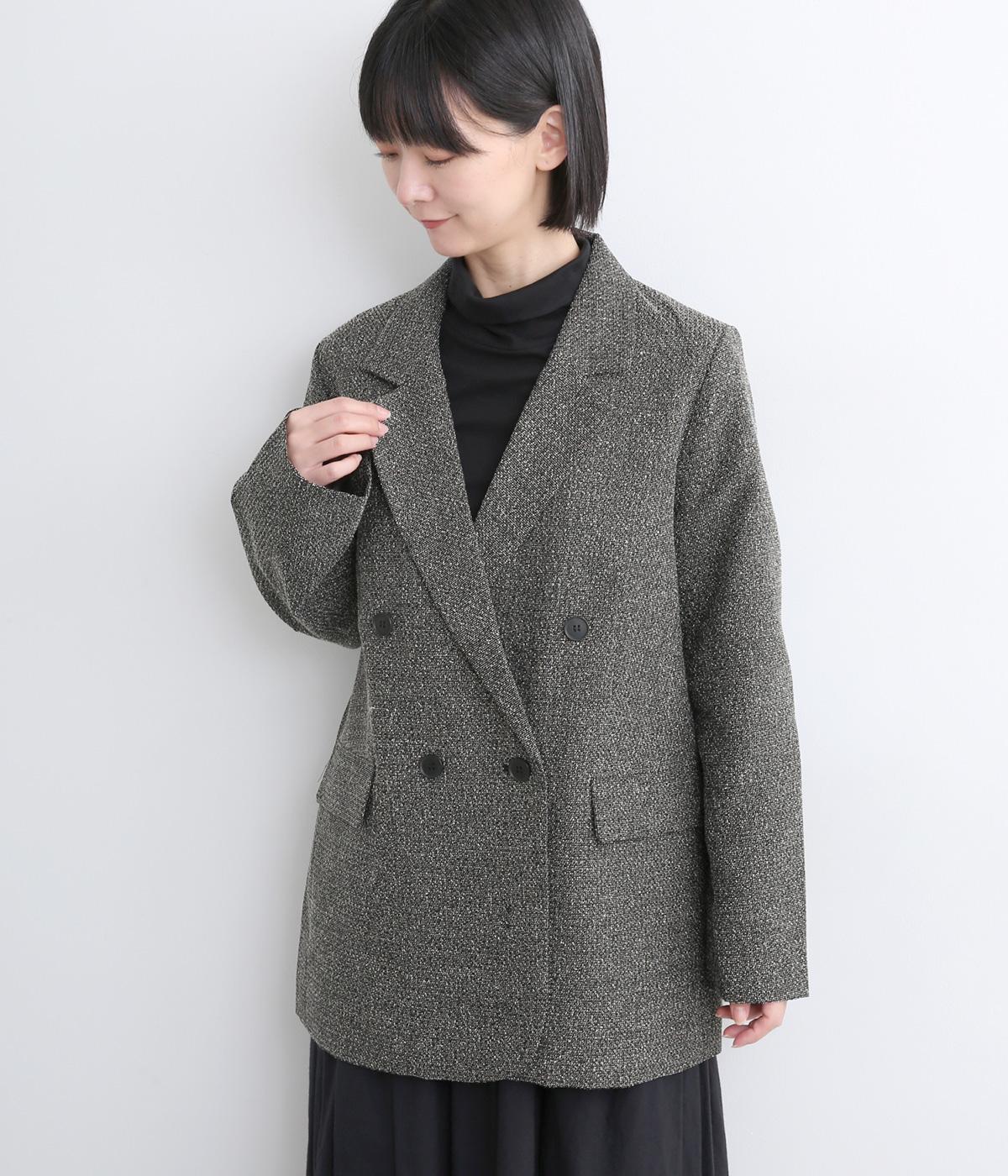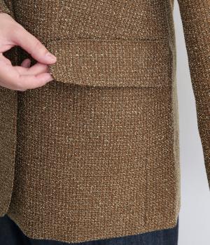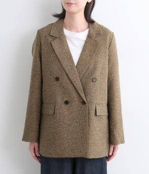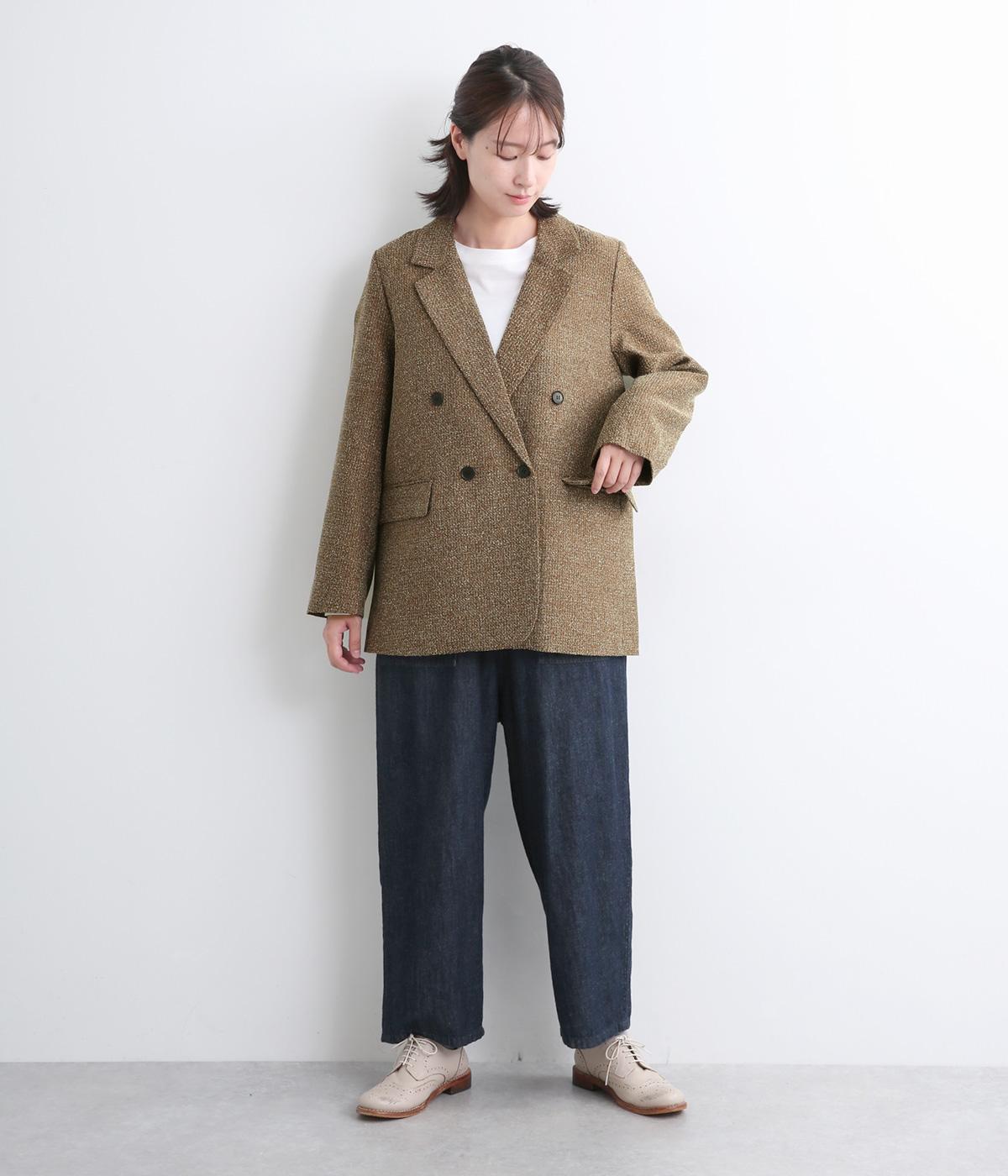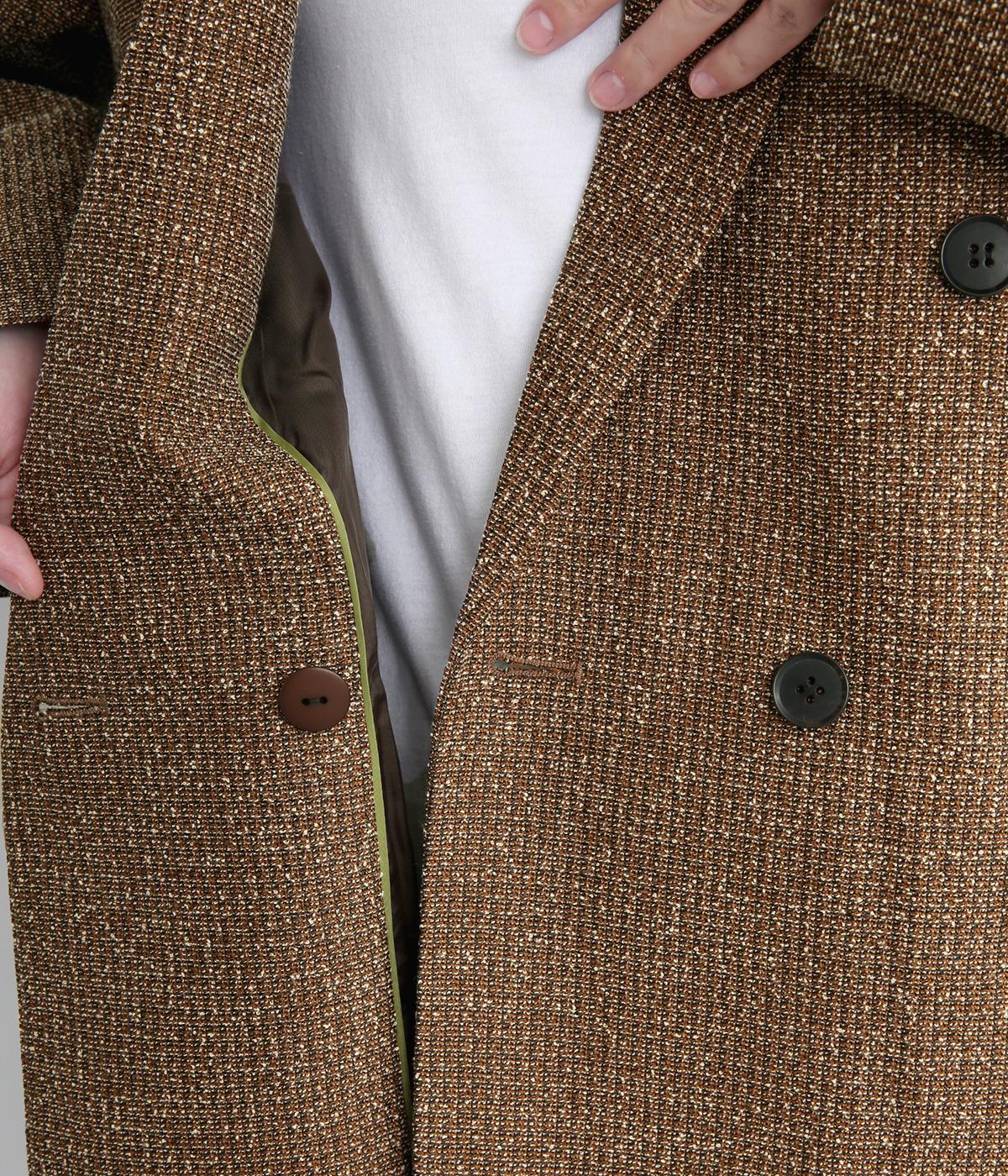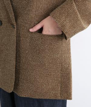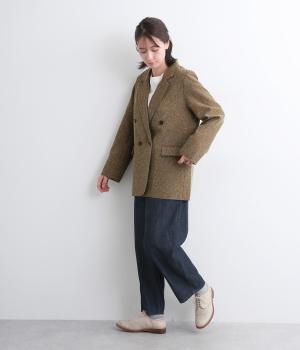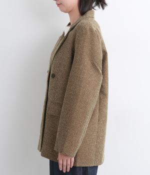 表地はポリエステル、レーヨン。裏地はポリエステル。糸の繊維が絡んでできる不規則な節が入った生地が特徴で、素朴でカジュアル、あたたかみのある印象を与えてくれます。