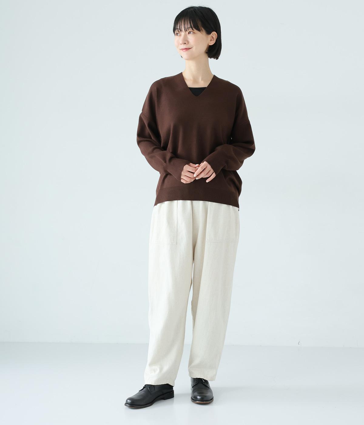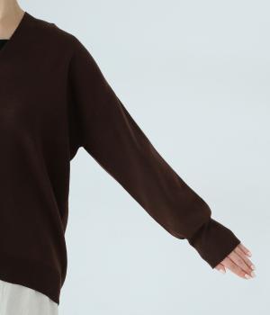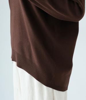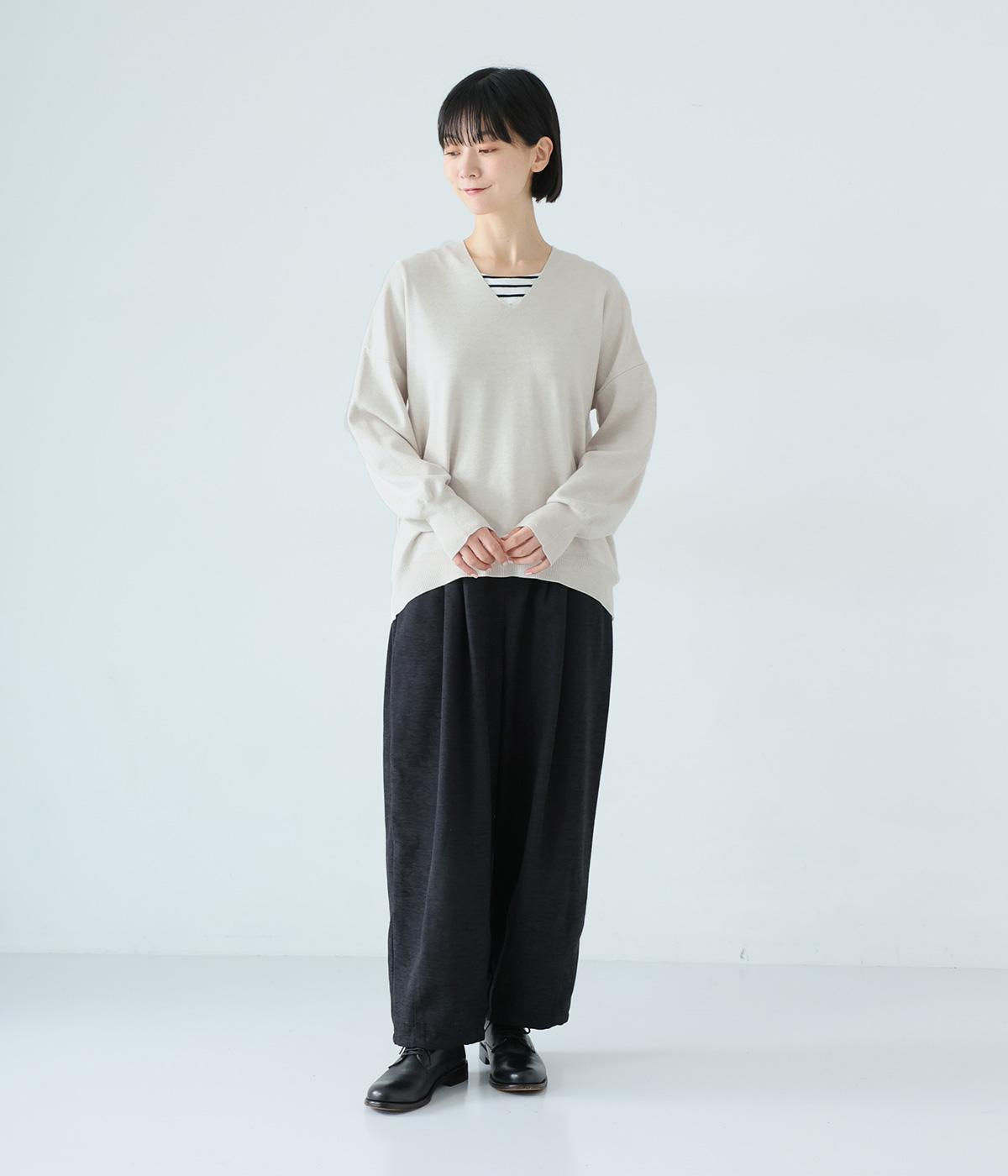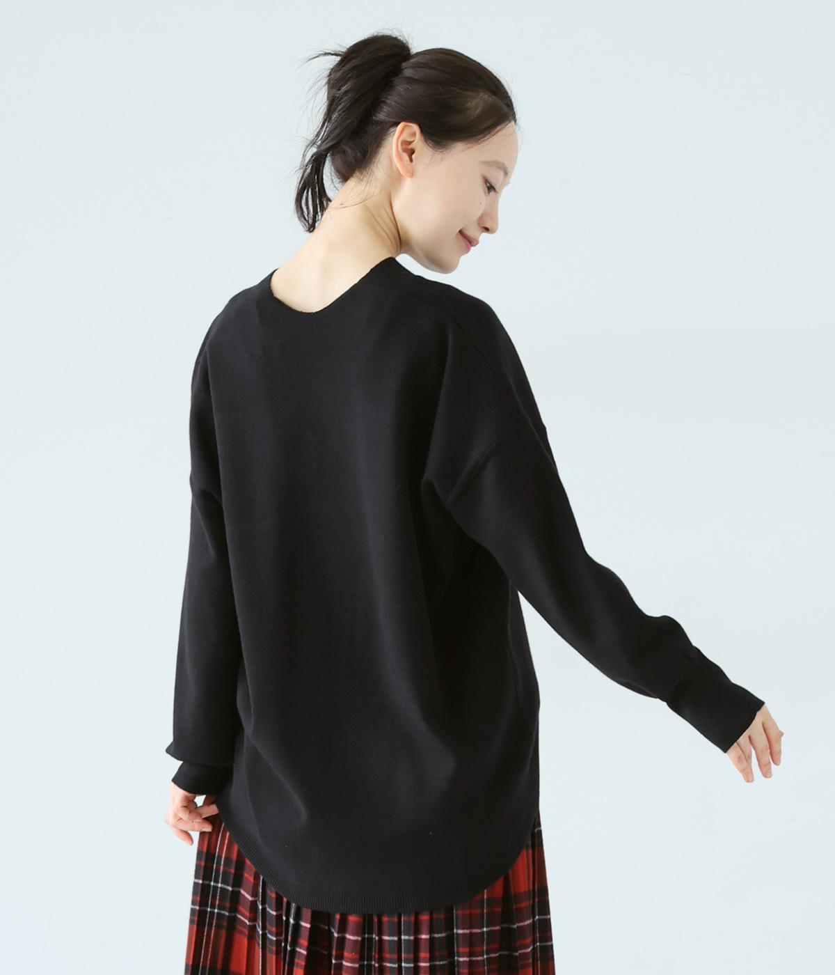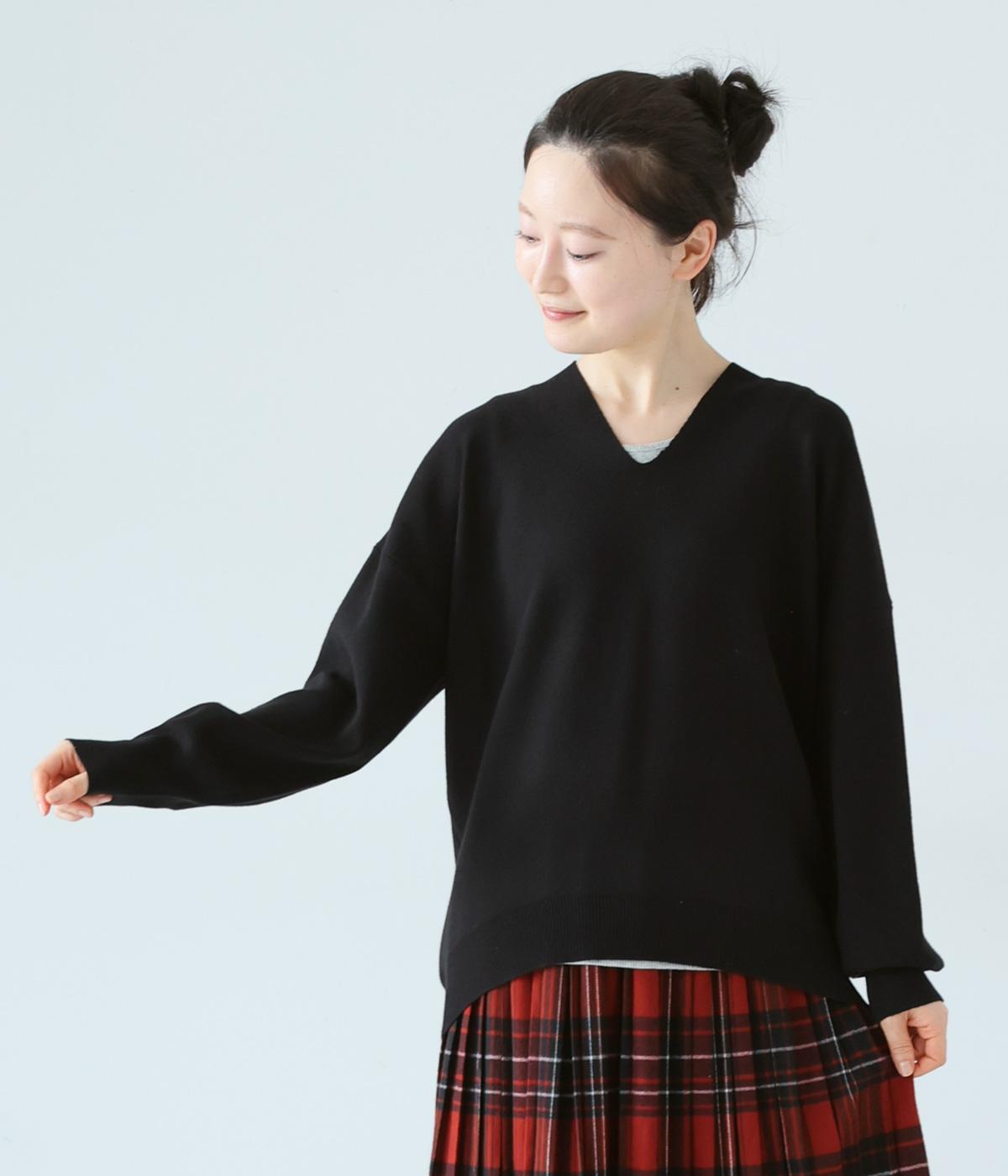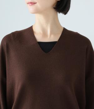 こなれたムード漂うドロップショルダーニット。ヒップを隠してくれる、緩やかに曲線を描くヘムラインがポイントです。抜け感のあるVネックは顔まわりをすっきりと演出。さまざまなボトムスと合わせやすく、オンオフ問わずに活躍します。