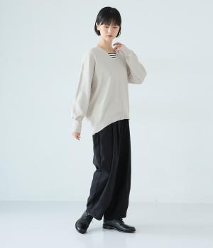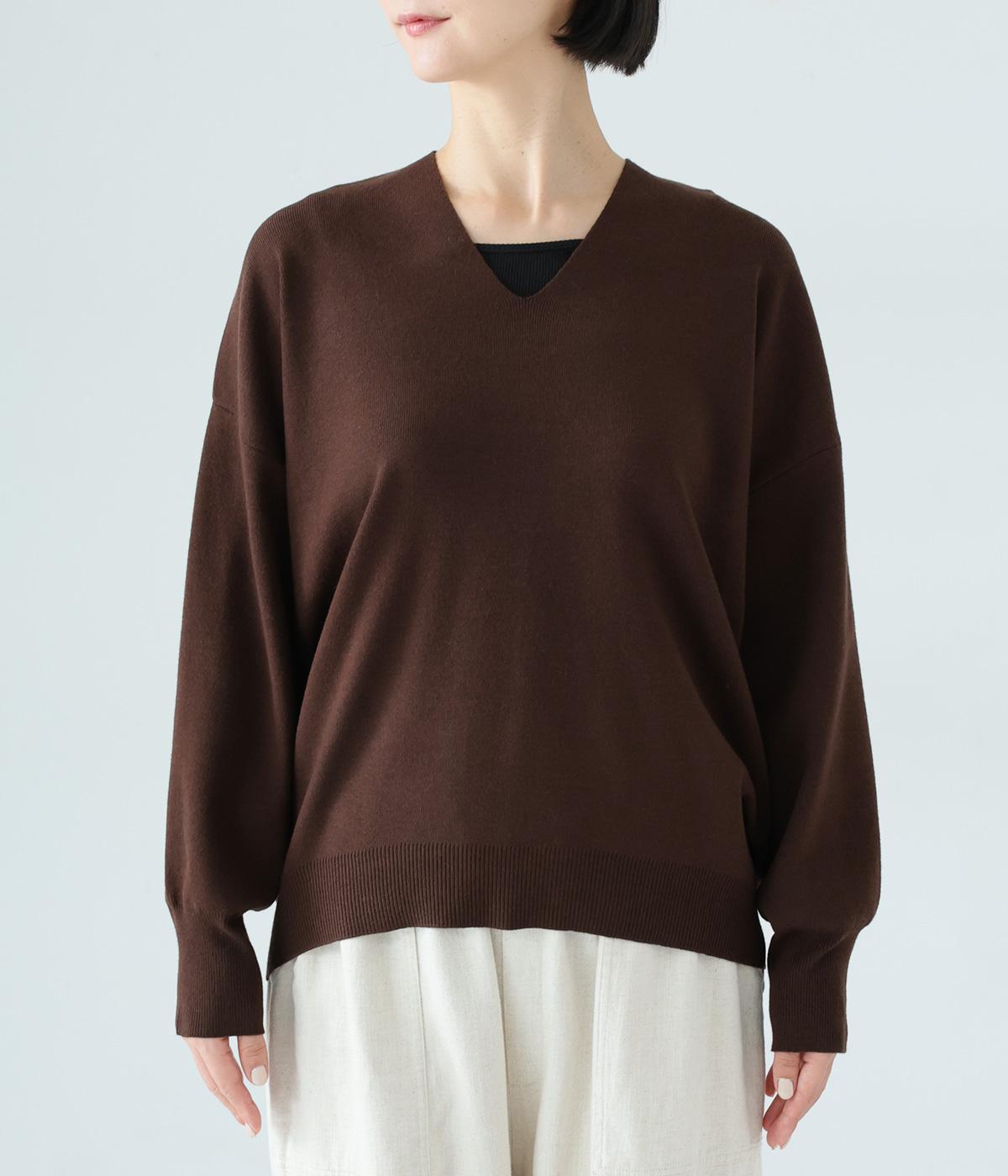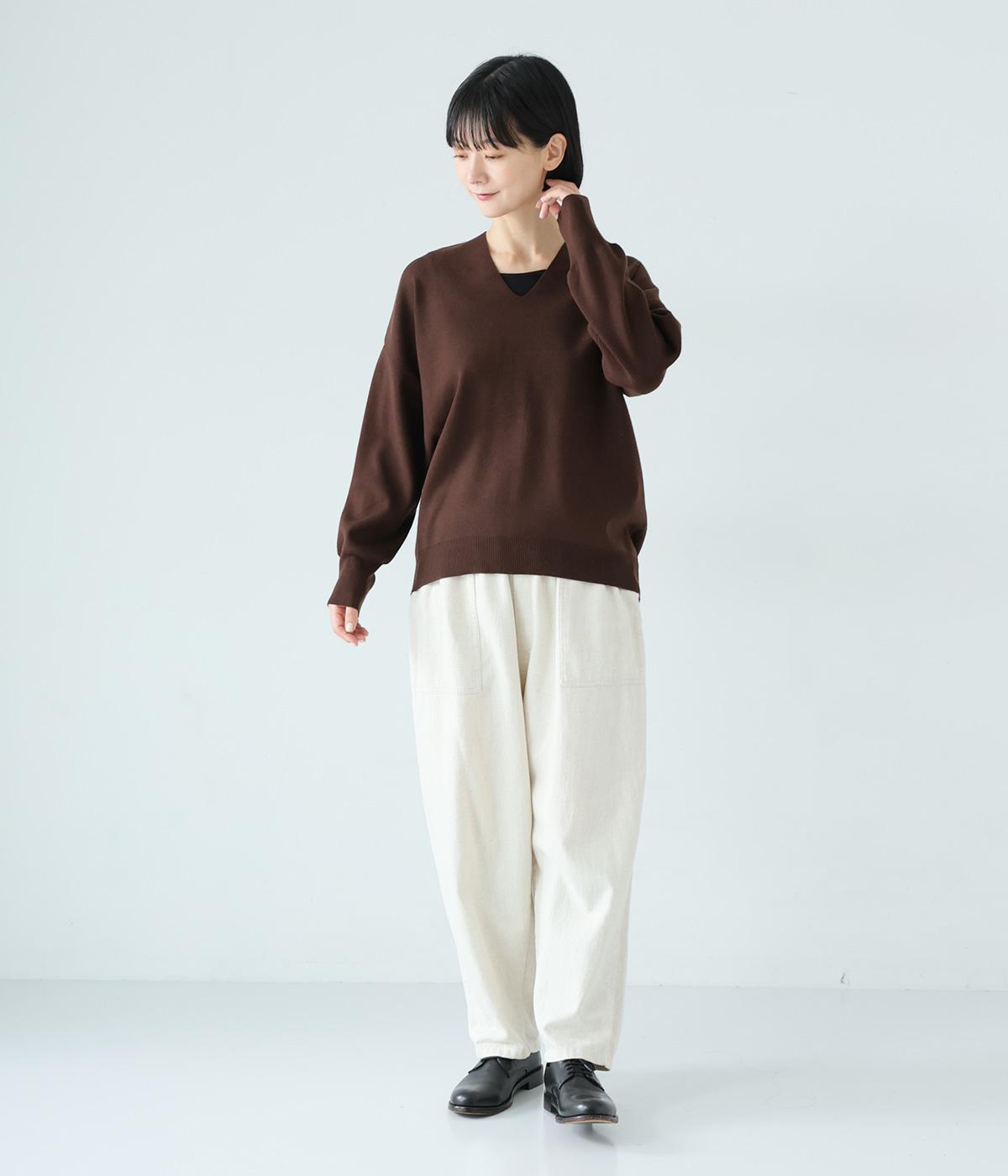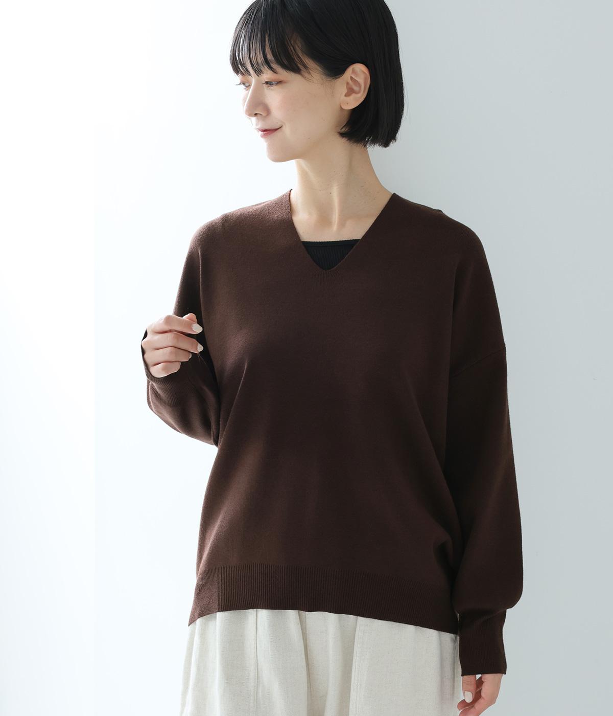 こなれたムード漂うドロップショルダーニット。ヒップを隠してくれる、緩やかに曲線を描くヘムラインがポイントです。抜け感のあるVネックは顔まわりをすっきりと演出。さまざまなボトムスと合わせやすく、オンオフ問わずに活躍します。