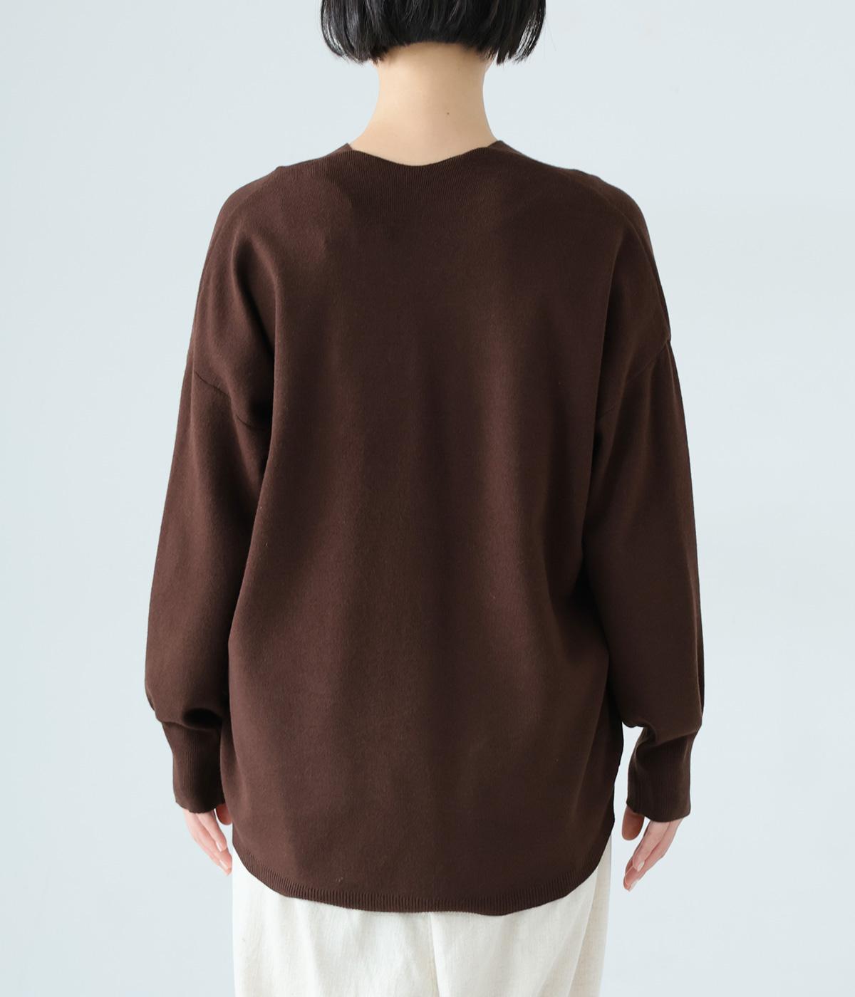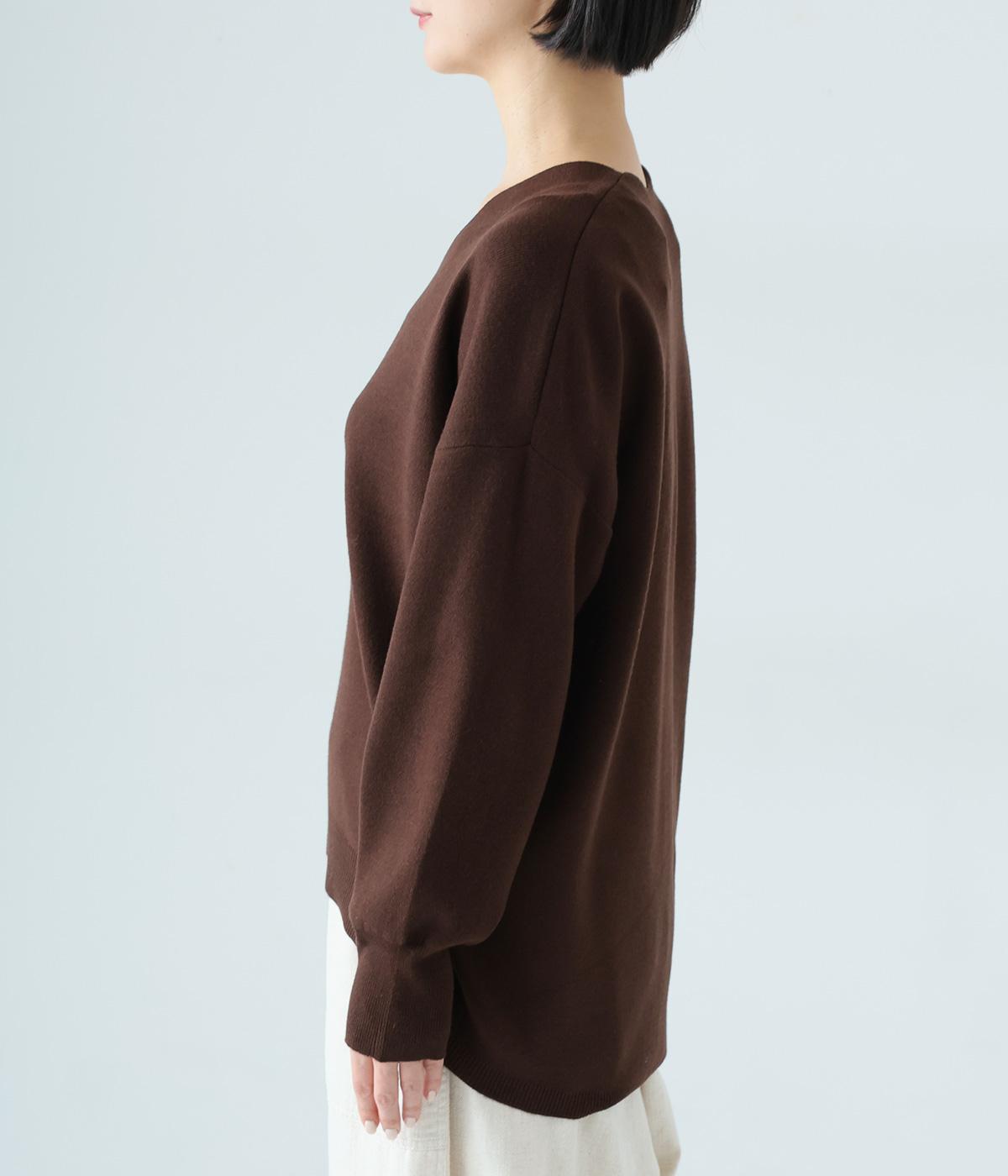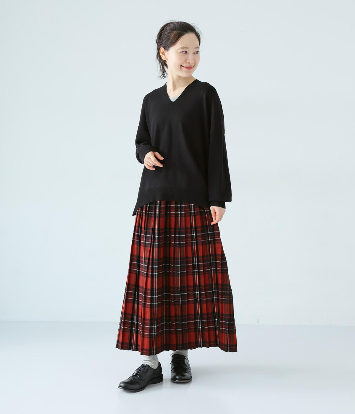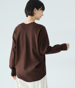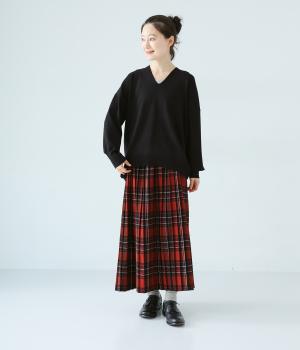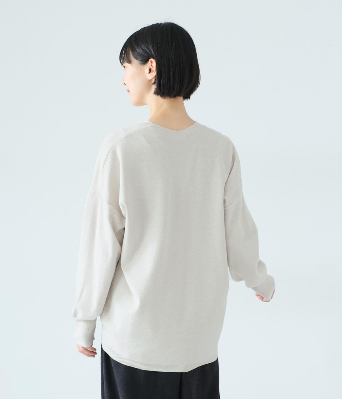 こなれたムード漂うドロップショルダーニット。ヒップを隠してくれる、緩やかに曲線を描くヘムラインがポイントです。抜け感のあるVネックは顔まわりをすっきりと演出。さまざまなボトムスと合わせやすく、オンオフ問わずに活躍します。