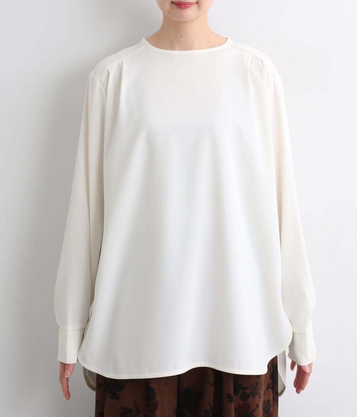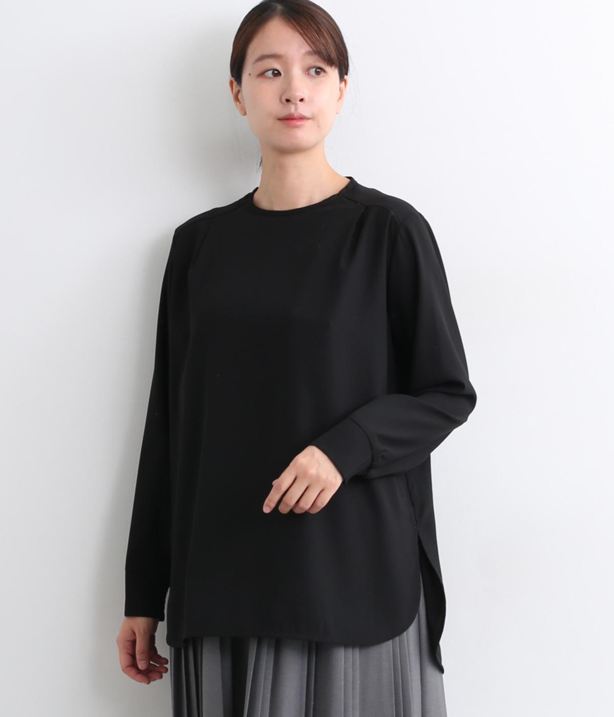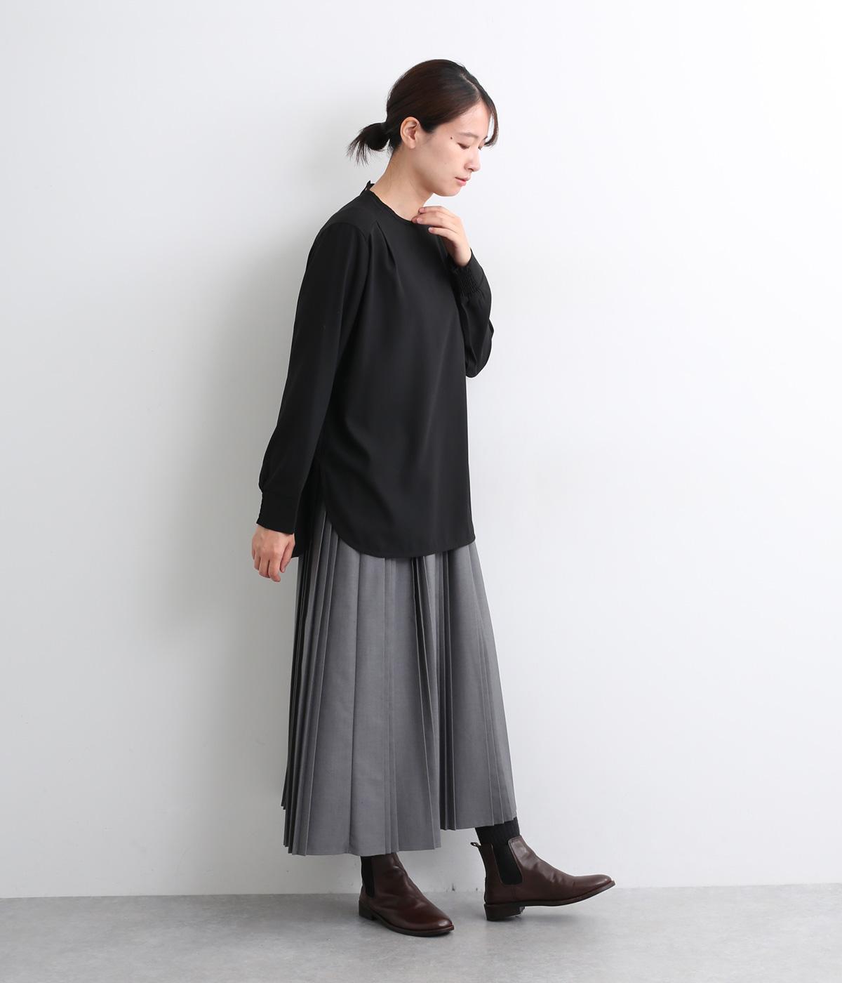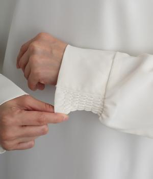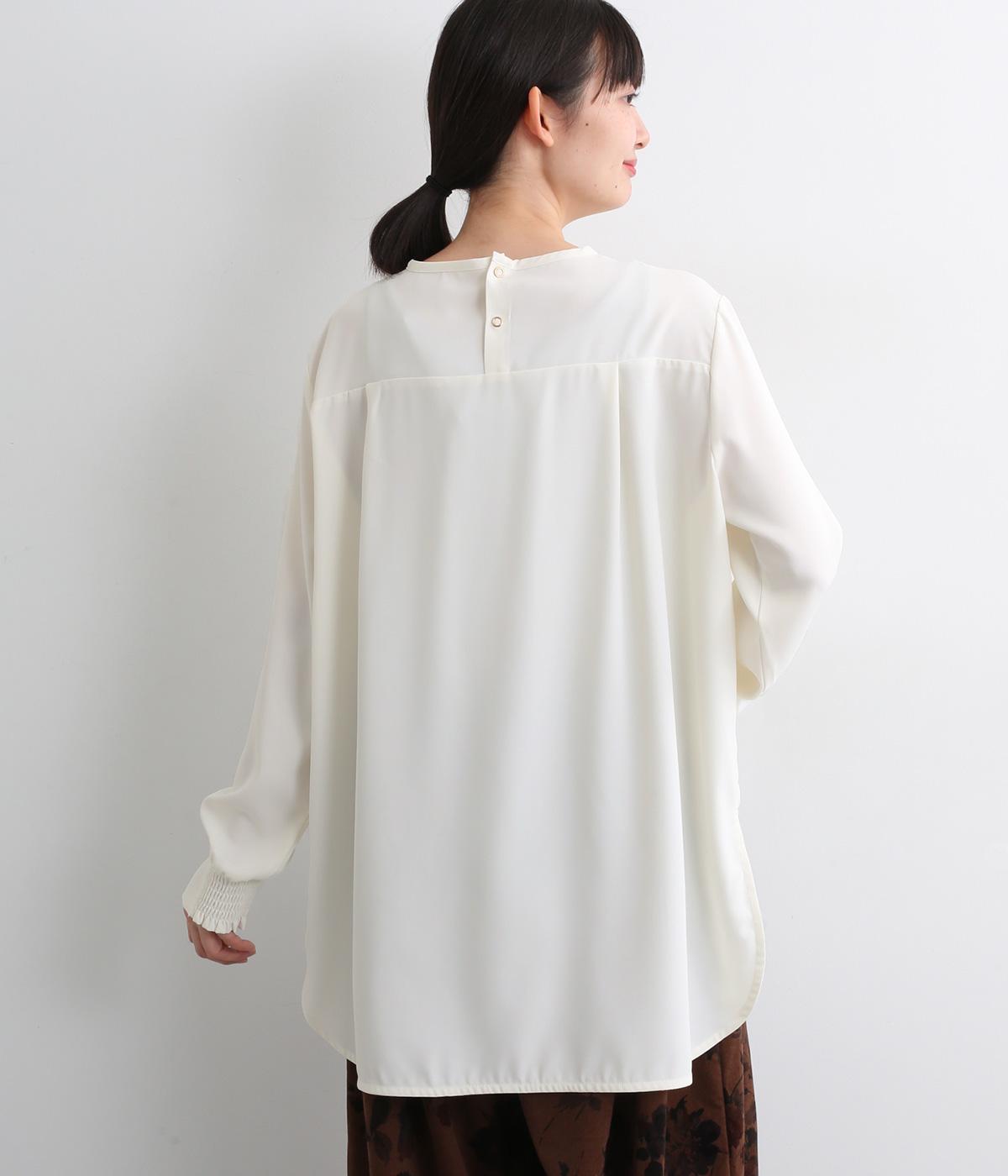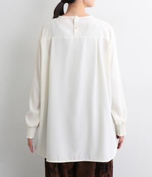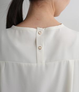 単品でトップスとしてはもちろん、インナー使いにもおすすめな1枚。袖口はシャーリングで女性らしさを、後ろボタンはスナップで着脱しやすくなっています。カットソーのロンTよりきれいめな雰囲気で、大人の着こなしに最適です。