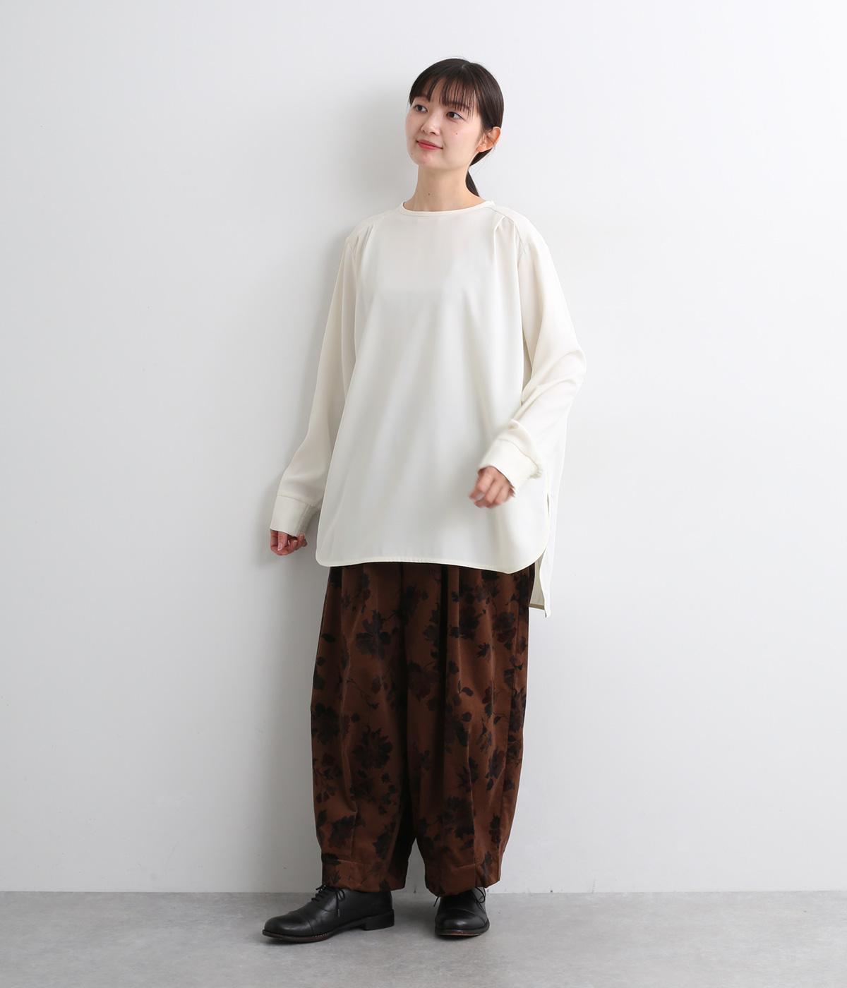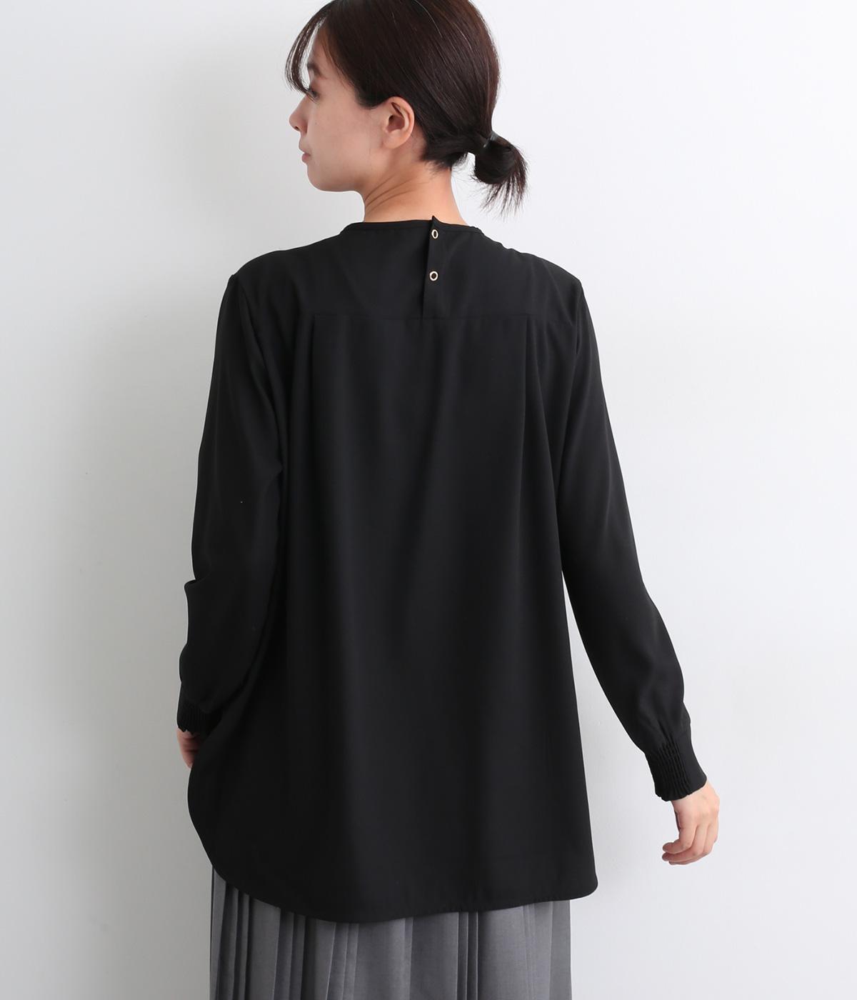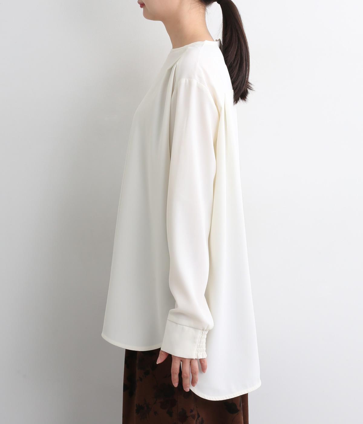 単品でトップスとしてはもちろん、インナー使いにもおすすめな1枚。袖口はシャーリングで女性らしさを、後ろボタンはスナップで着脱しやすくなっています。カットソーのロンTよりきれいめな雰囲気で、大人の着こなしに最適です。