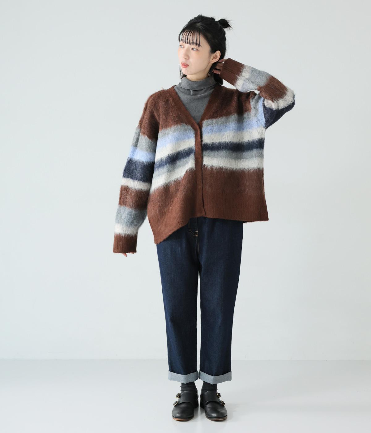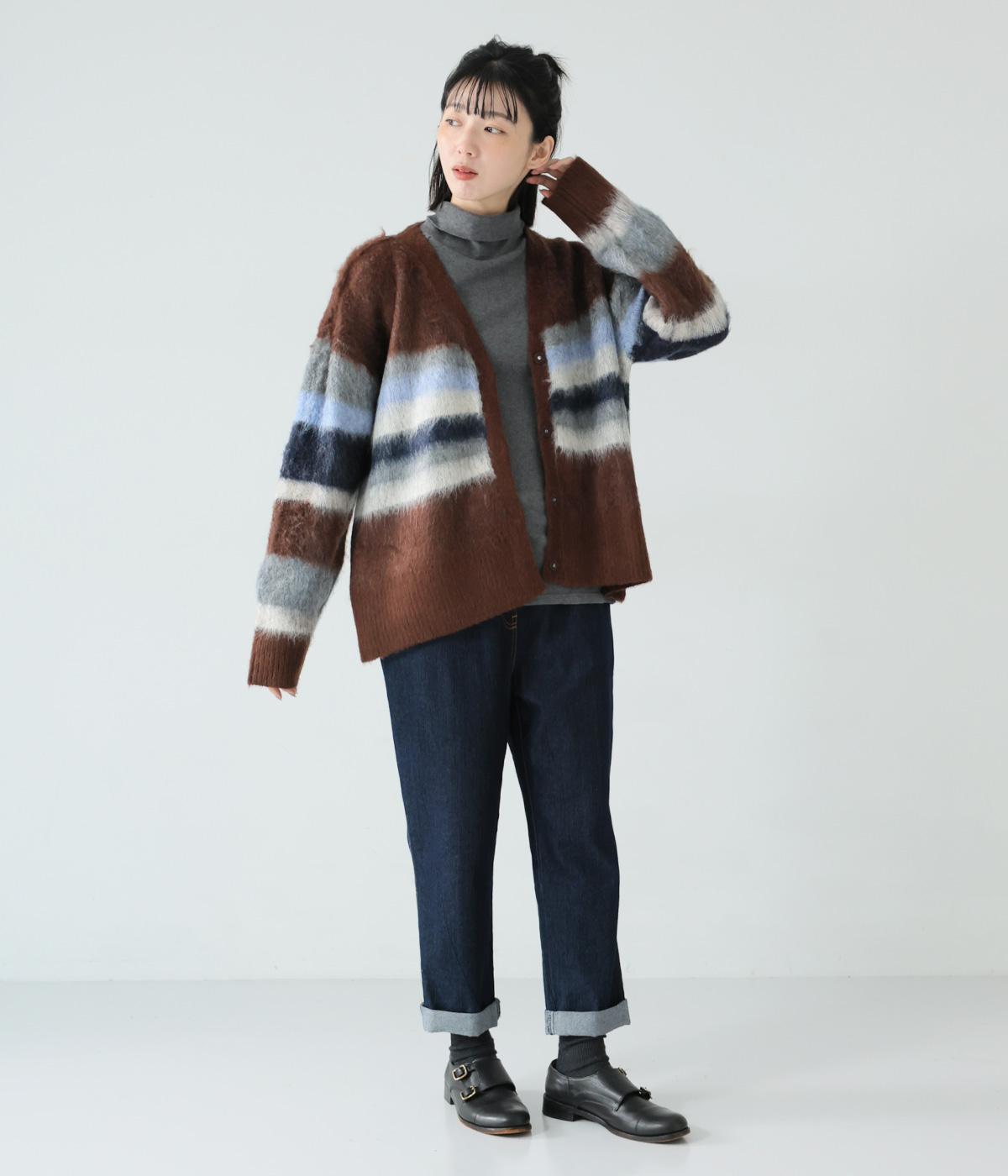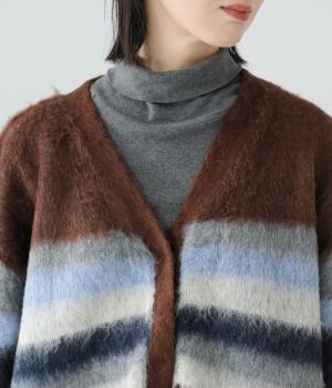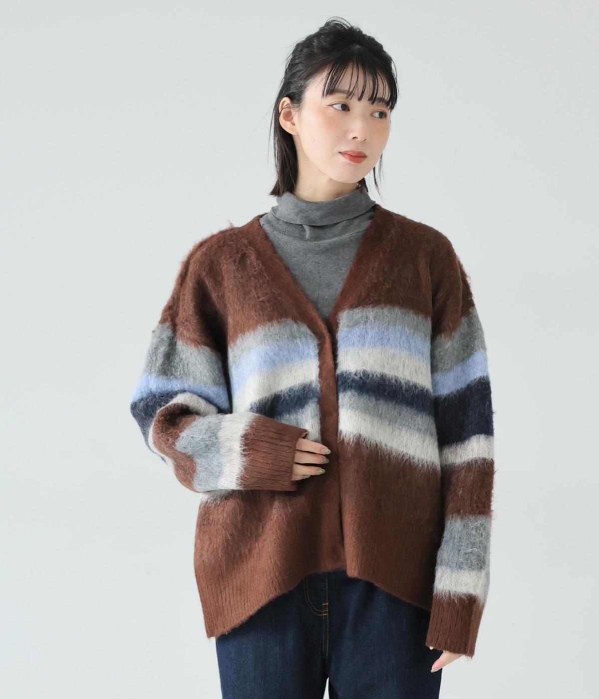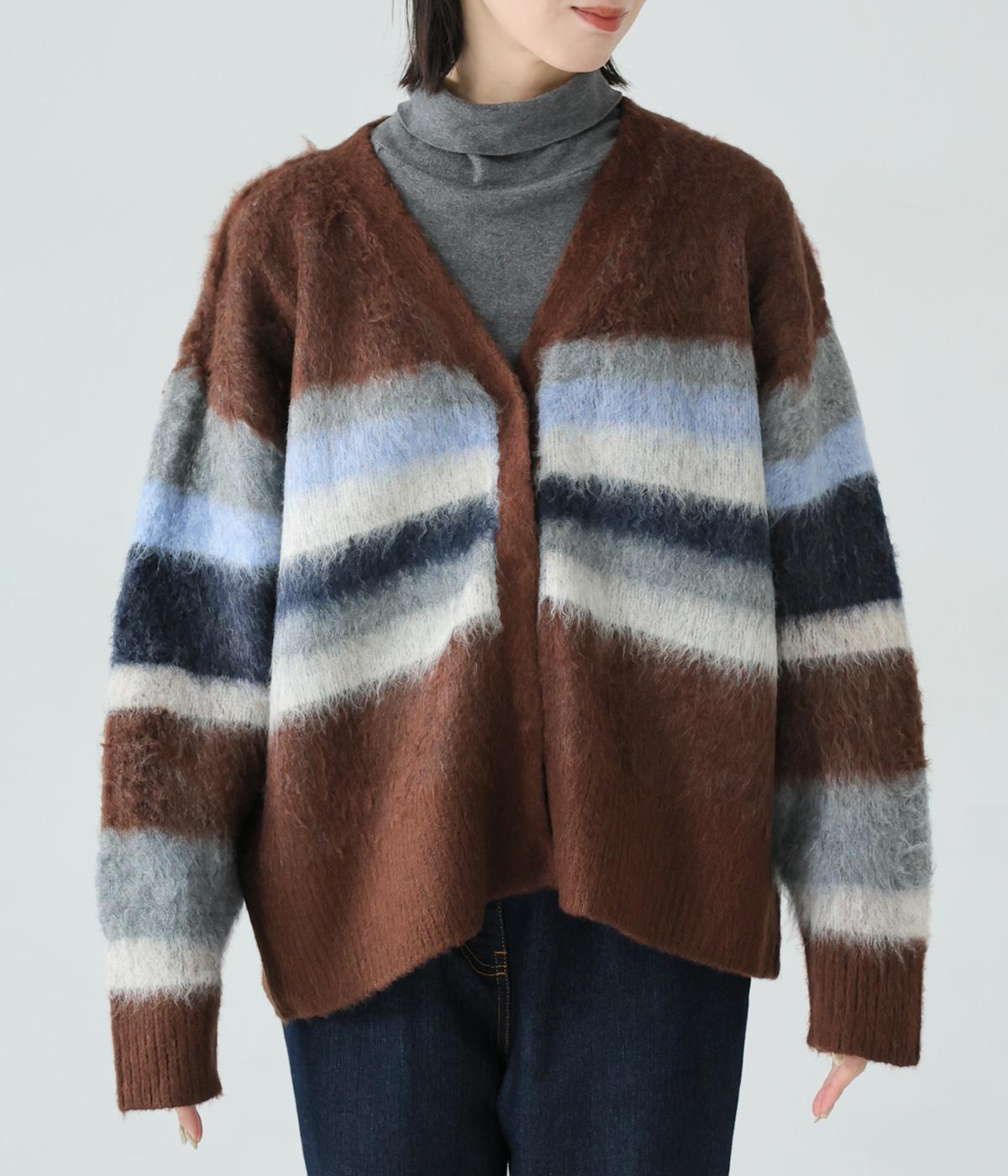 見た目、さわり心地ともにあたたかみを感じられるボーダーデザインが特徴のニットカーディガン。上品で絶妙な配色によりおしゃれ度は急上昇。比翼仕立てで隠れたスナップボタンも、ほっこりするデザインです。レース襟のインナー合わせでドレッシーに、ハイネックカットソーでカジュアルにと、さまざまな着こなしが可能。
