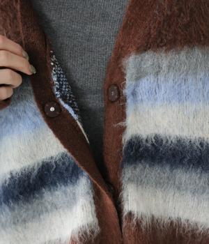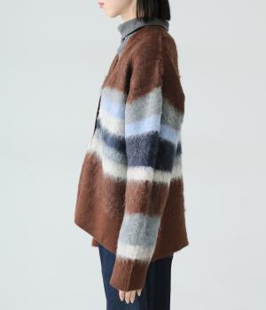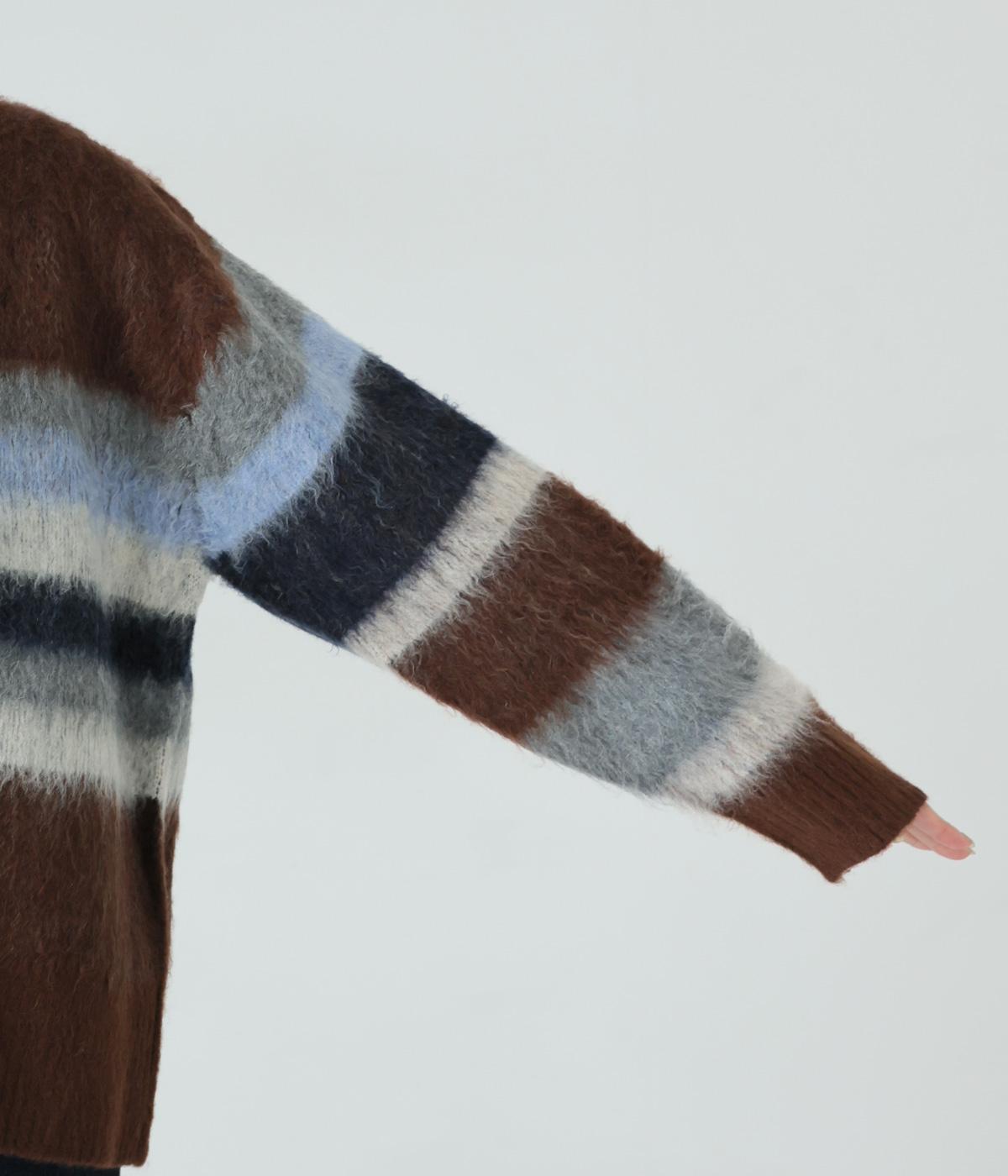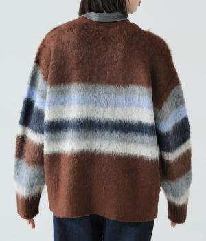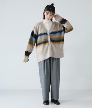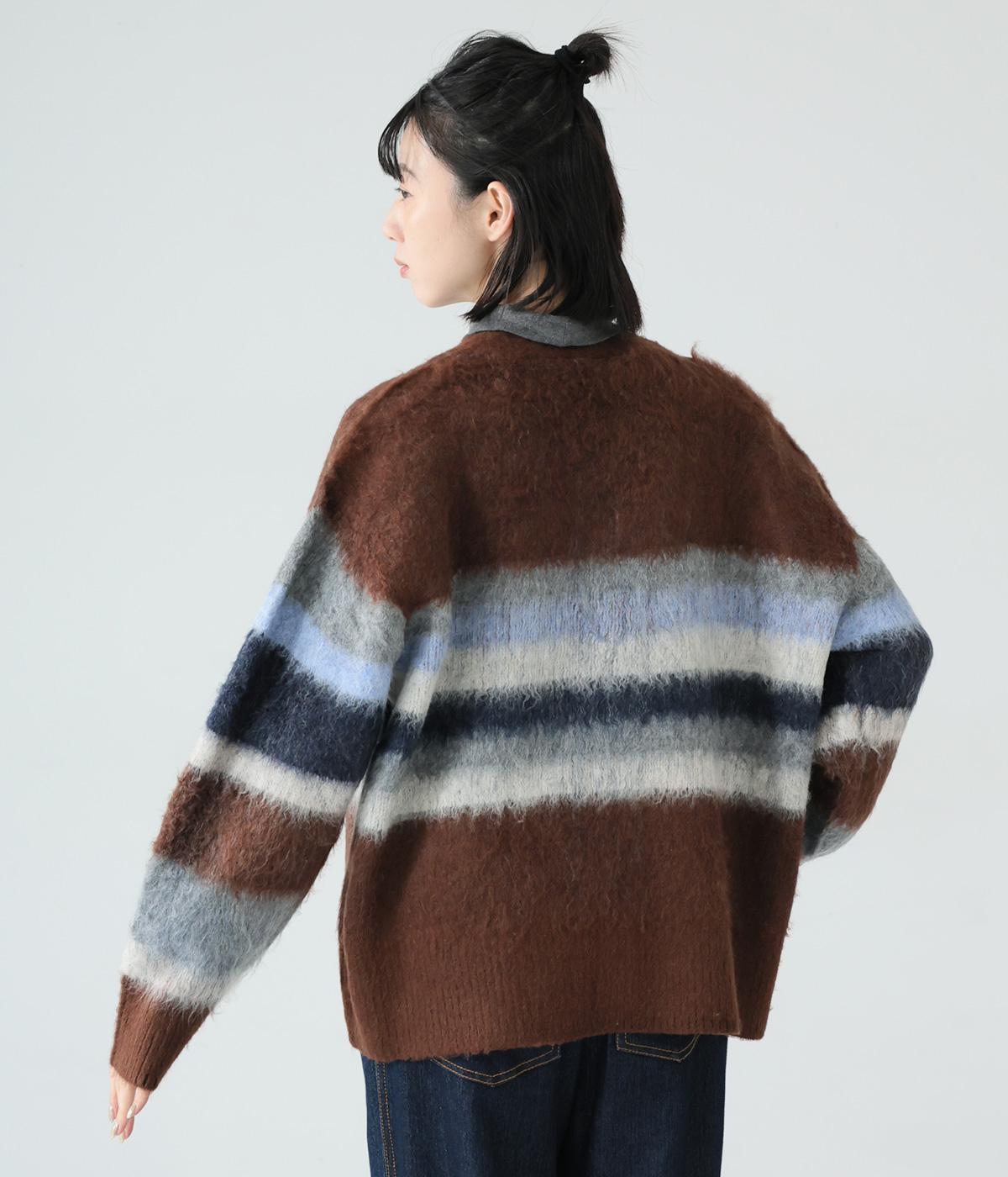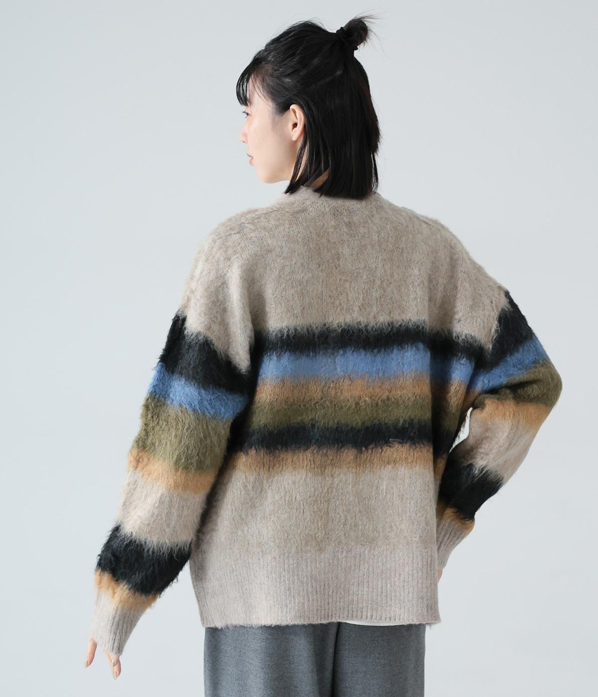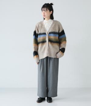 見た目、さわり心地ともにあたたかみを感じられるボーダーデザインが特徴のニットカーディガン。上品で絶妙な配色によりおしゃれ度は急上昇。比翼仕立てで隠れたスナップボタンも、ほっこりするデザインです。レース襟のインナー合わせでドレッシーに、ハイネックカットソーでカジュアルにと、さまざまな着こなしが可能。