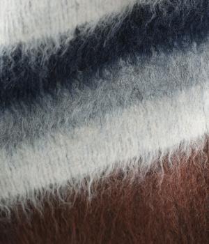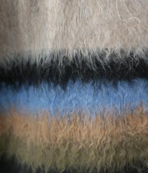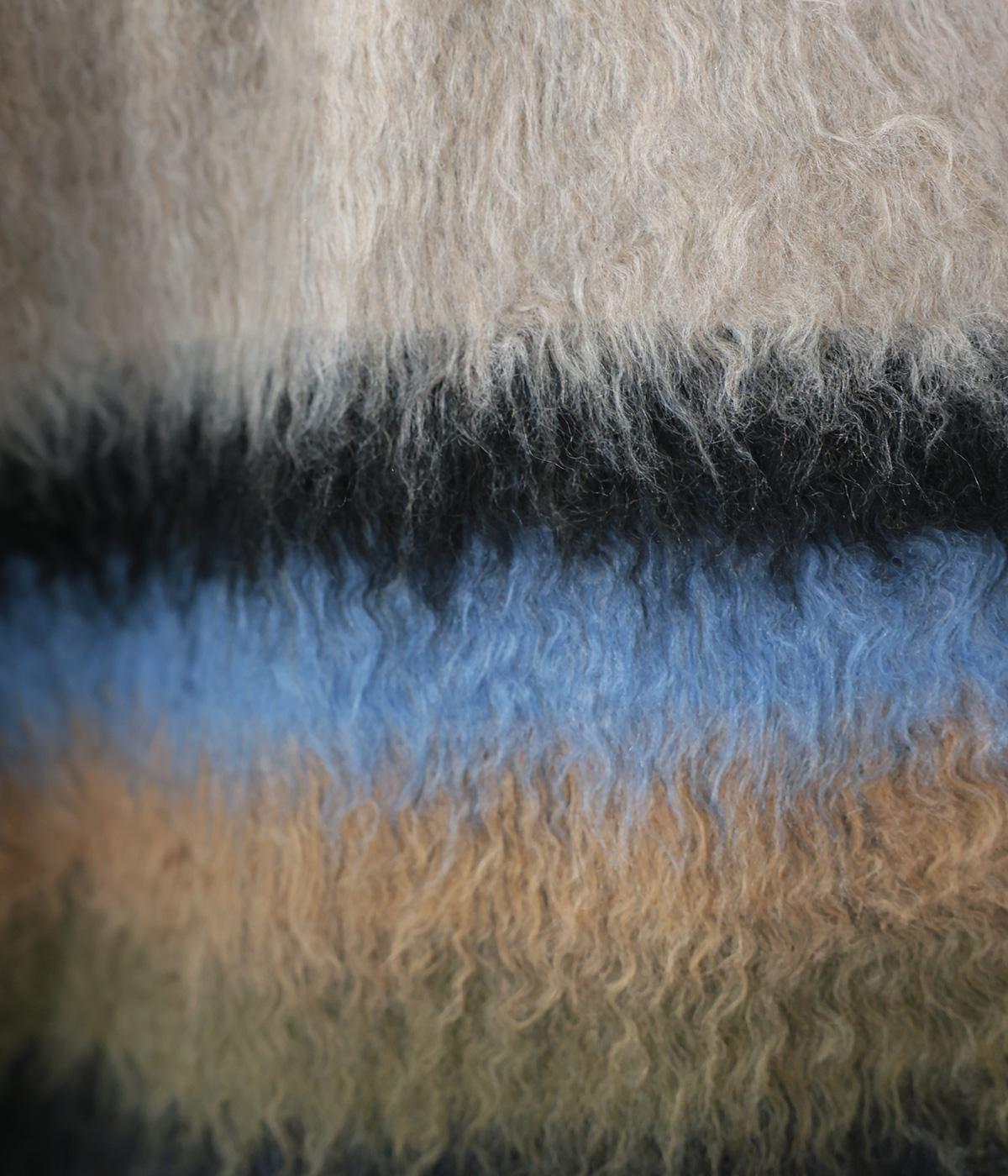 やや光沢のある毛足の長いシャギーが特徴の生地。ボリュームがあり、ふんわりとやわらかく、チクチクした感覚のないアクリル素材を使用しています。シワになりにくいポリエステルと伸縮性のあるポリウレタンの混紡。