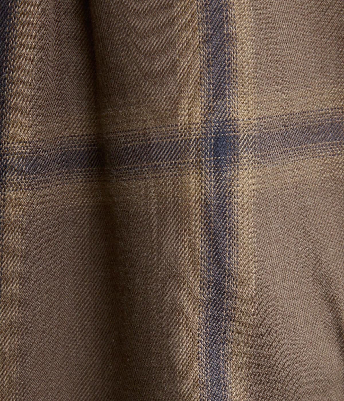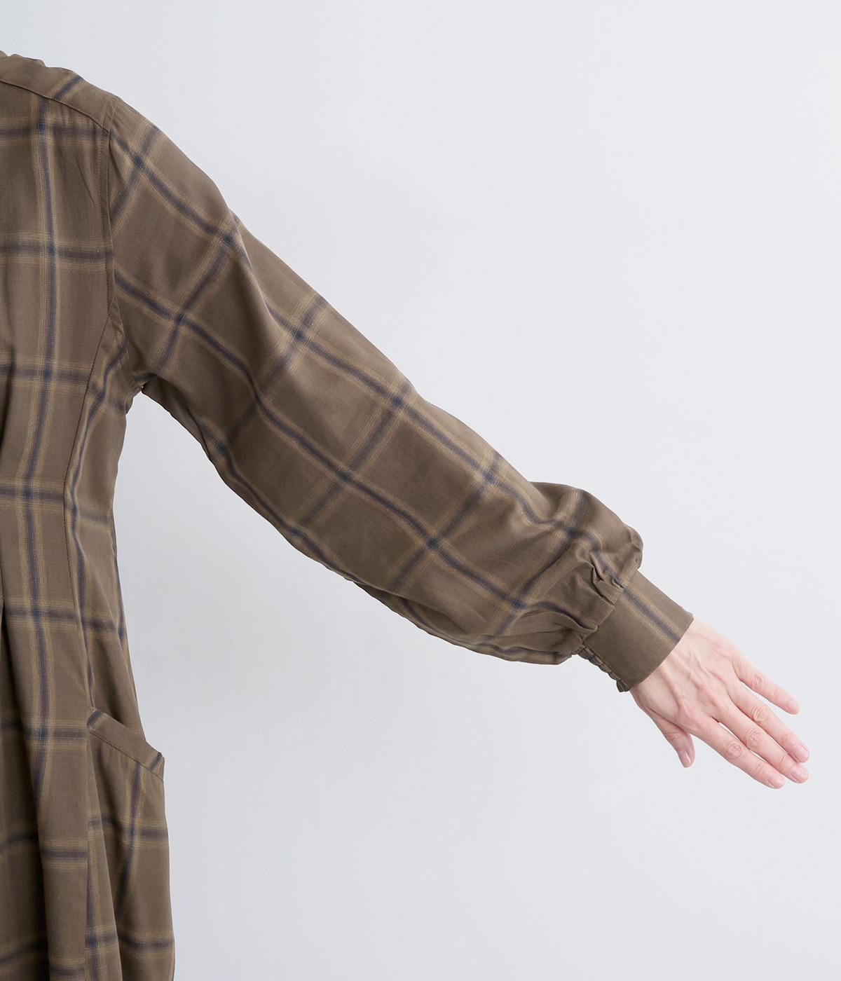 フィットしすぎないよう、ほどよくウエストを絞りタックを入れた、きれいなフレアシルエットのワンピース。オンブレチェック柄を活かした比翼仕立てで、羽織りスタイルもさまになります。ポケットつきで機能性も◎。