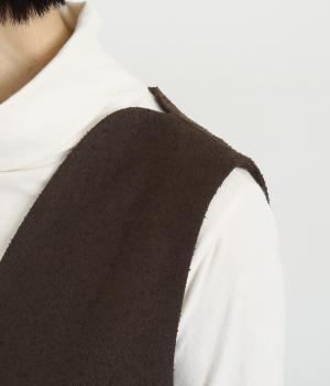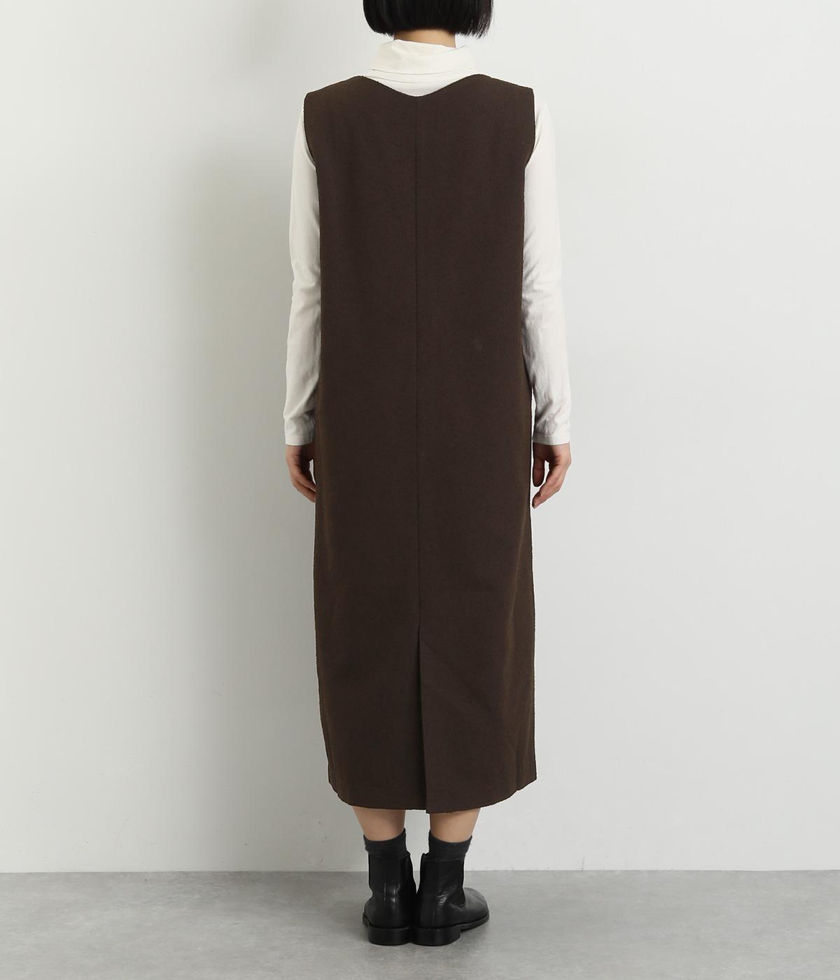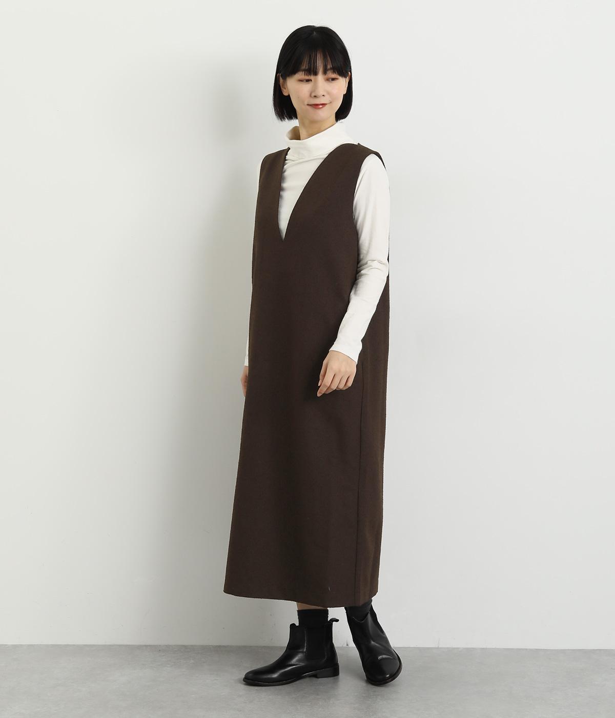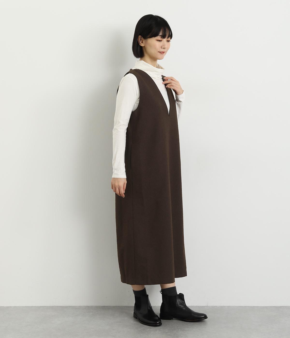 すっきりとしたタテラインに深めのVネックがシックな印象を醸します。中に合わせるトップスによってさまざまなスタイリングがたのしめそう。後ろベント入りで足さばきも快適。がばっと被るだけのイージータイプです。