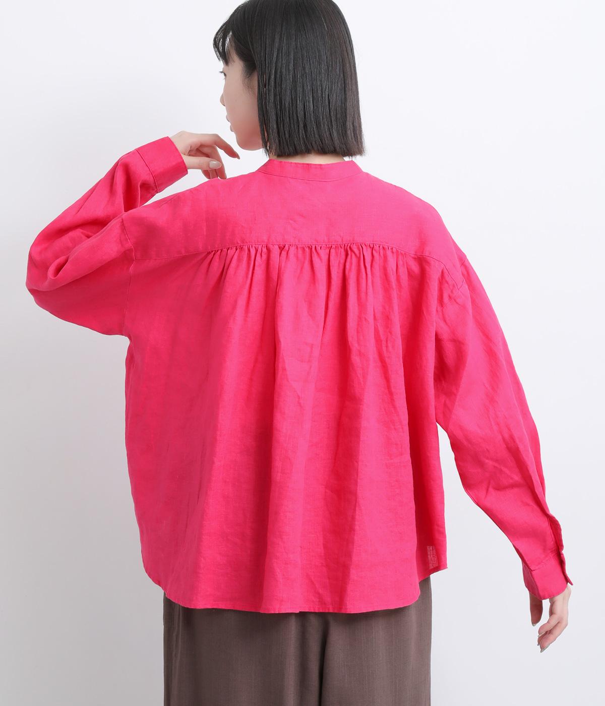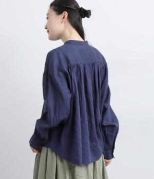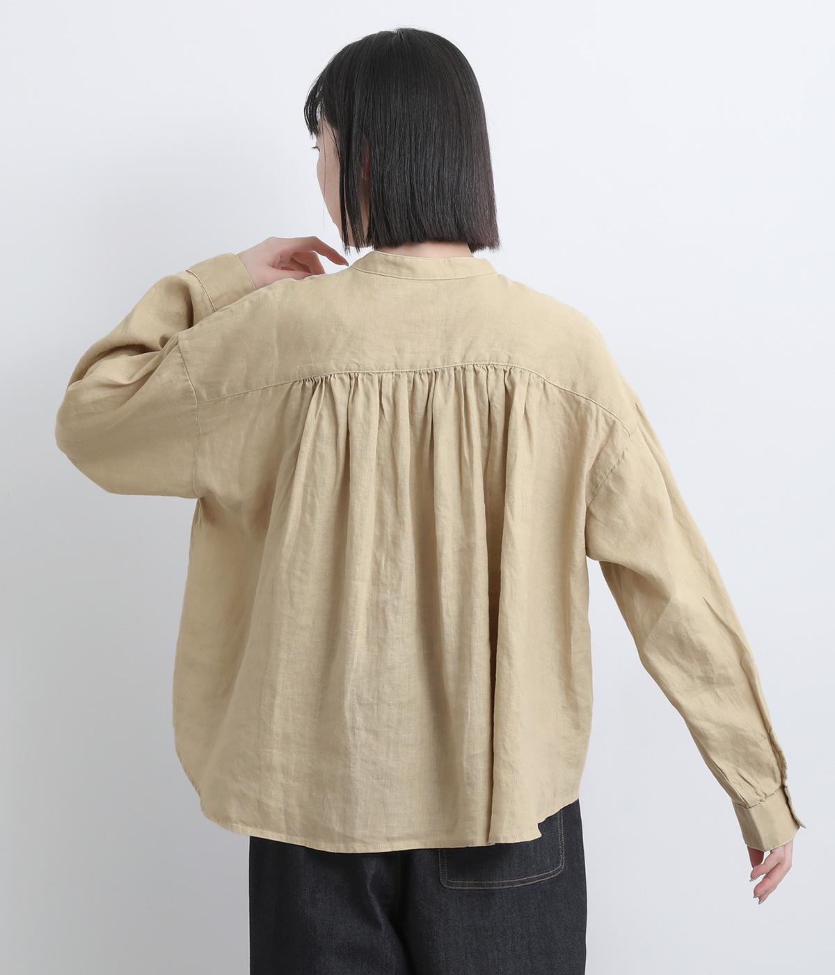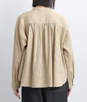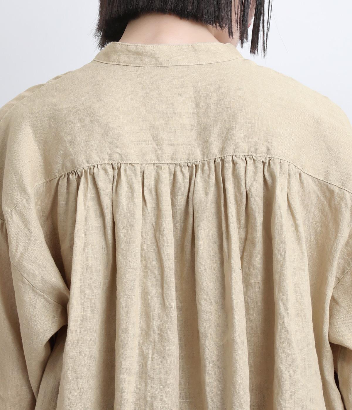 前はすっきりシンプルに、後ろはたっぷりギャザーを入れてフレアに仕上げて着映え力を高めました。着丈に前後差をつけているのでトップスアウトやラフな羽織り使いもサマになります。バンドカラーや袖カフスで適度にメリハリをプラス。