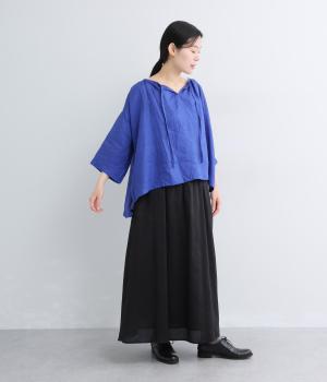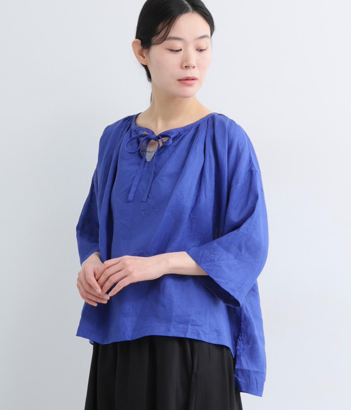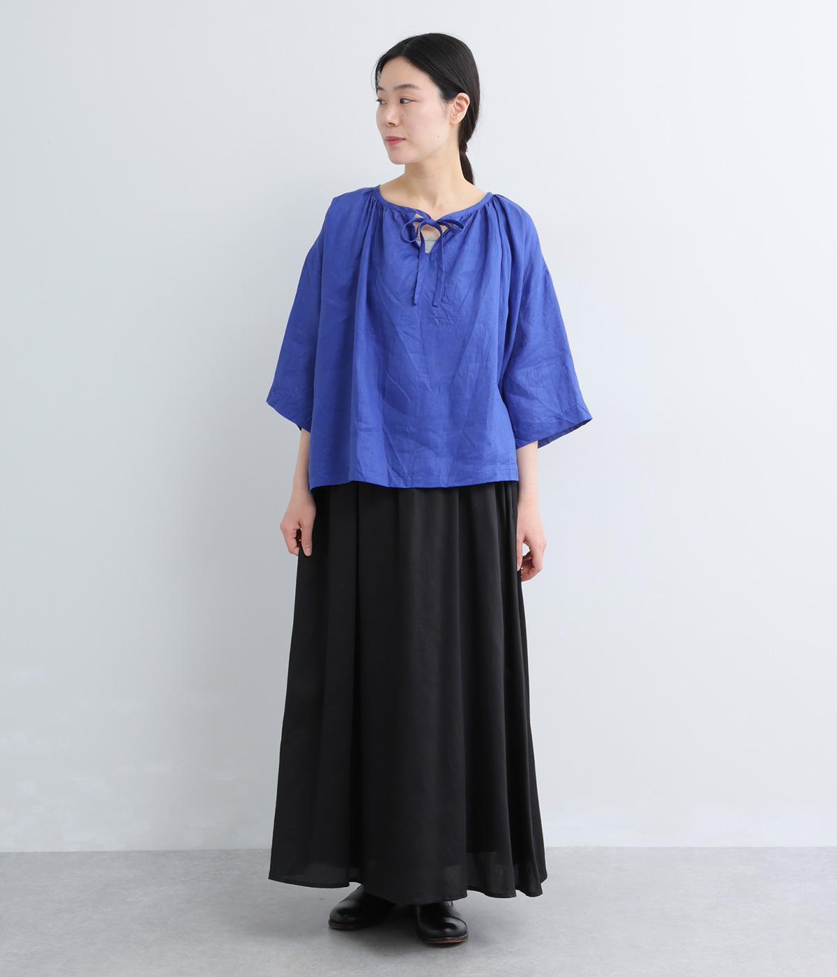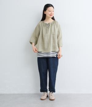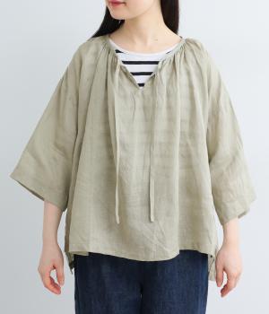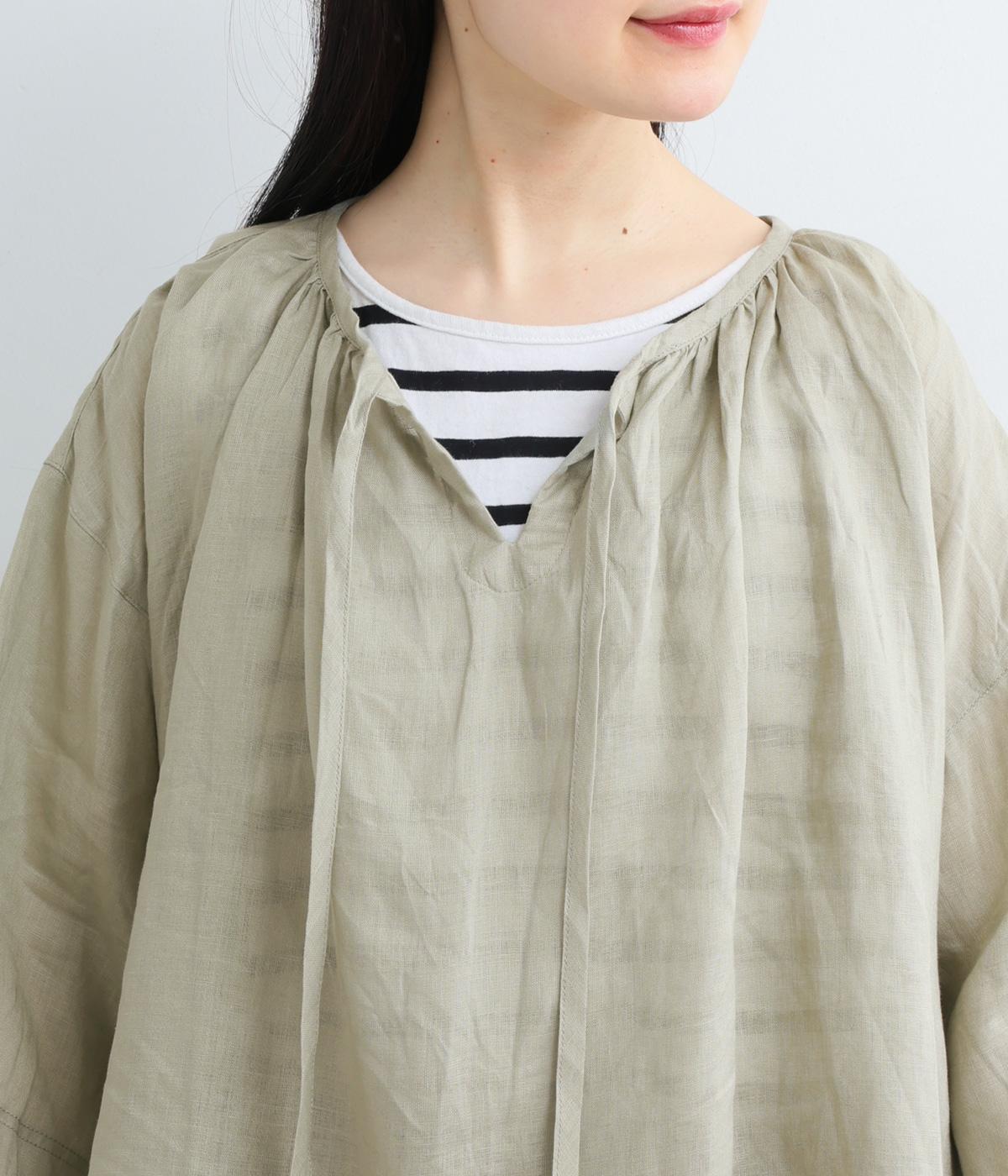 上品でほのかな透け感がスタイリングに軽やかなニュアンスを添えます。紐をあしらった首元はきゅっと結んでもラフに垂らしてもほどよい抜け感をもたらし、さわやかな雰囲気を引き立てます。レイヤードも楽しめるオールシーズン着まわし可能な一枚です。