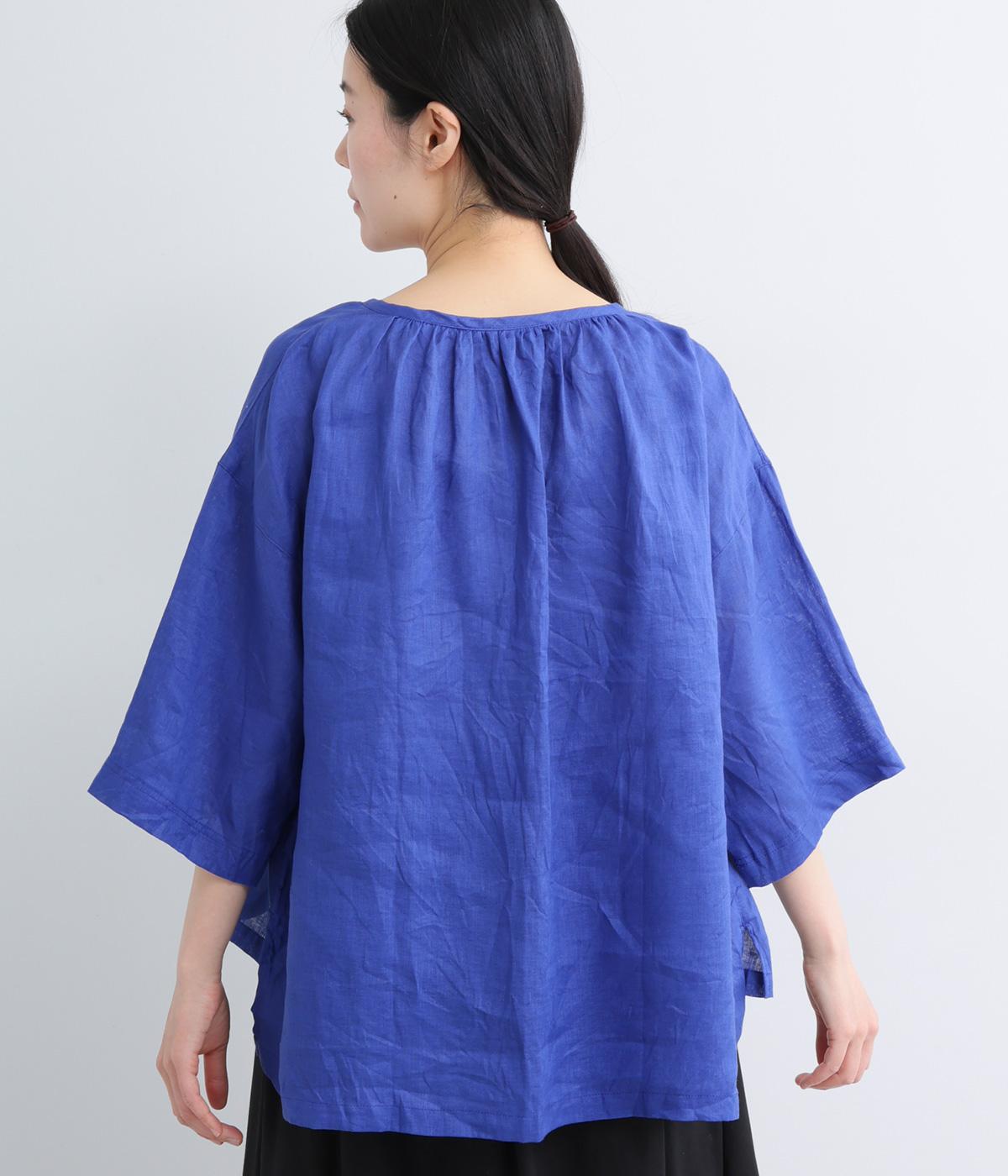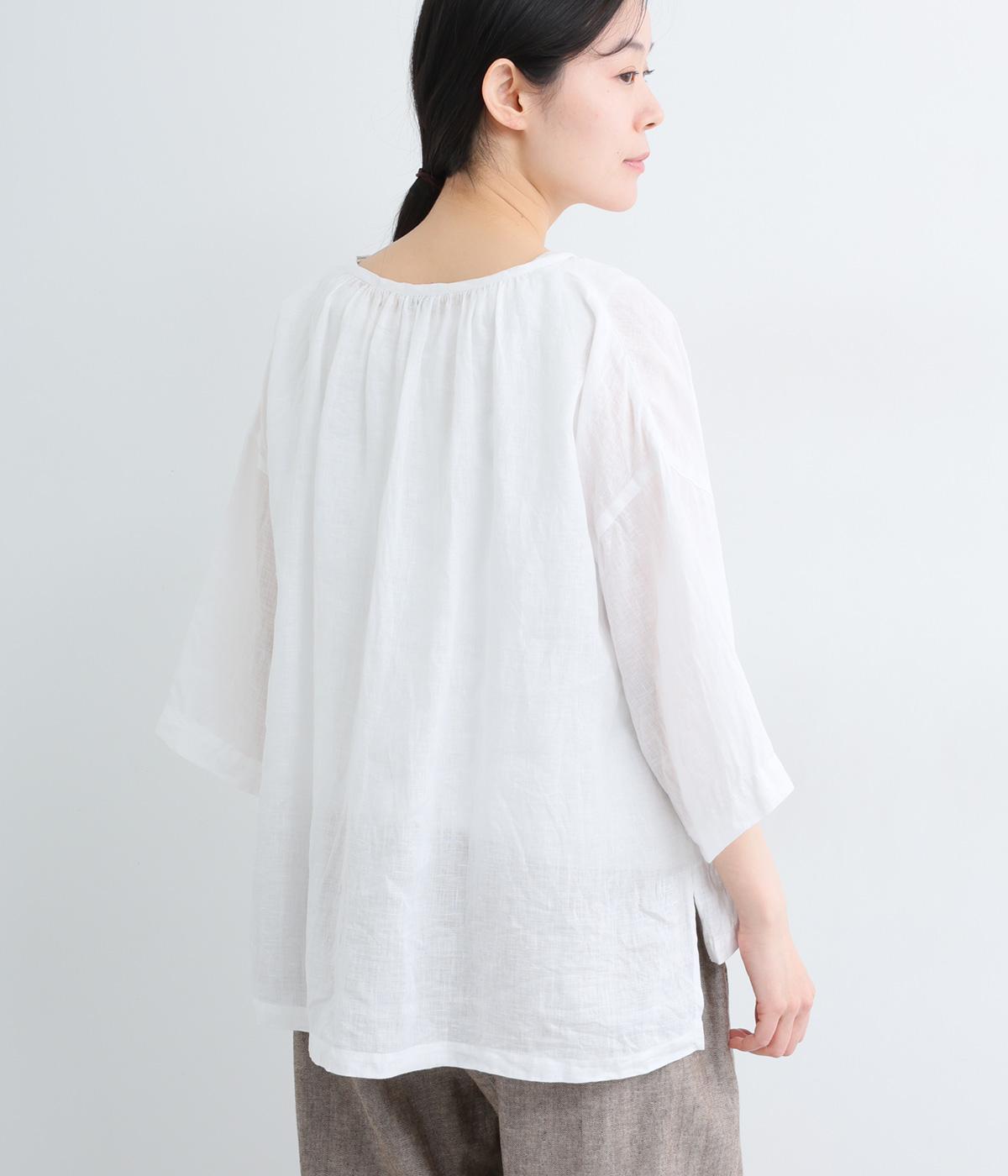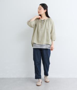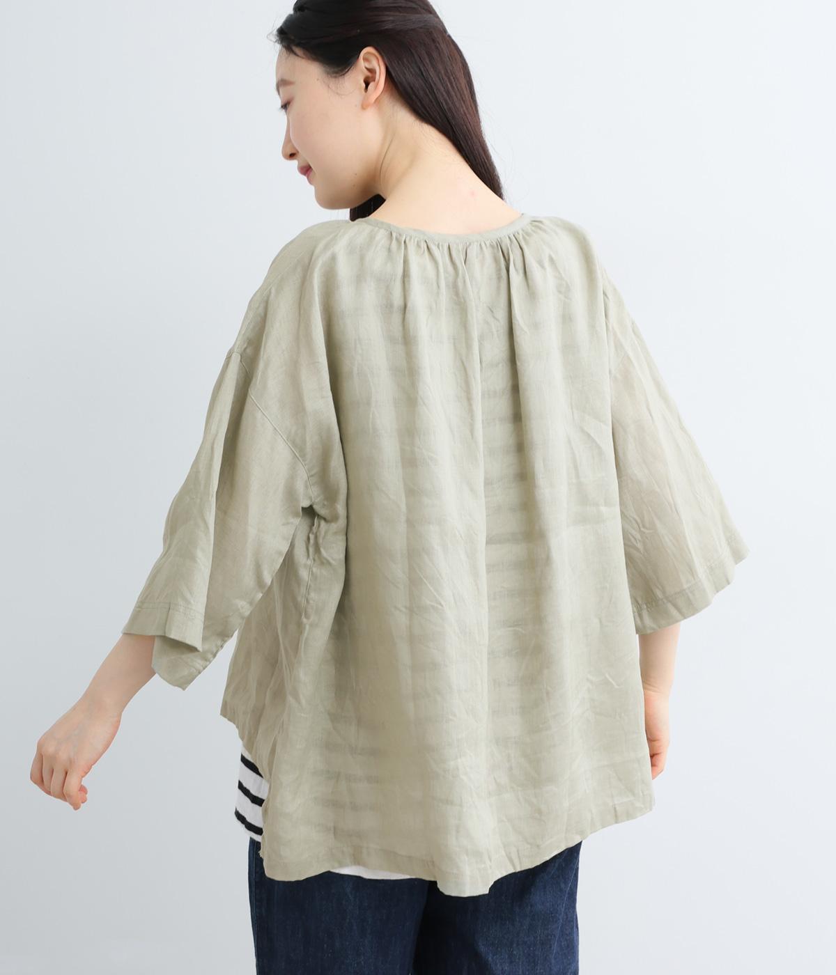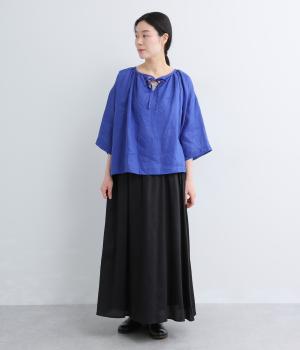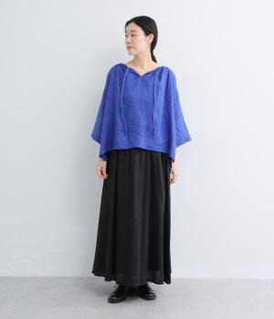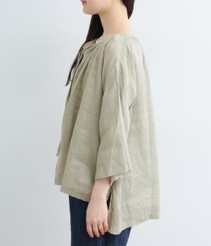 上品でほのかな透け感がスタイリングに軽やかなニュアンスを添えます。紐をあしらった首元はきゅっと結んでもラフに垂らしてもほどよい抜け感をもたらし、さわやかな雰囲気を引き立てます。レイヤードも楽しめるオールシーズン着まわし可能な一枚です。