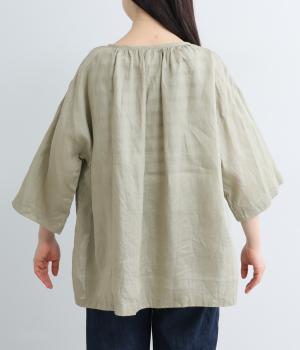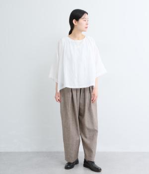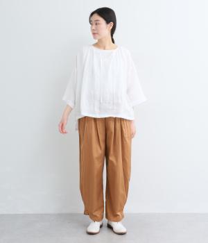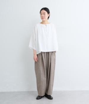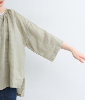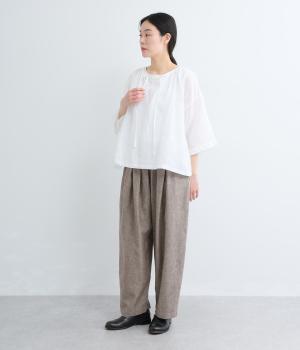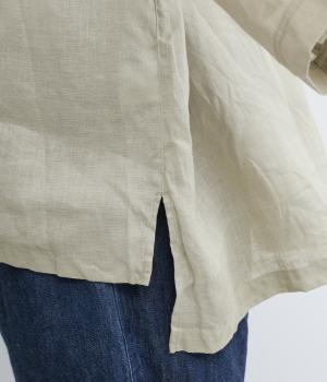 リネンならではのシャリ感と清涼感が魅力の生地です。やや薄手で軽やかながらしなやかなハリがあり、きれいなシルエットを描きます。暑い季節でも快適な着心地の素材感です。