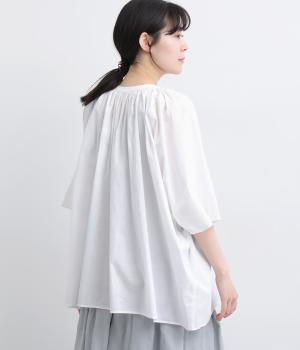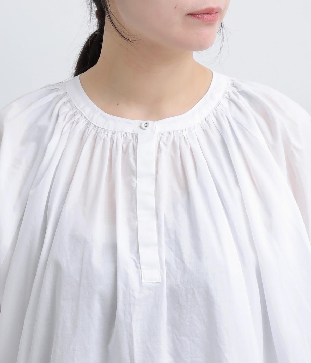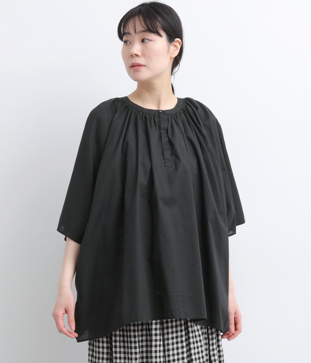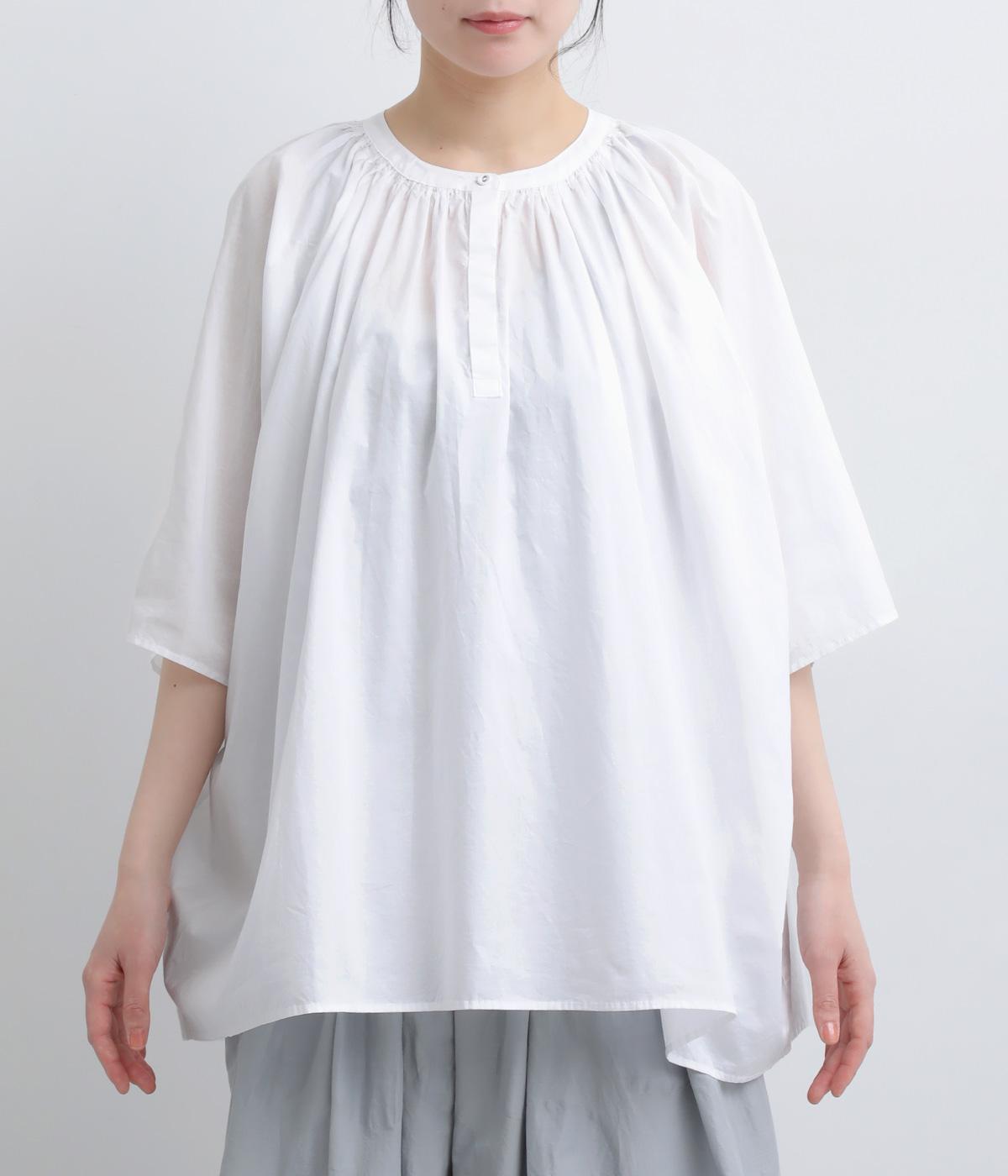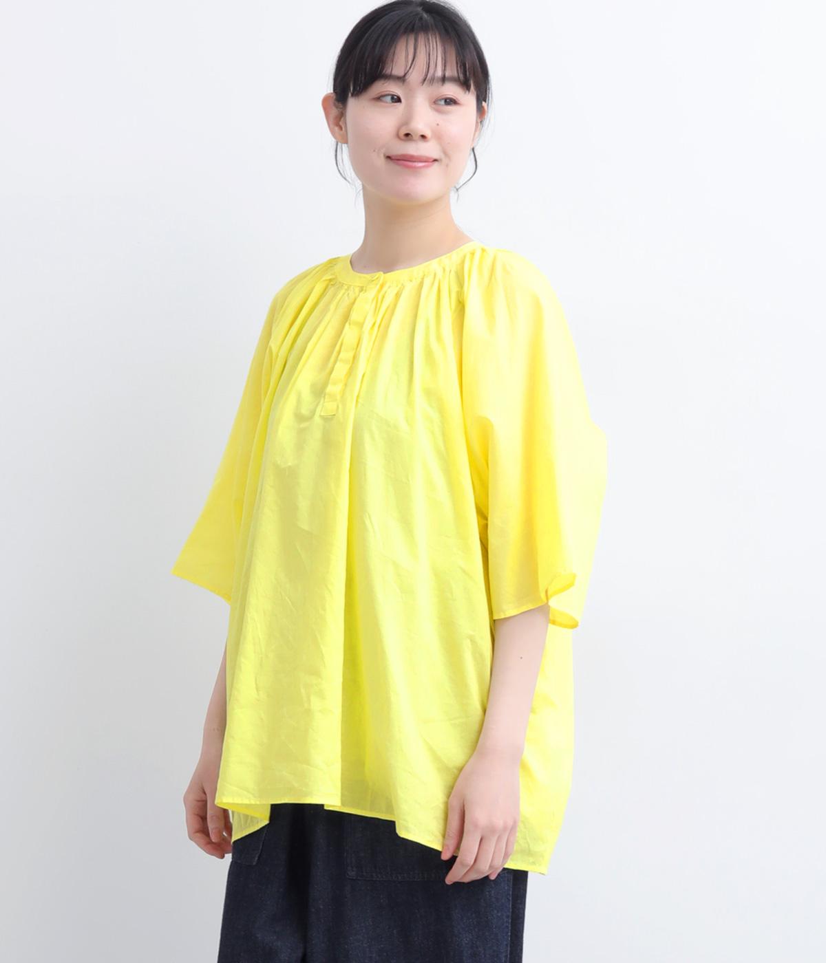 ネックラインにギャザーをたっぷりあしらった、やさしい印象のブラウスです。比翼ボタンのヘンリーネックデザインで、すっきりと仕上げました。肩まわりはラグラン仕様でゆとりがあり、動きやすさも◎。軽やかなシルエットと生地の透け感をいかした、レイヤードコーディネートをたのしめる一枚です。