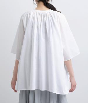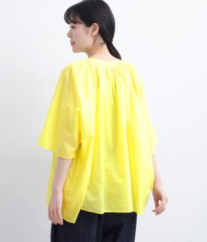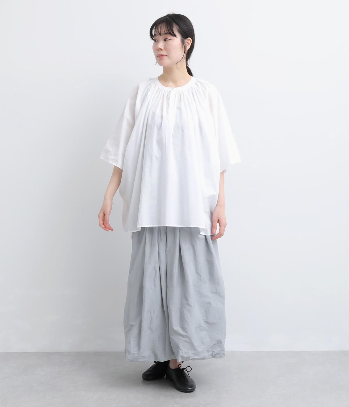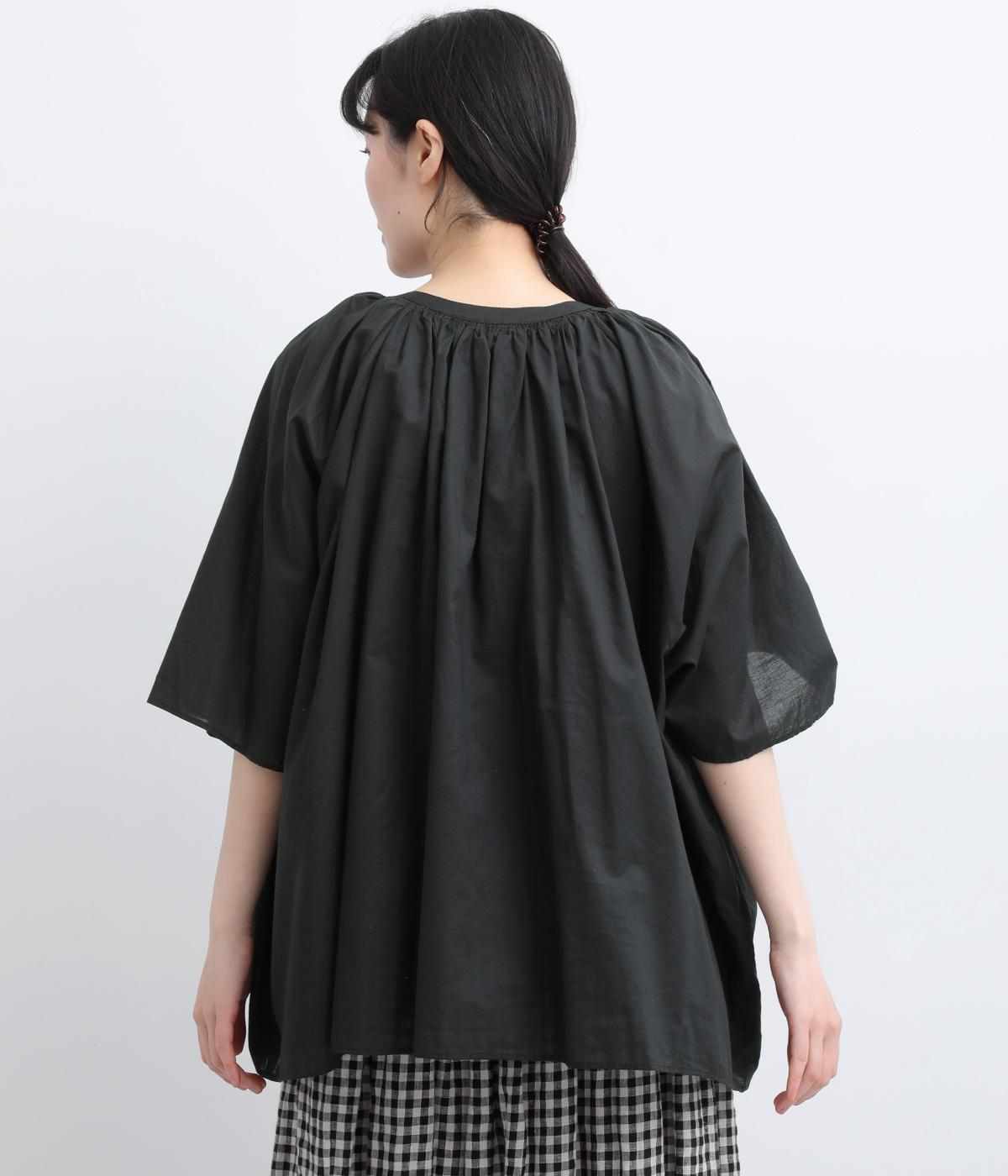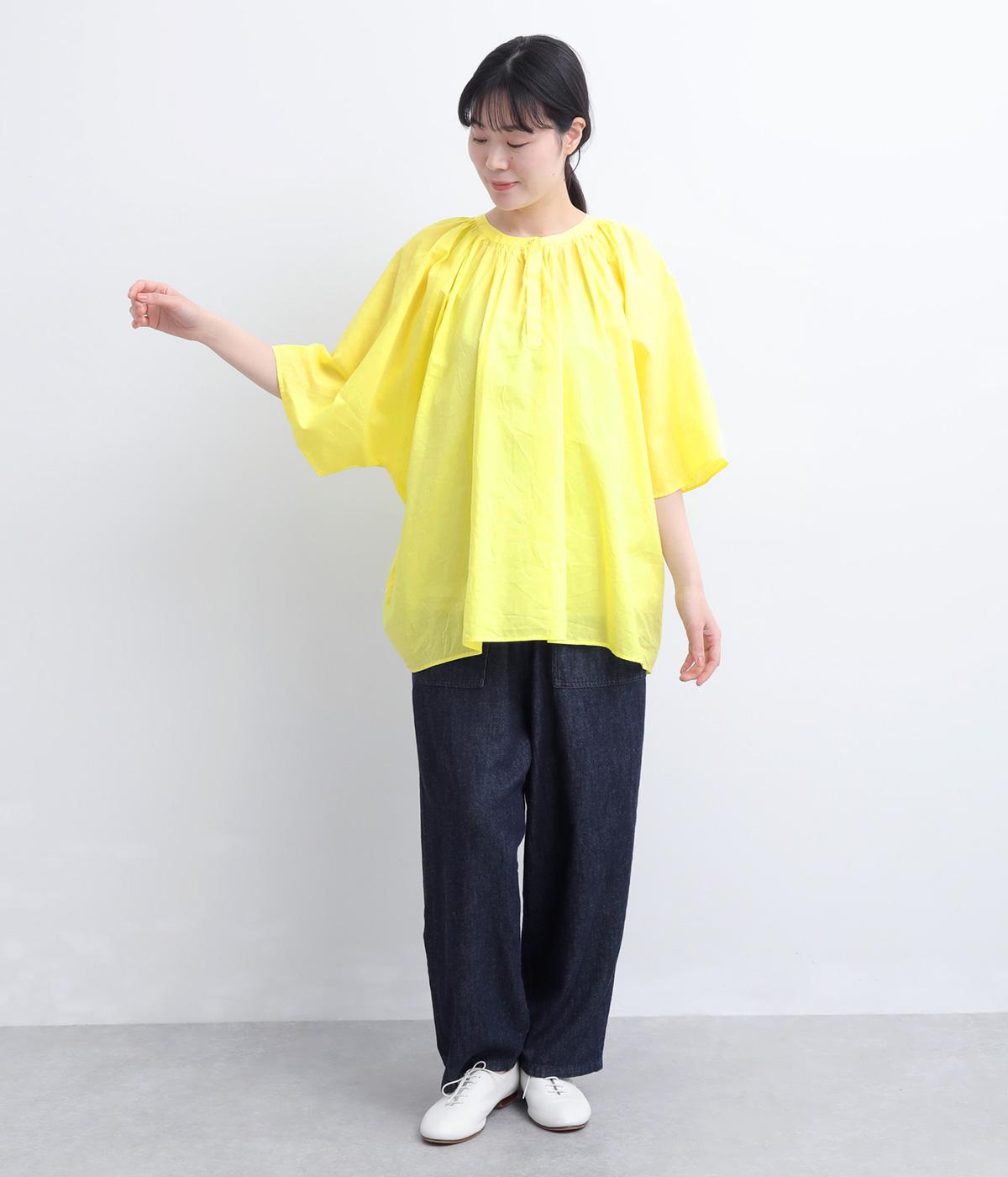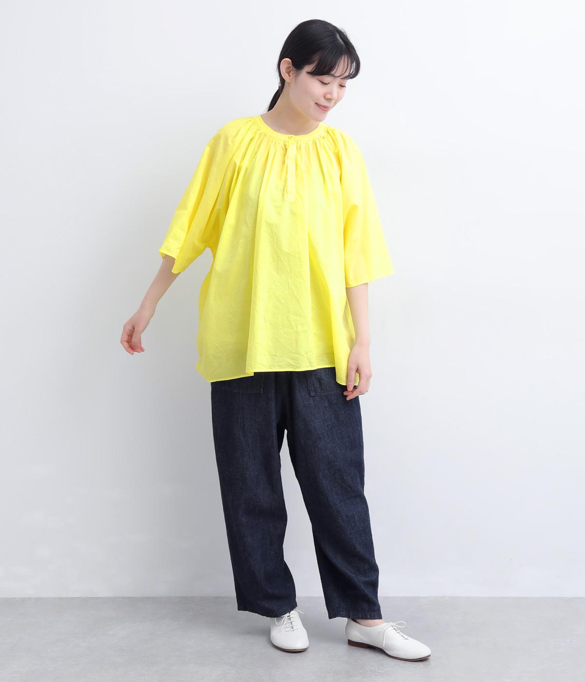 ネックラインにギャザーをたっぷりあしらった、やさしい印象のブラウスです。比翼ボタンのヘンリーネックデザインで、すっきりと仕上げました。肩まわりはラグラン仕様でゆとりがあり、動きやすさも◎。軽やかなシルエットと生地の透け感をいかした、レイヤードコーディネートをたのしめる一枚です。