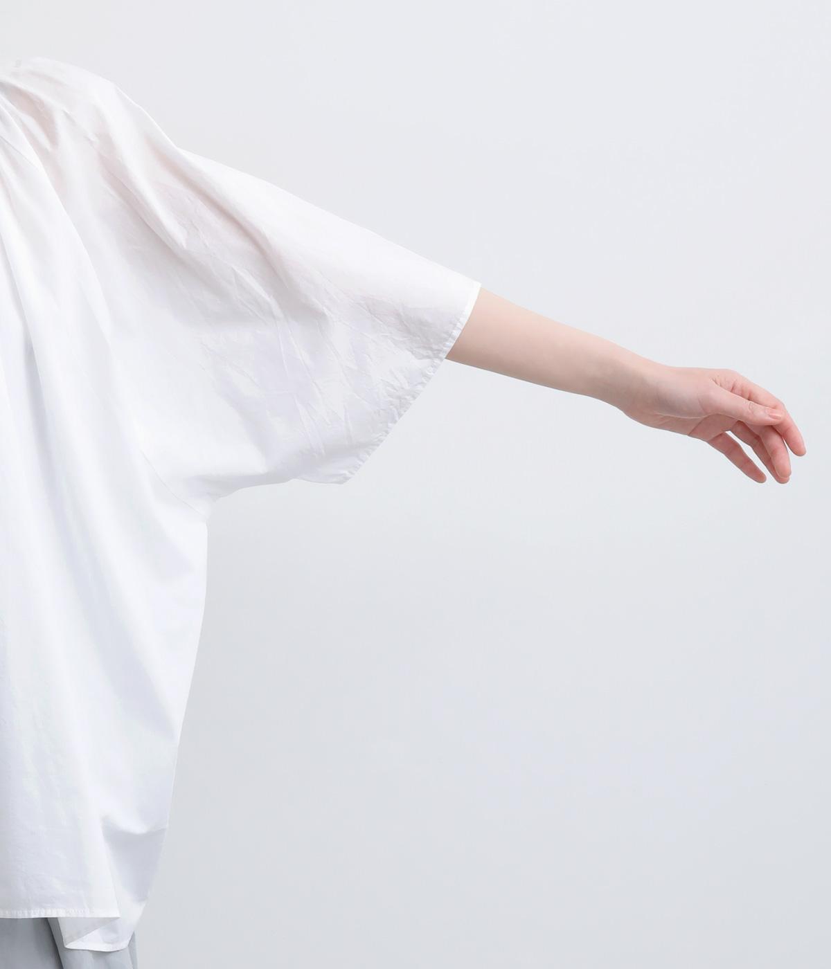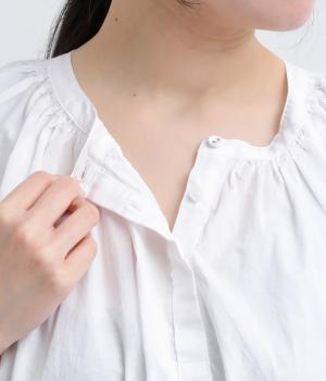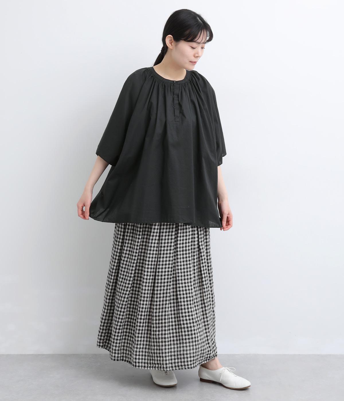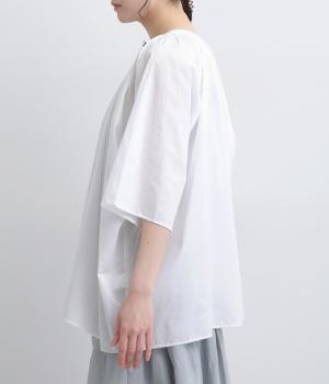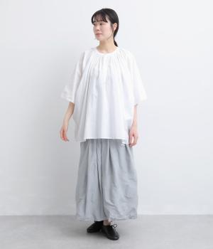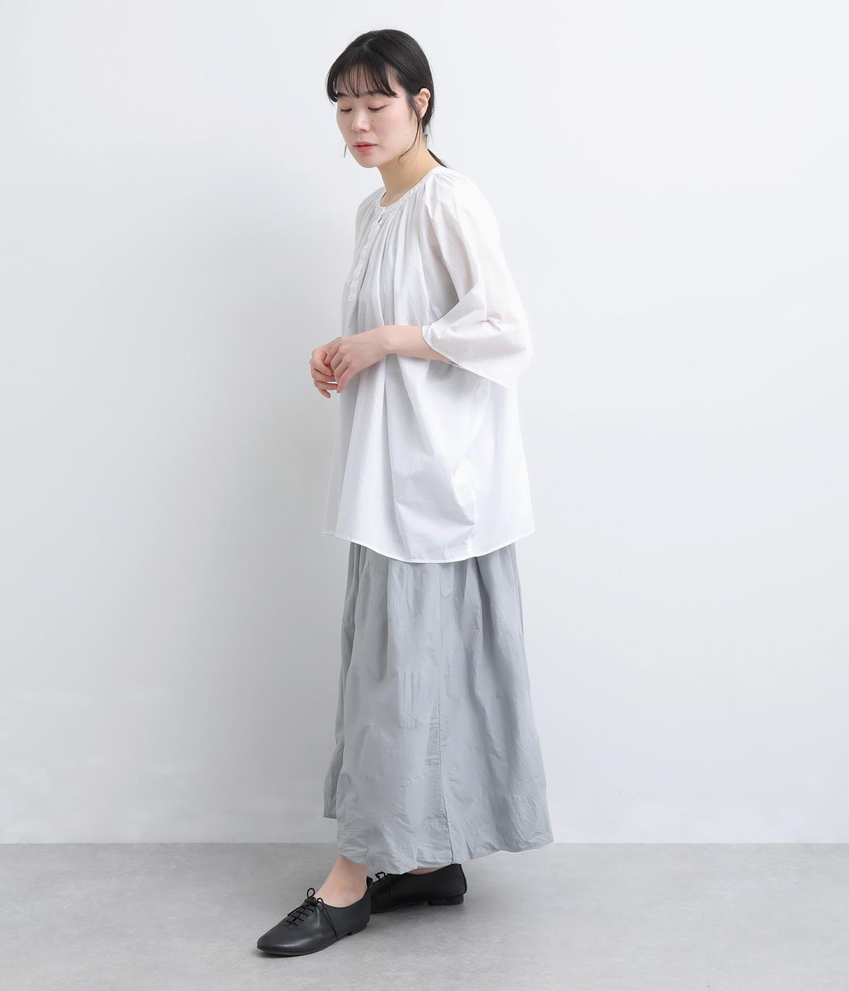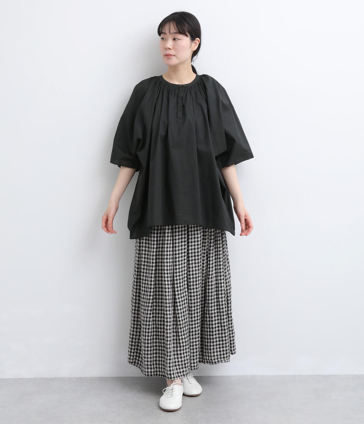 ネックラインにギャザーをたっぷりあしらった、やさしい印象のブラウスです。比翼ボタンのヘンリーネックデザインで、すっきりと仕上げました。肩まわりはラグラン仕様でゆとりがあり、動きやすさも◎。軽やかなシルエットと生地の透け感をいかした、レイヤードコーディネートをたのしめる一枚です。
