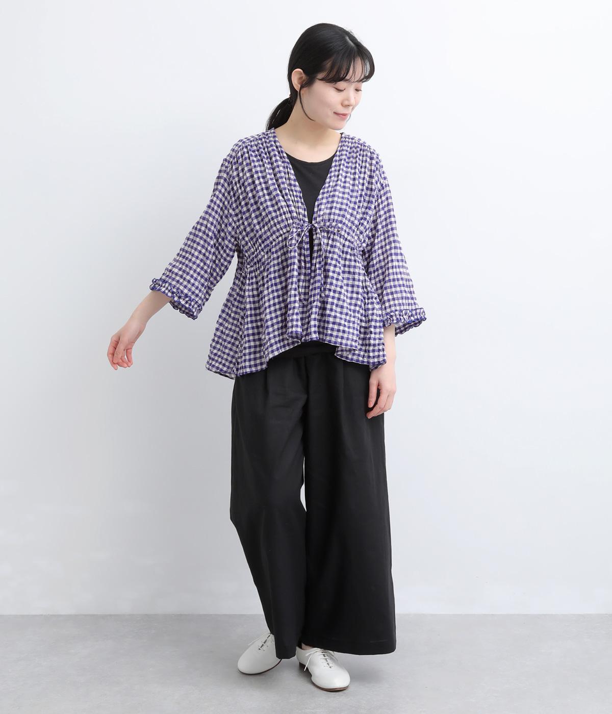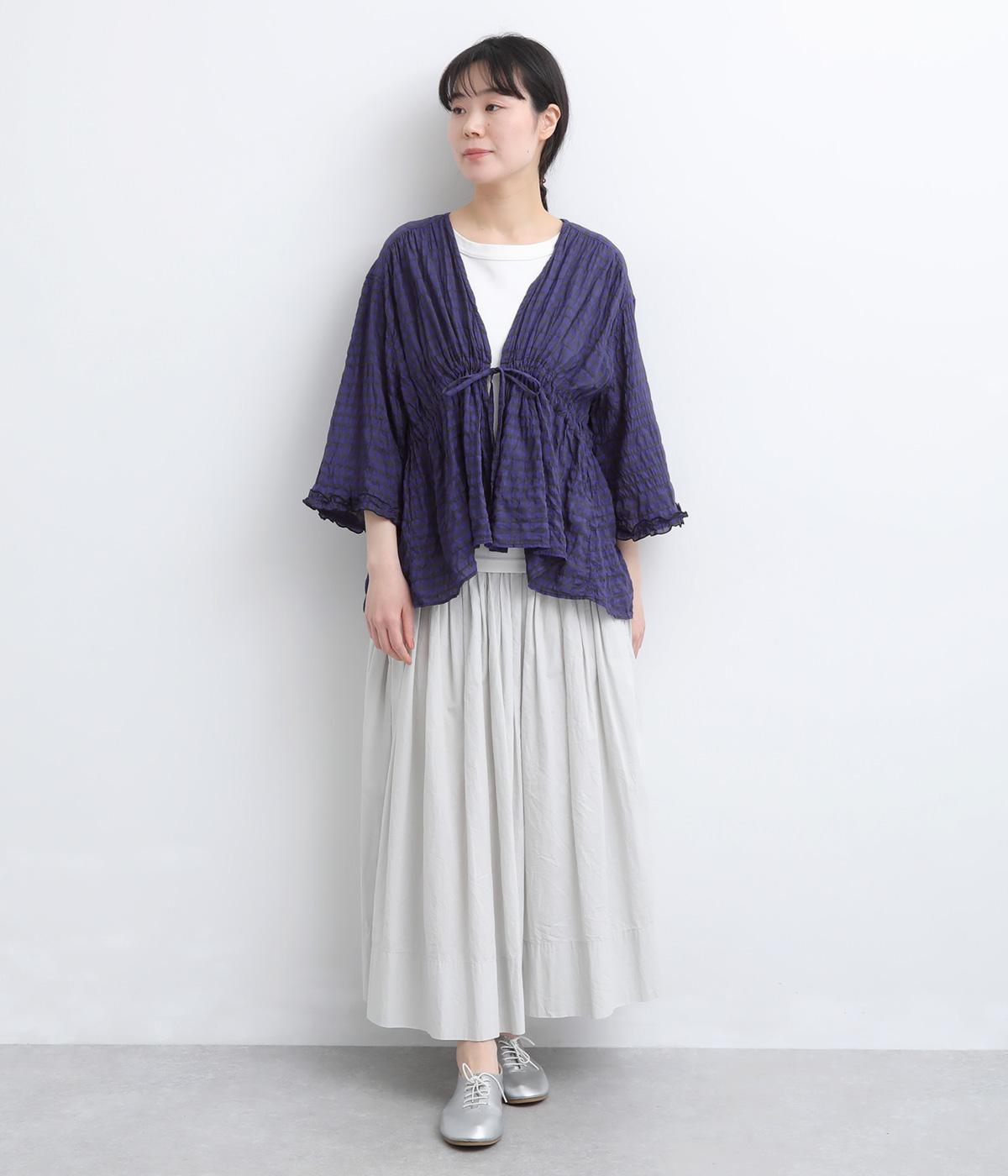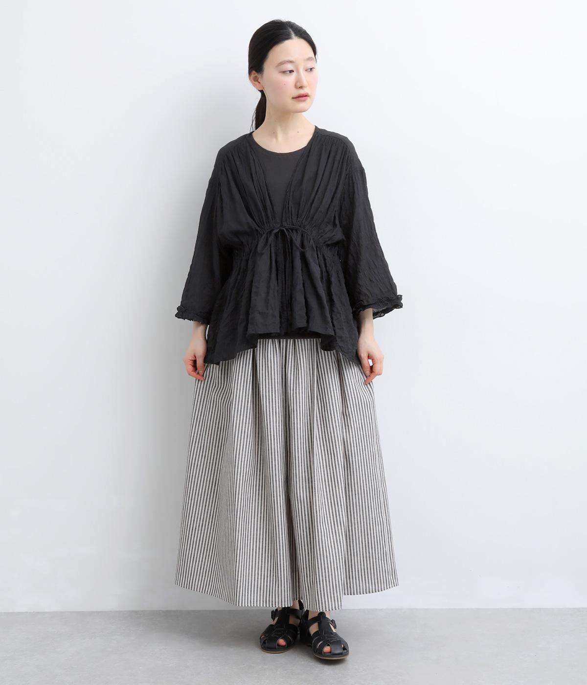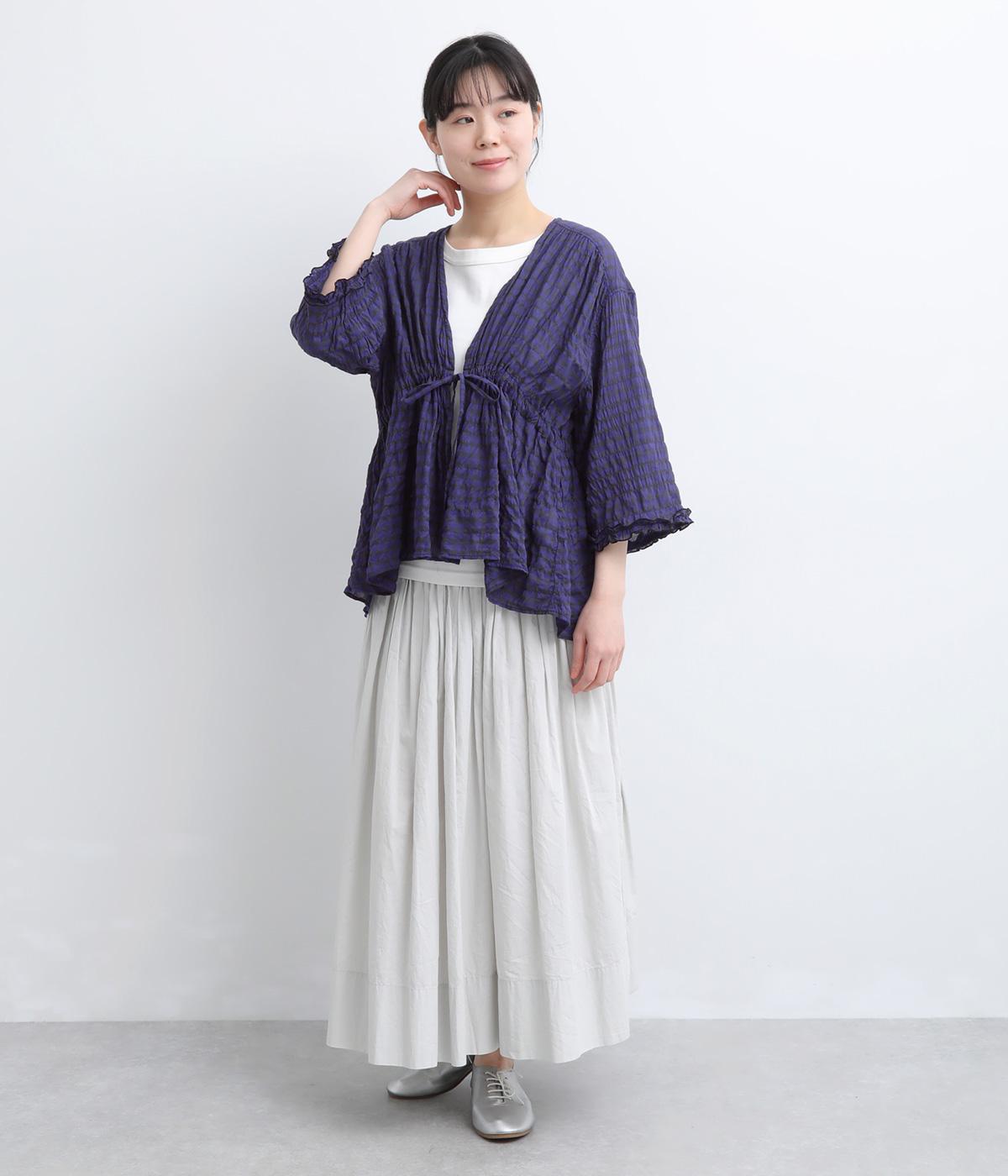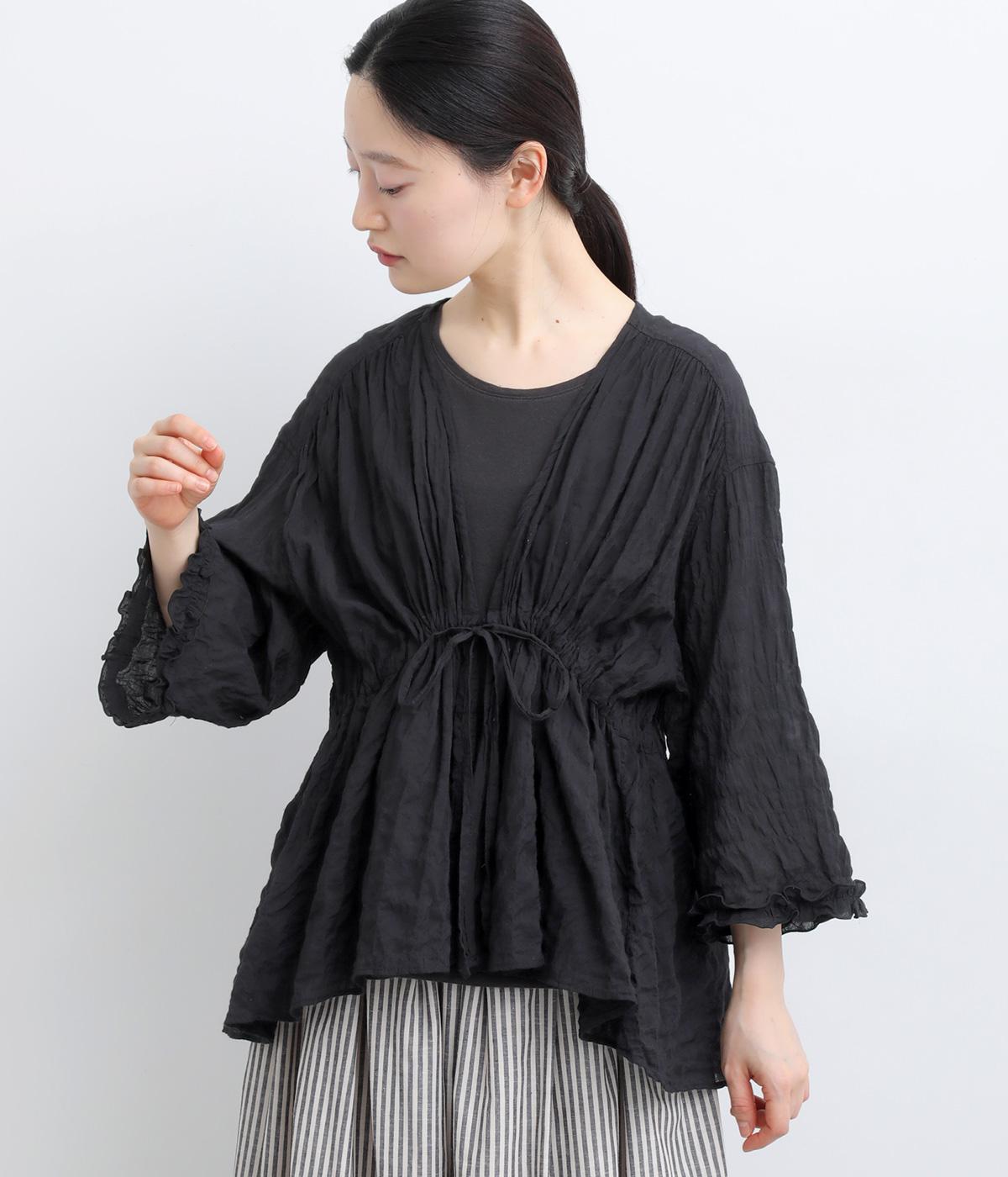 シャーリングの凹凸が、立体的な表情を添えるデザインです。フロントの紐をむすんでVネック風に着たり、あけて羽織り風に着たりと、アレンジできるのがうれしいポイント。袖口のフリルが、さりげない華やかさをプラスします。ゆとりのある身幅ながら、ほどよい丈感なので、ボリュームのあるボトムスとも好相性です。