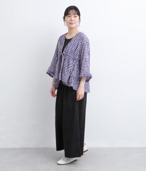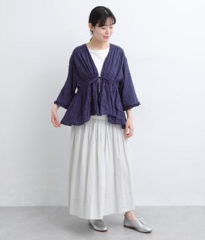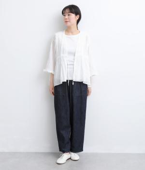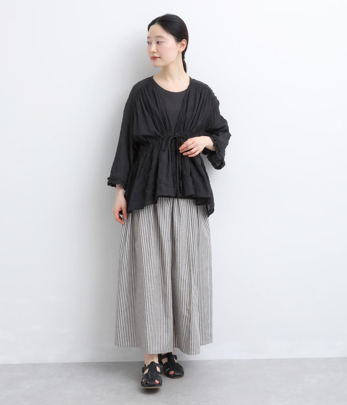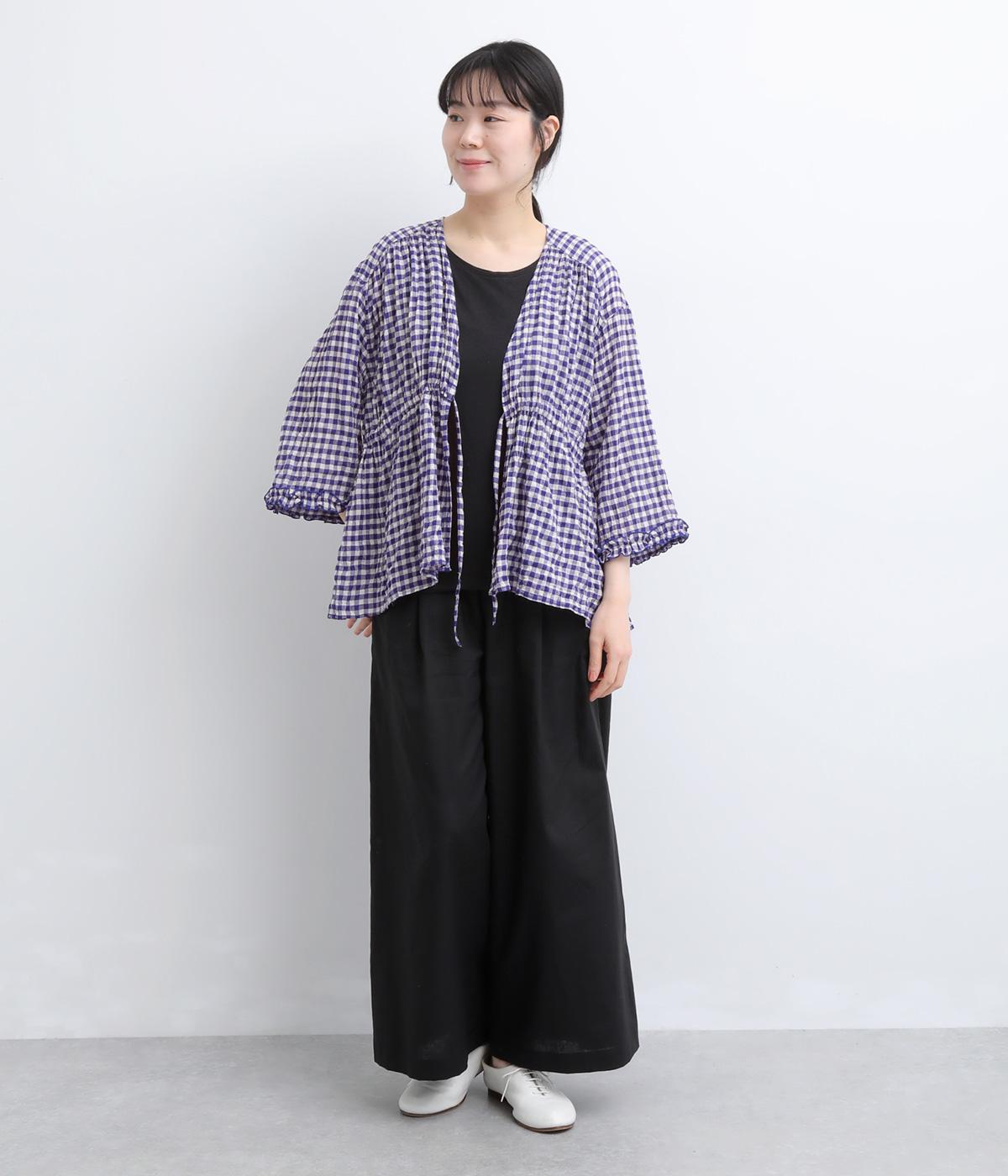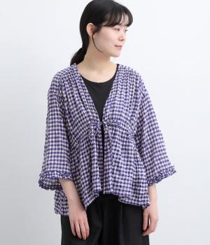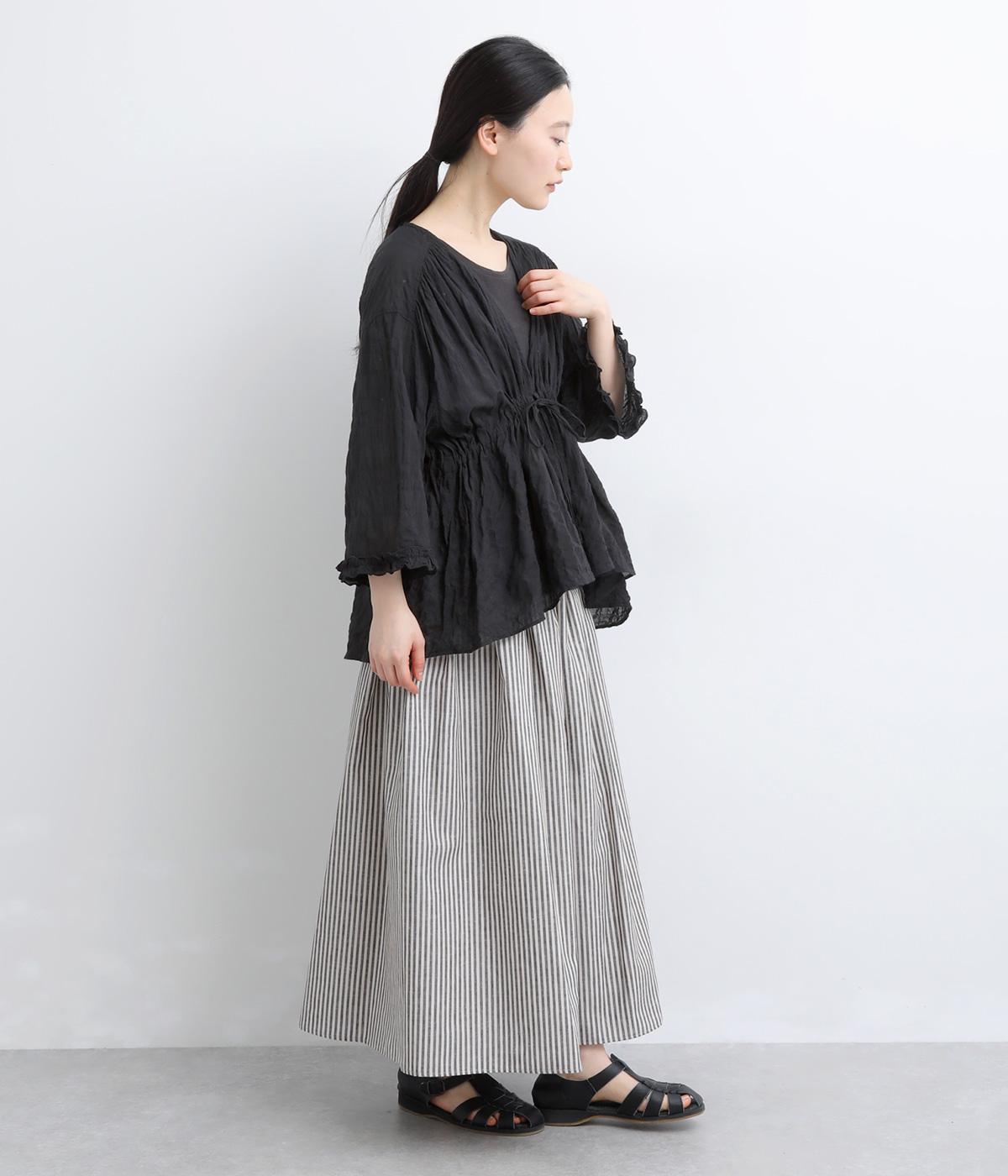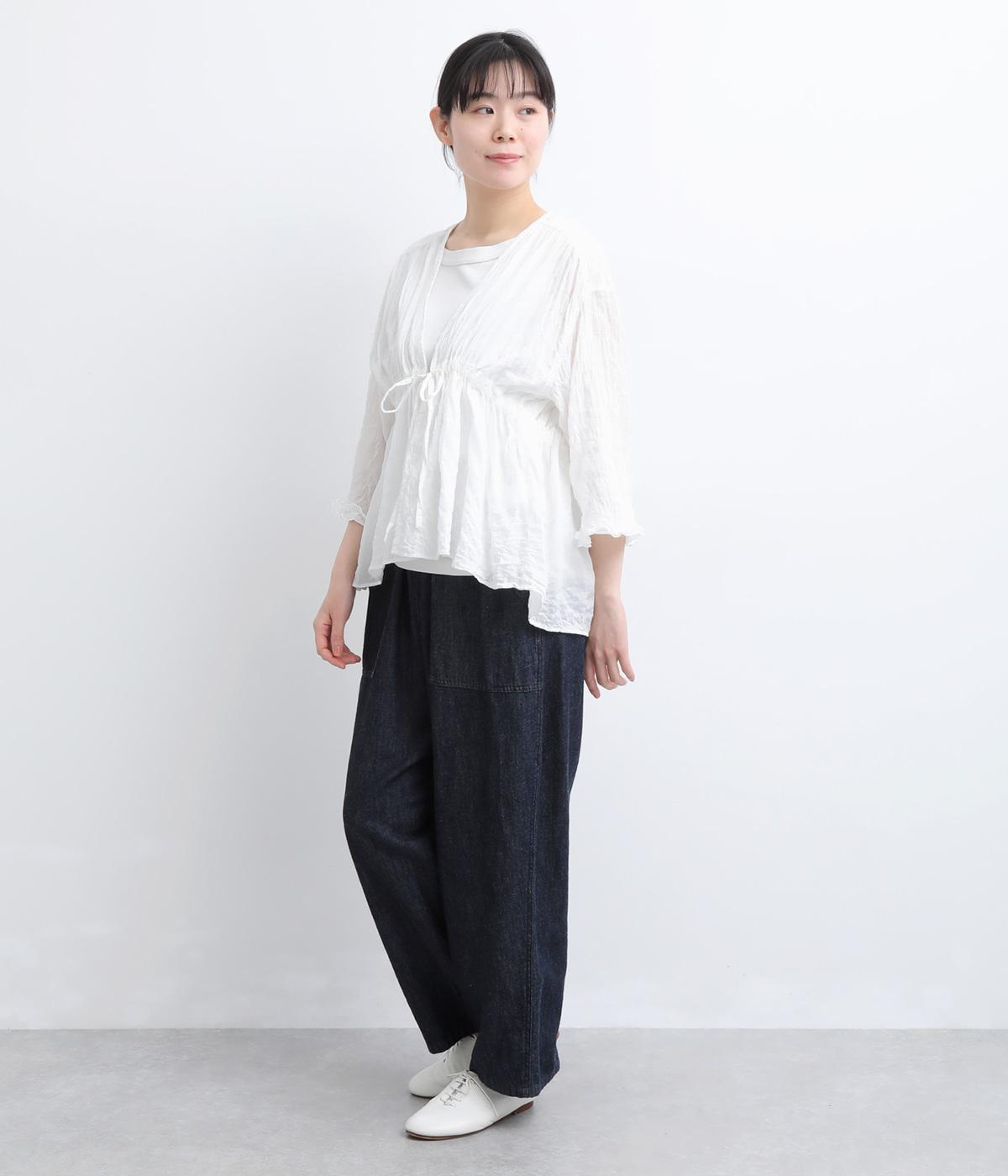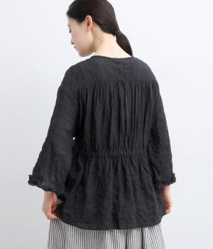 シャーリングの凹凸が、立体的な表情を添えるデザインです。フロントの紐をむすんでVネック風に着たり、あけて羽織り風に着たりと、アレンジできるのがうれしいポイント。袖口のフリルが、さりげない華やかさをプラスします。ゆとりのある身幅ながら、ほどよい丈感なので、ボリュームのあるボトムスとも好相性です。