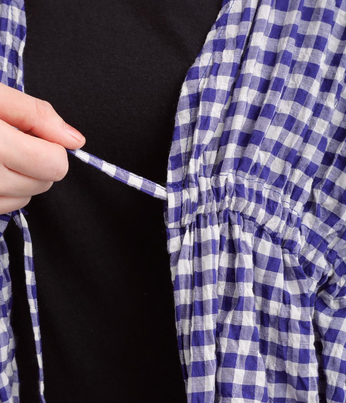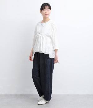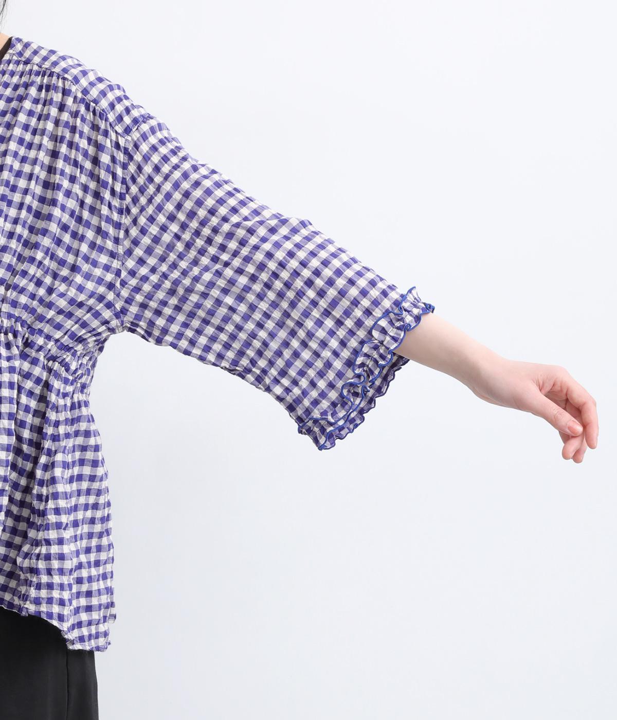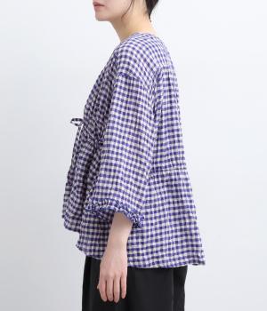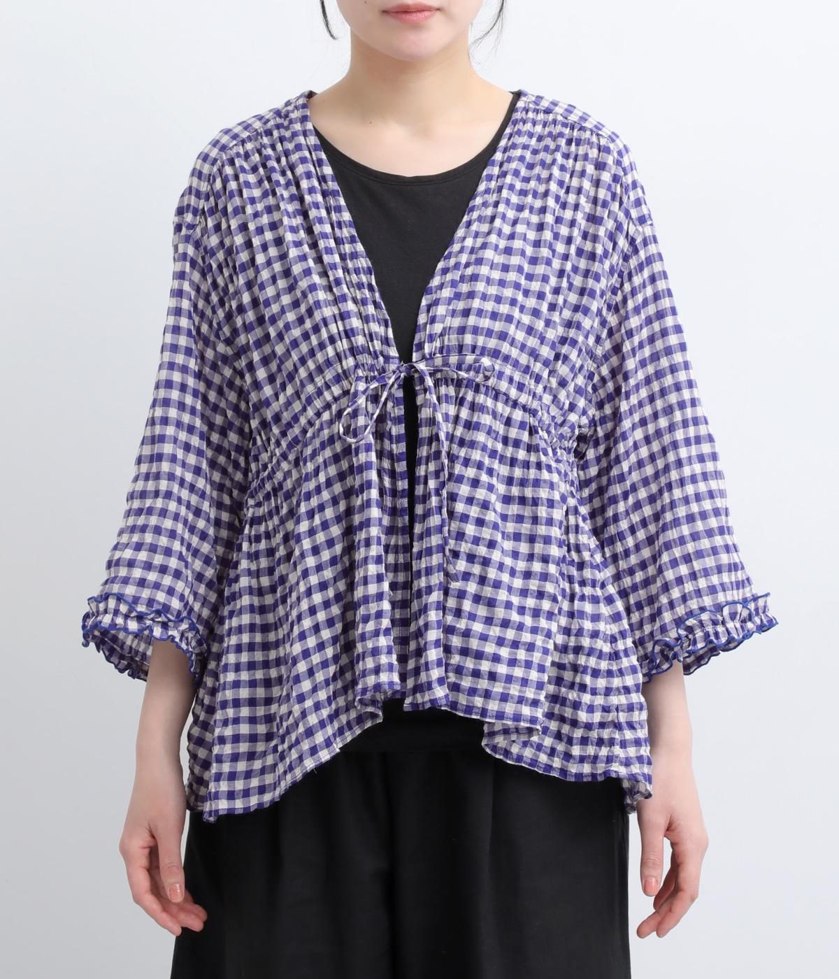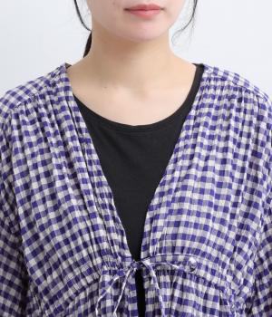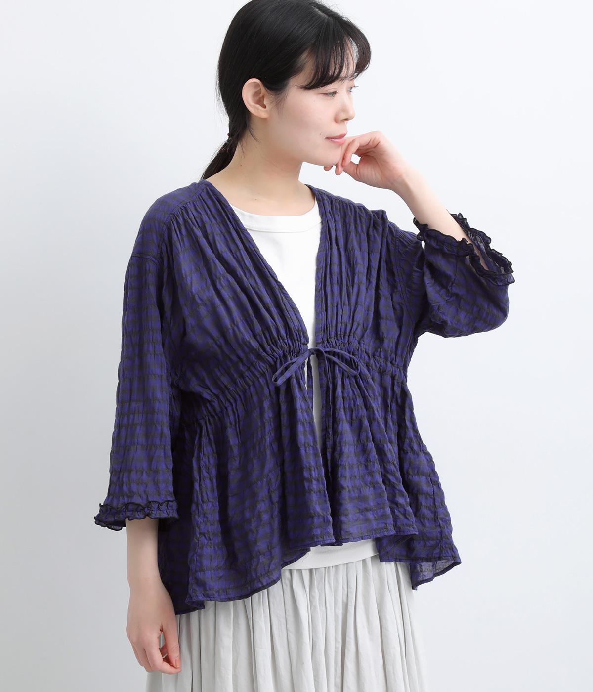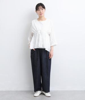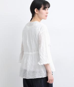 シャーリングの凹凸が、立体的な表情を添えるデザインです。フロントの紐をむすんでVネック風に着たり、あけて羽織り風に着たりと、アレンジできるのがうれしいポイント。袖口のフリルが、さりげない華やかさをプラスします。ゆとりのある身幅ながら、ほどよい丈感なので、ボリュームのあるボトムスとも好相性です。