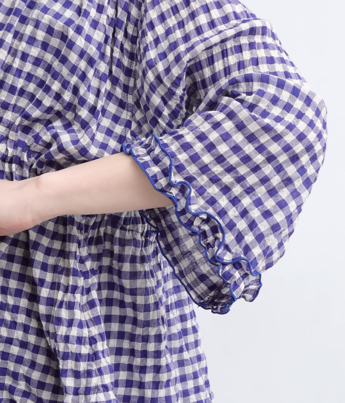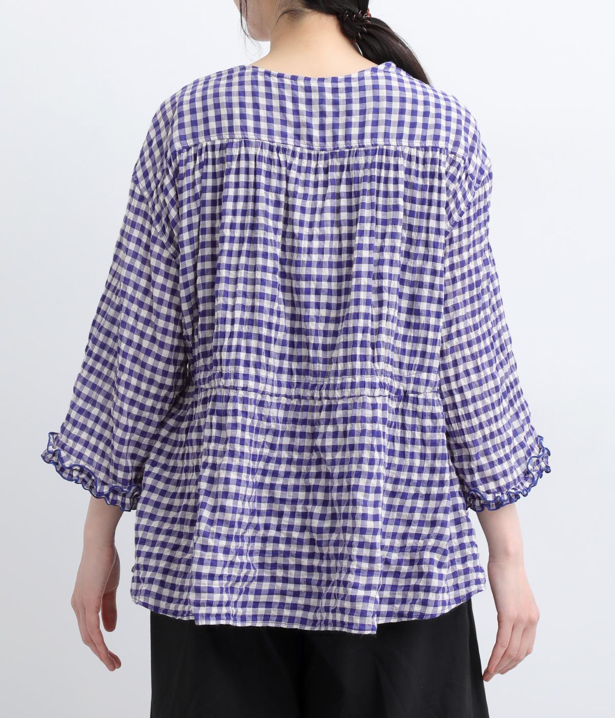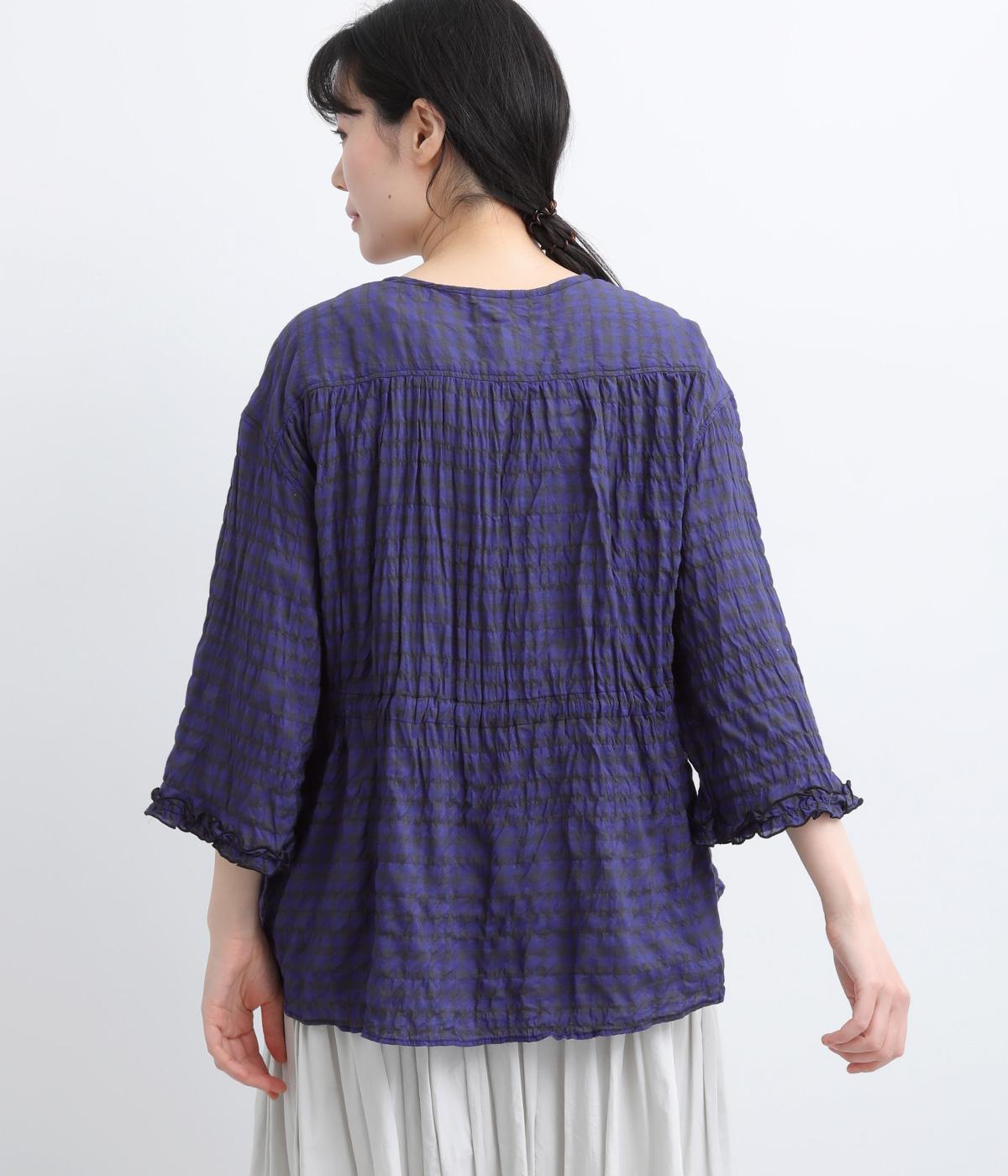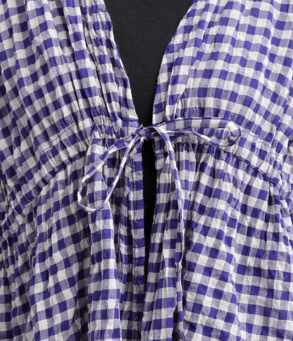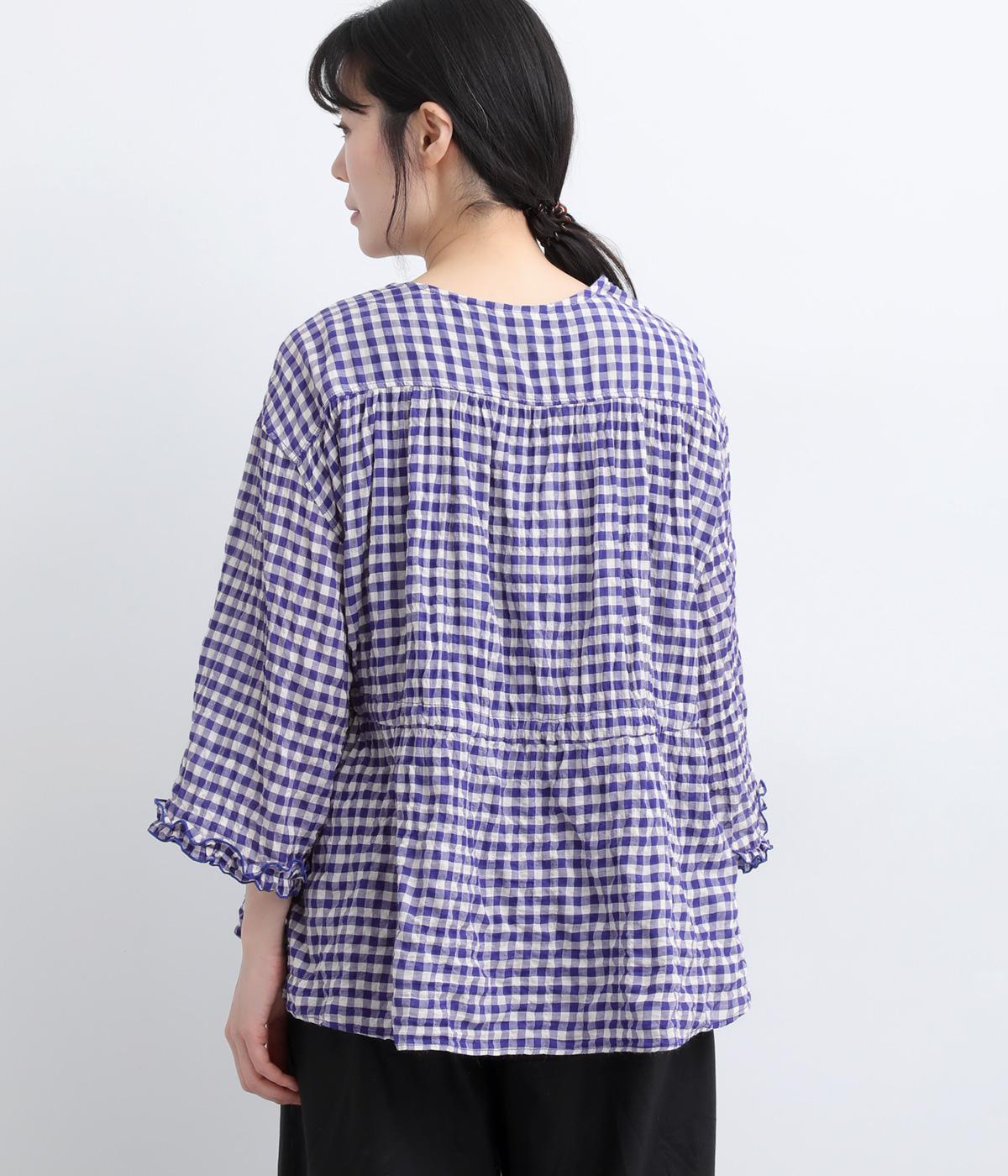 シャーリングの凹凸が、立体的な表情を添えるデザインです。フロントの紐をむすんでVネック風に着たり、あけて羽織り風に着たりと、アレンジできるのがうれしいポイント。袖口のフリルが、さりげない華やかさをプラスします。ゆとりのある身幅ながら、ほどよい丈感なので、ボリュームのあるボトムスとも好相性です。