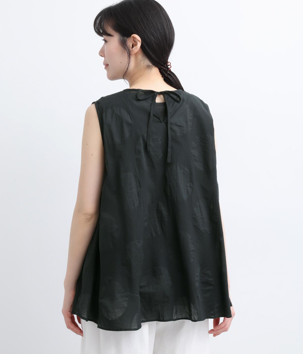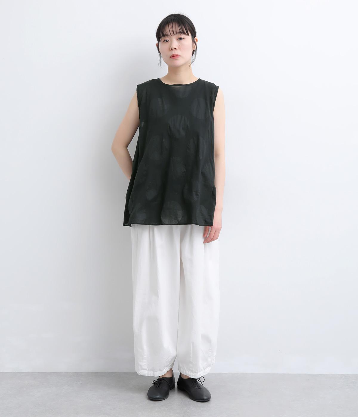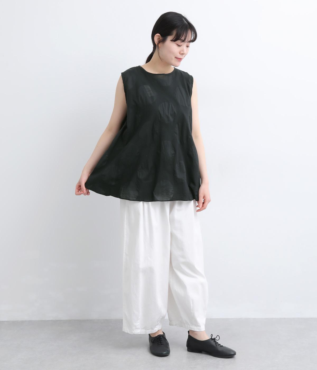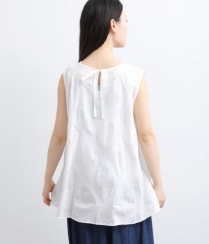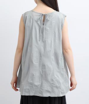 ジャカード織りで表現したさりげないドット柄が印象的な、ノースリーブブラウスです。柄に立体感があり、光のあたり方で表情が変わるのも魅力。ゆったりと広がるAラインシルエットが、体のラインをカバーします。ネックのうしろはリボン仕様で、大人の装いにも合わせやすい、ほどよい甘さを添えました。