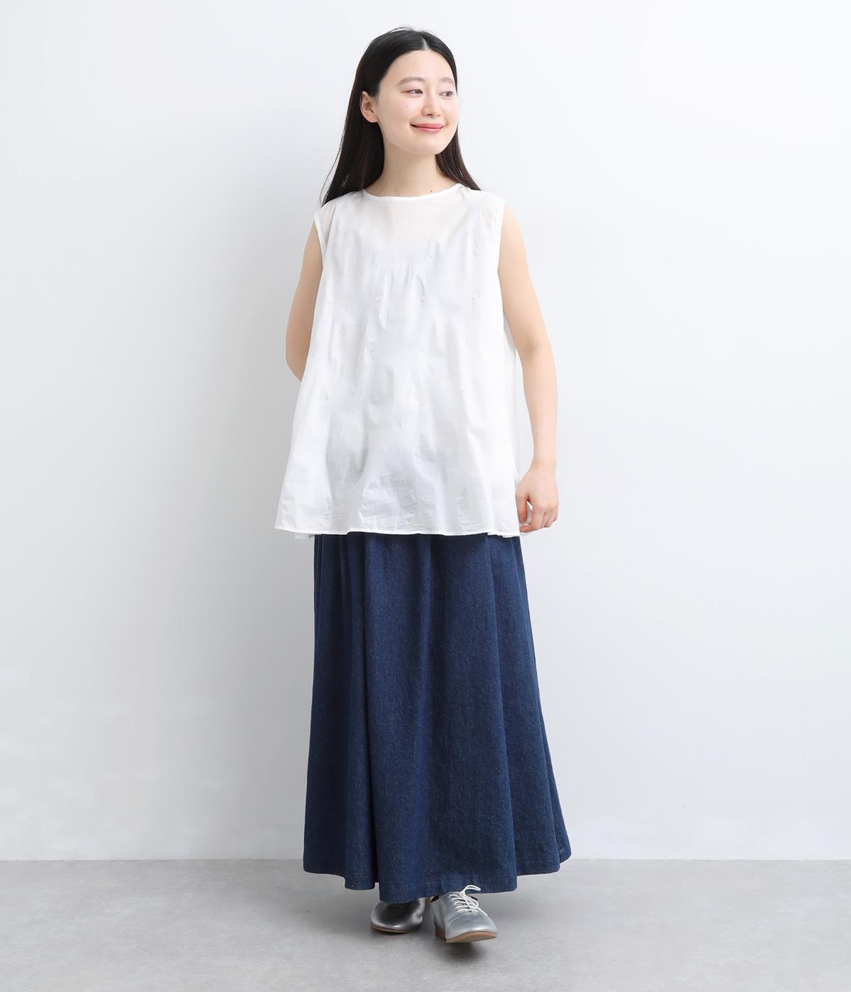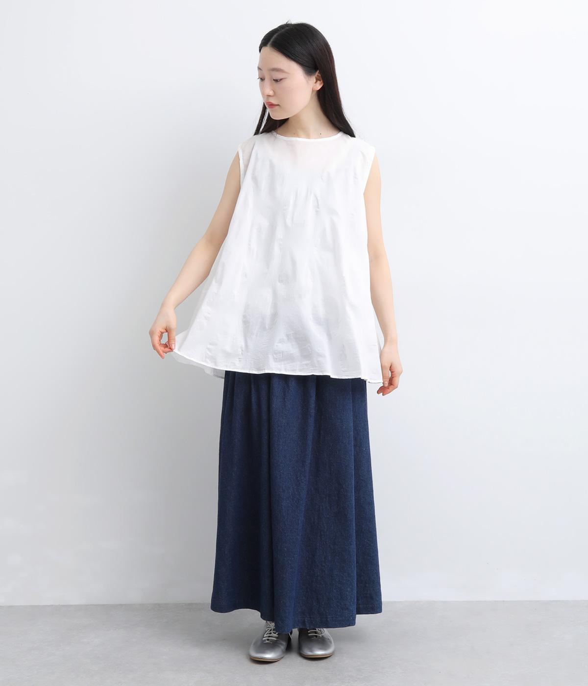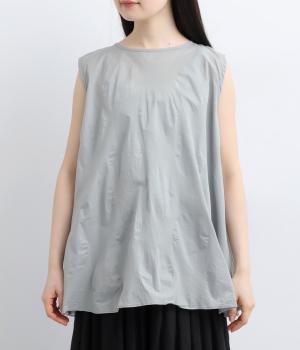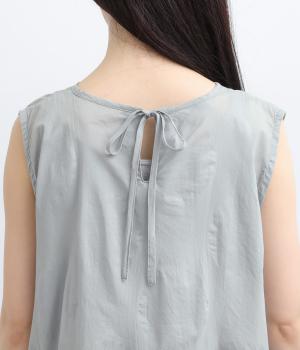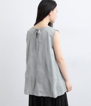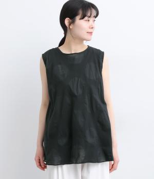 ジャカード織りで表現したさりげないドット柄が印象的な、ノースリーブブラウスです。柄に立体感があり、光のあたり方で表情が変わるのも魅力。ゆったりと広がるAラインシルエットが、体のラインをカバーします。ネックのうしろはリボン仕様で、大人の装いにも合わせやすい、ほどよい甘さを添えました。