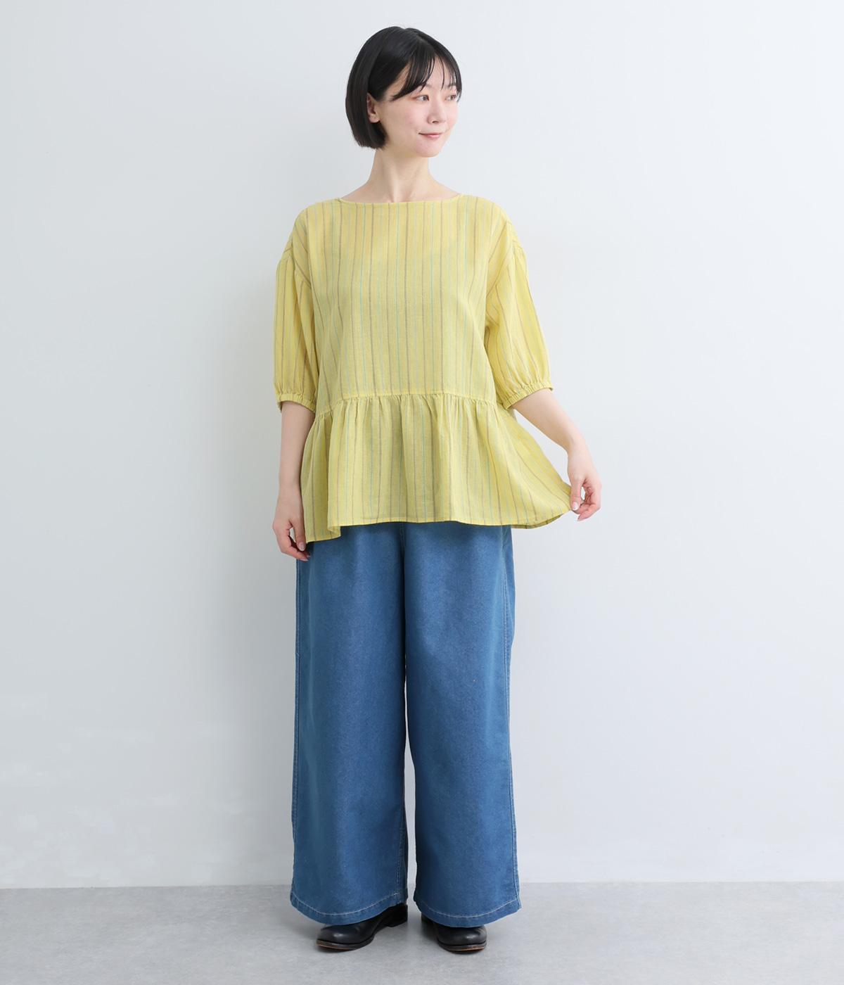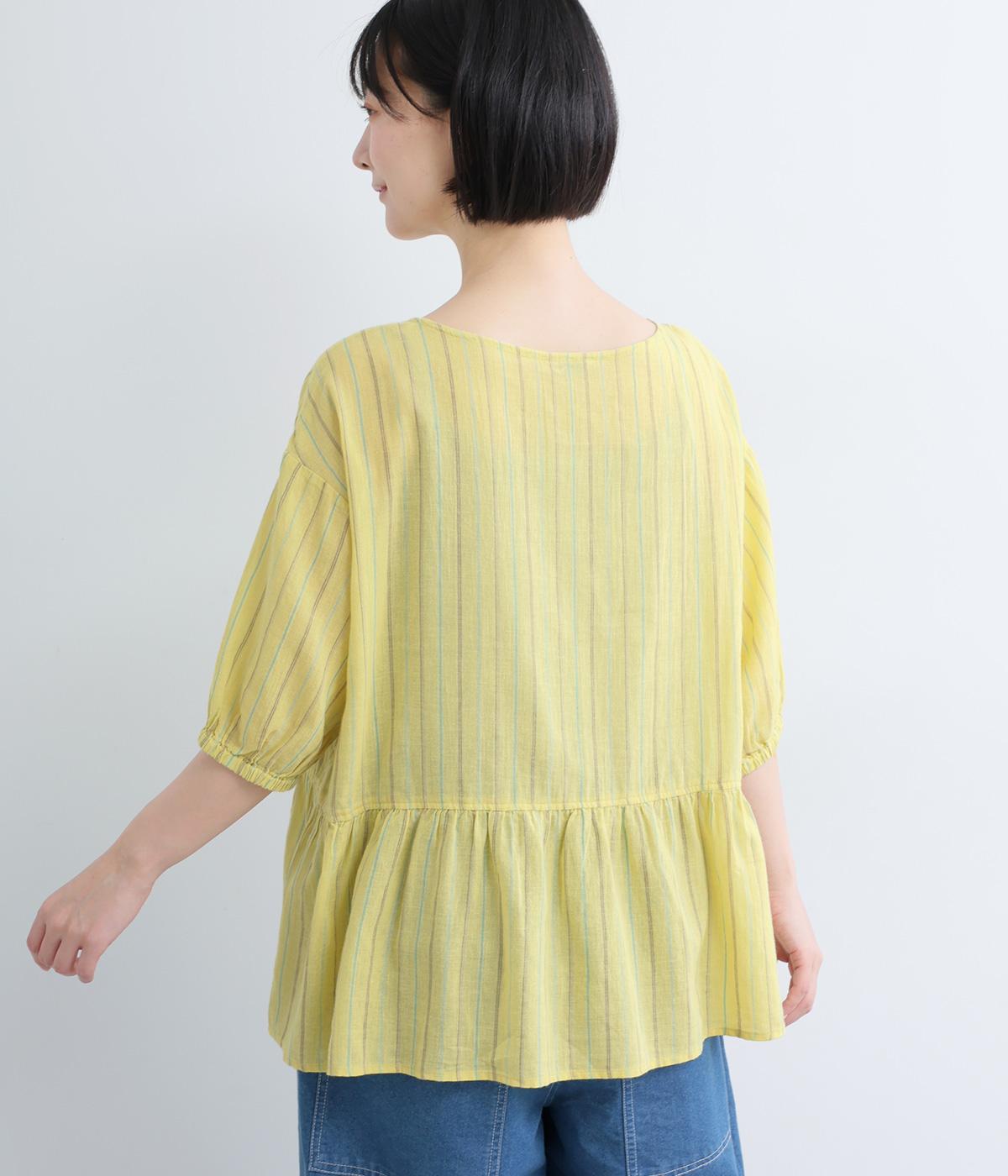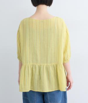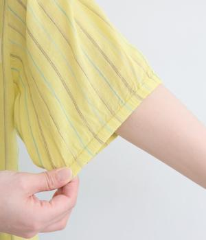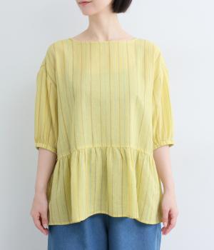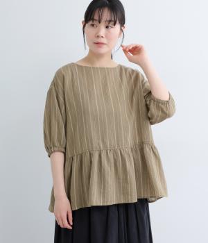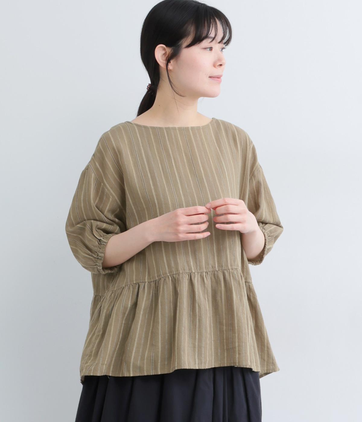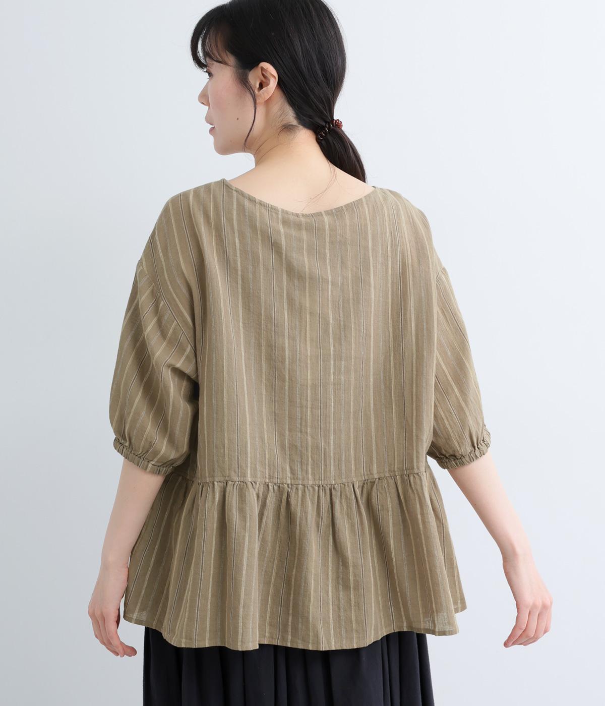 ナチュラルな素材にストライプがさわやかに映えるワブラウス。ウエストまわりのギャザーが優雅なラインを描きます。袖口にはゴムを配し、たくしあげても◎。フェミニンなスカートにもカジュアルなパンツにもなじむ一枚です。