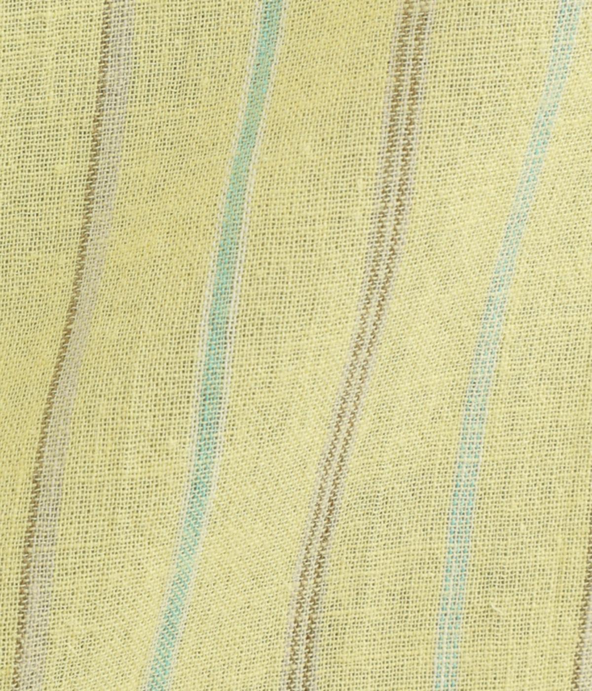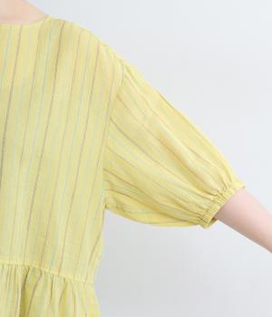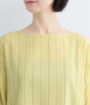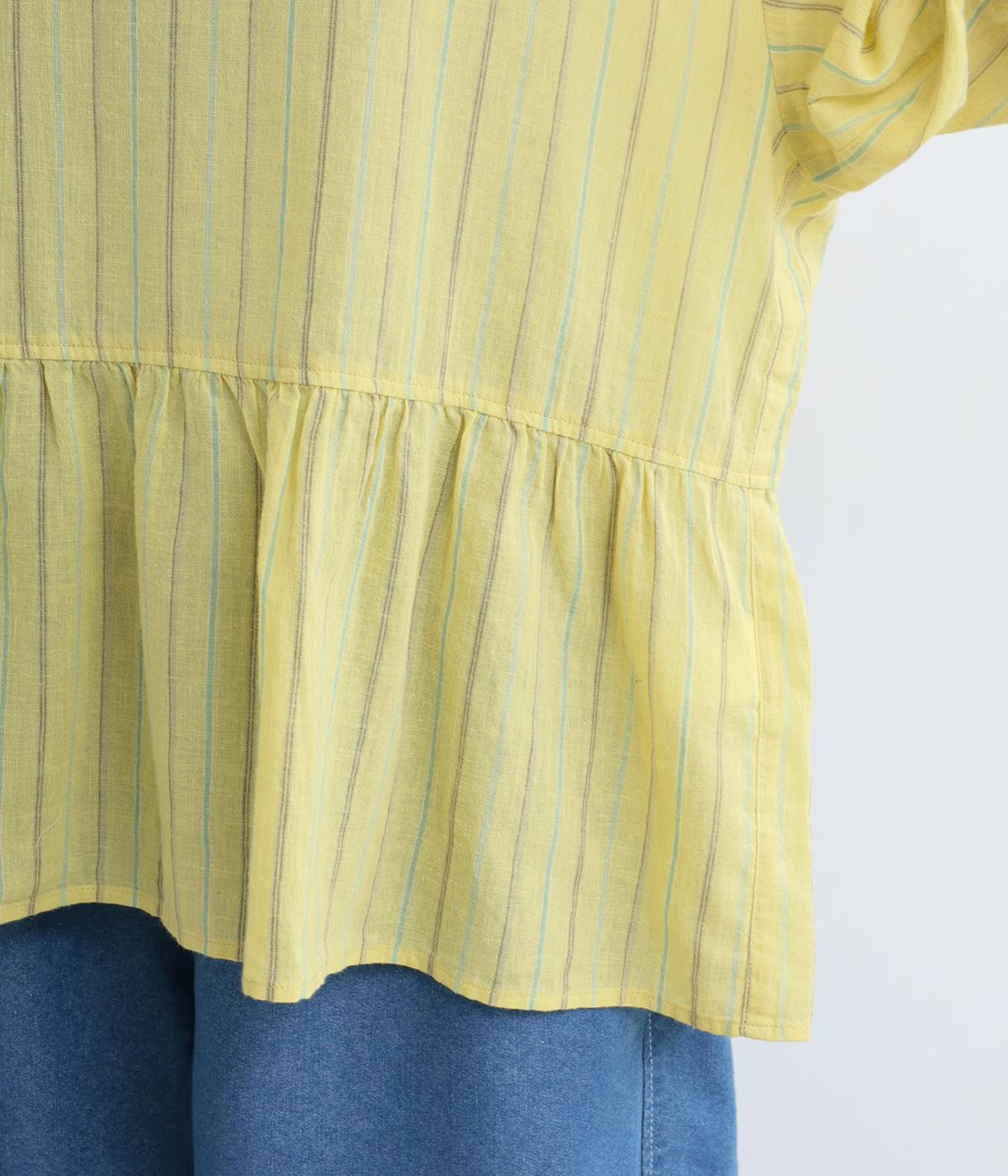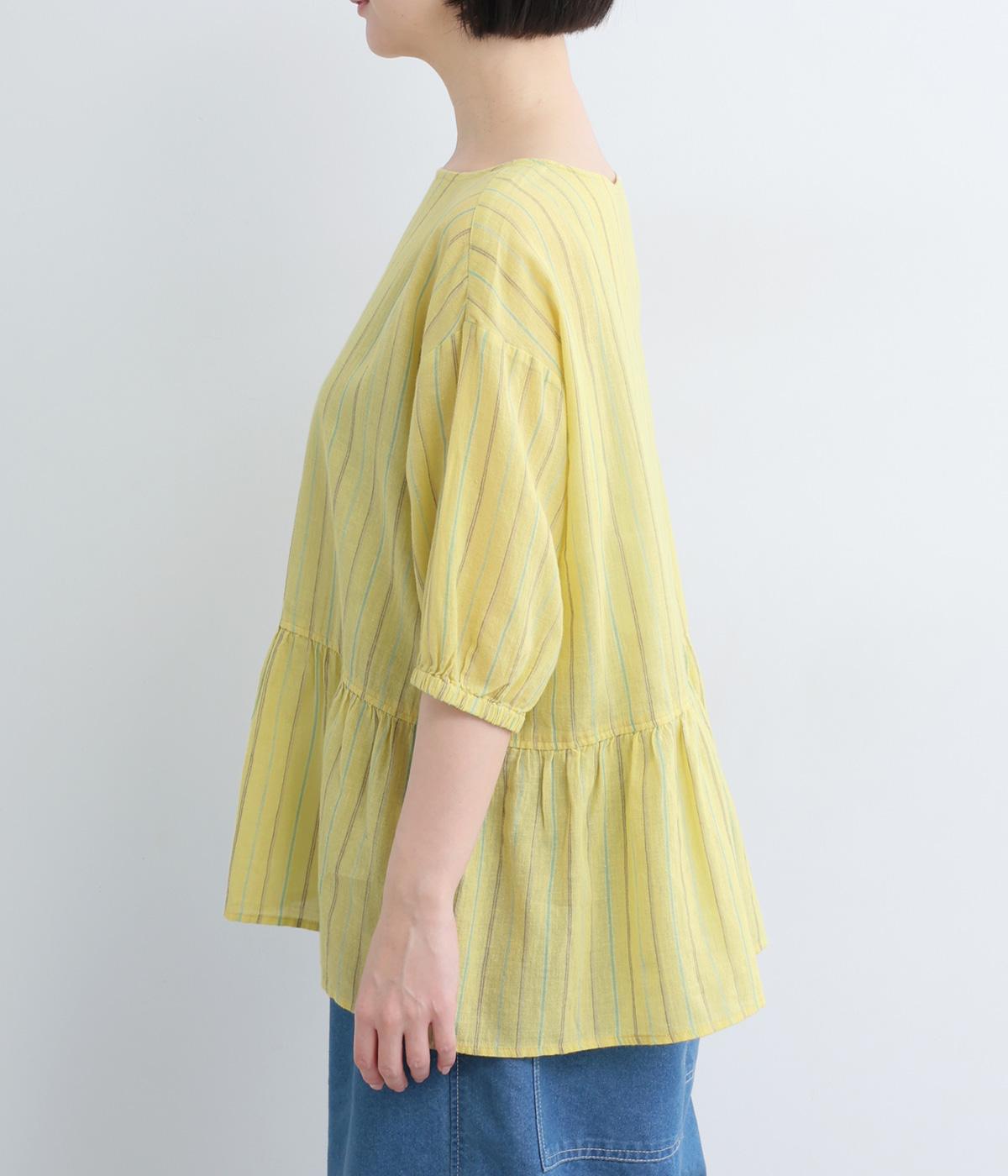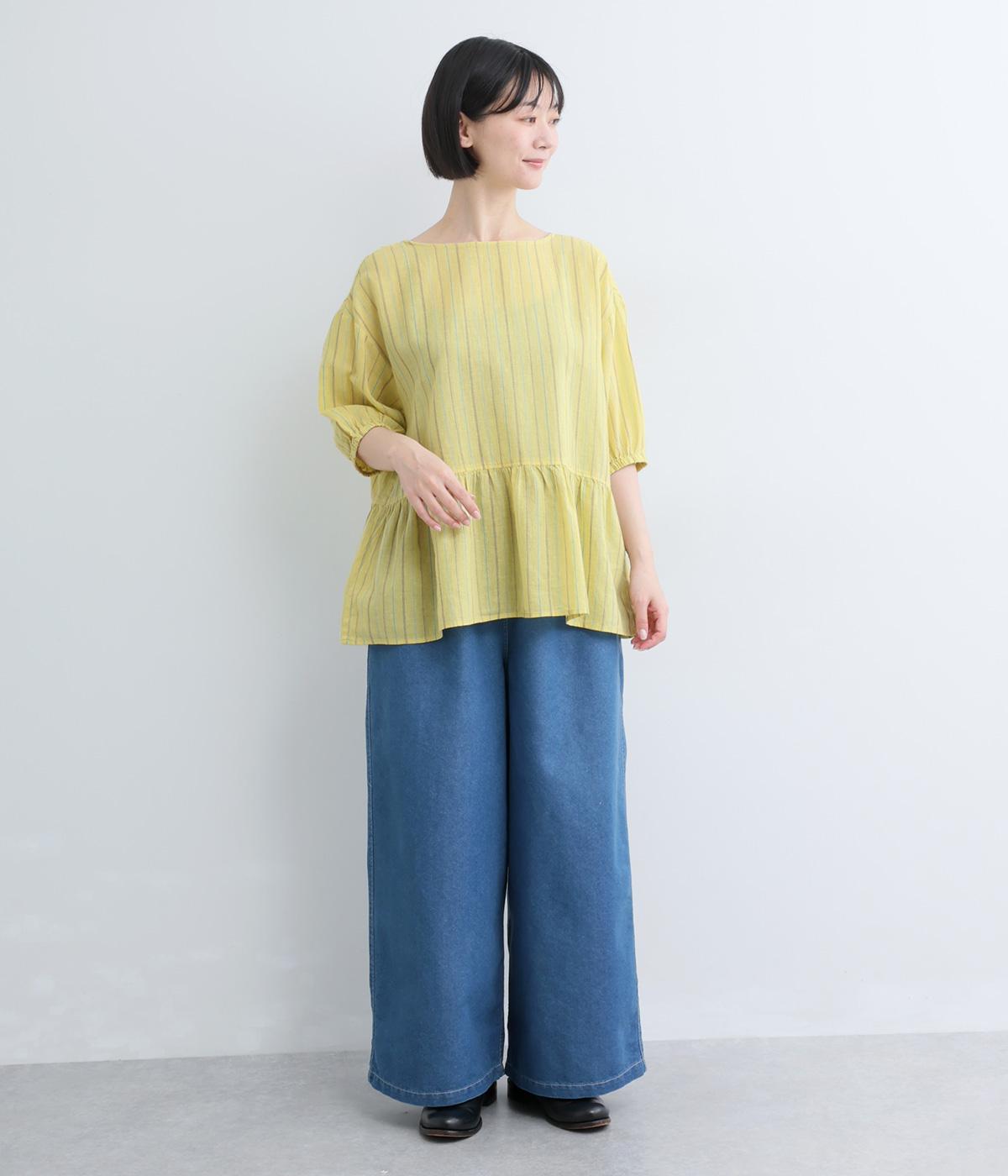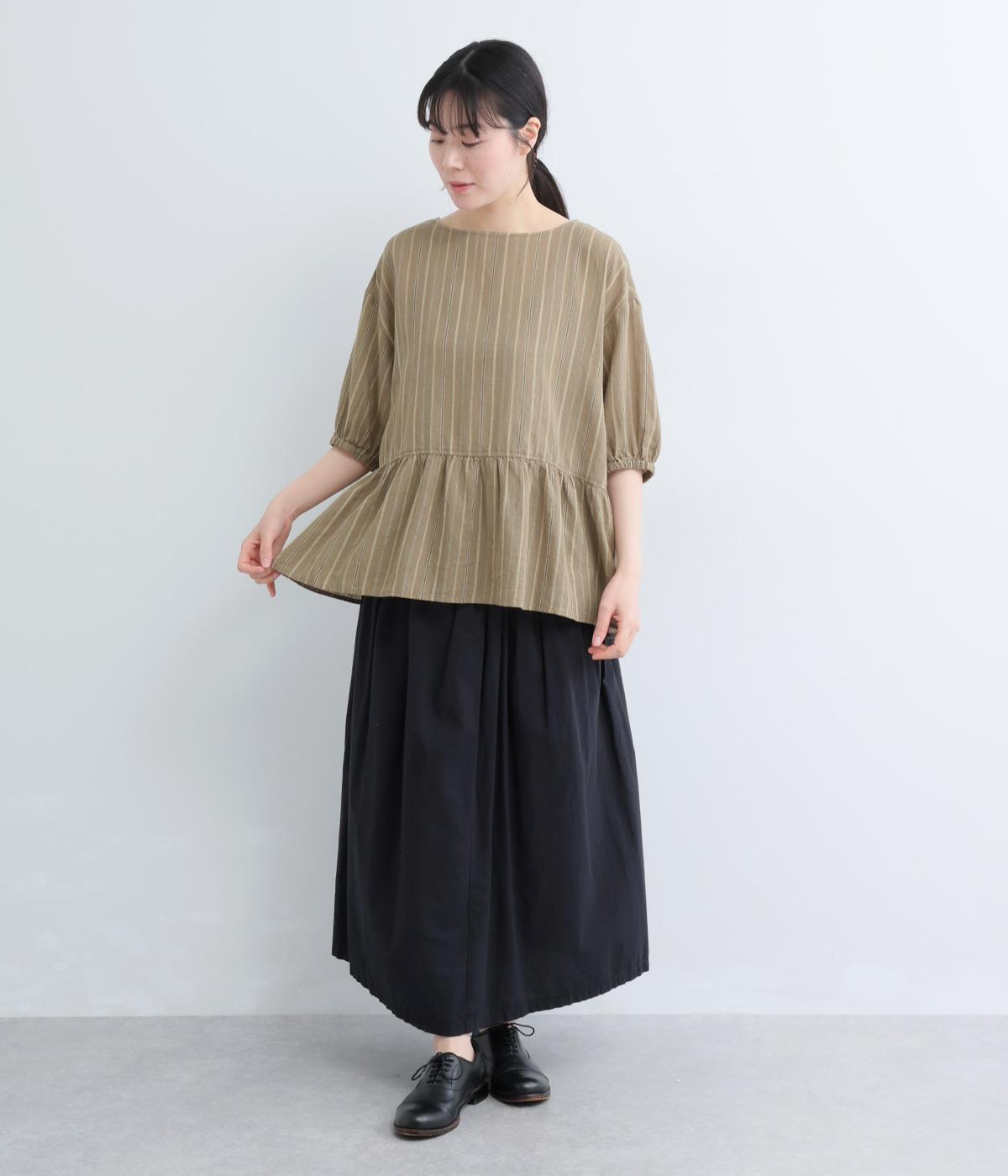 ナチュラルな素材にストライプがさわやかに映えるワブラウス。ウエストまわりのギャザーが優雅なラインを描きます。袖口にはゴムを配し、たくしあげても◎。フェミニンなスカートにもカジュアルなパンツにもなじむ一枚です。