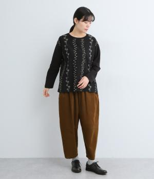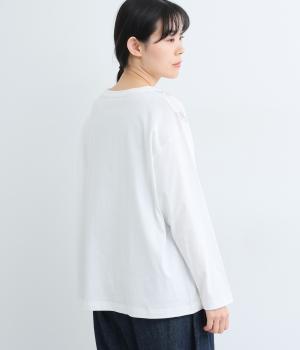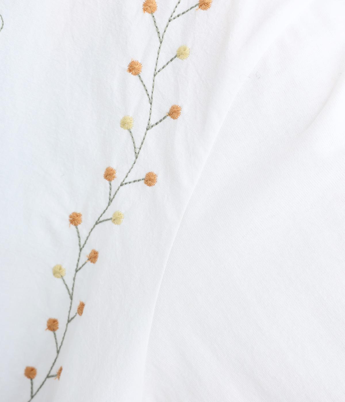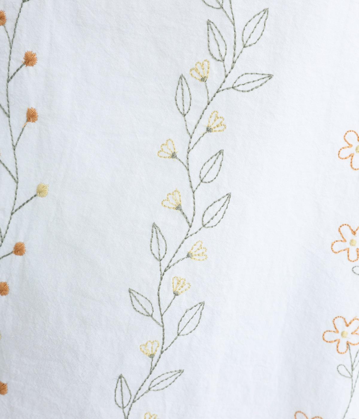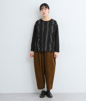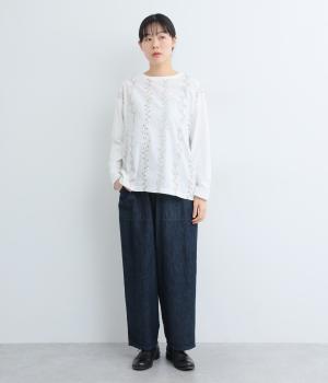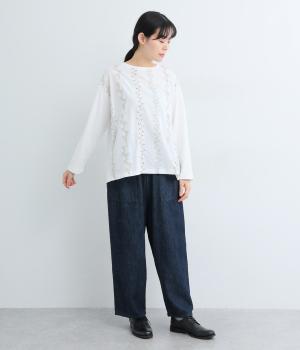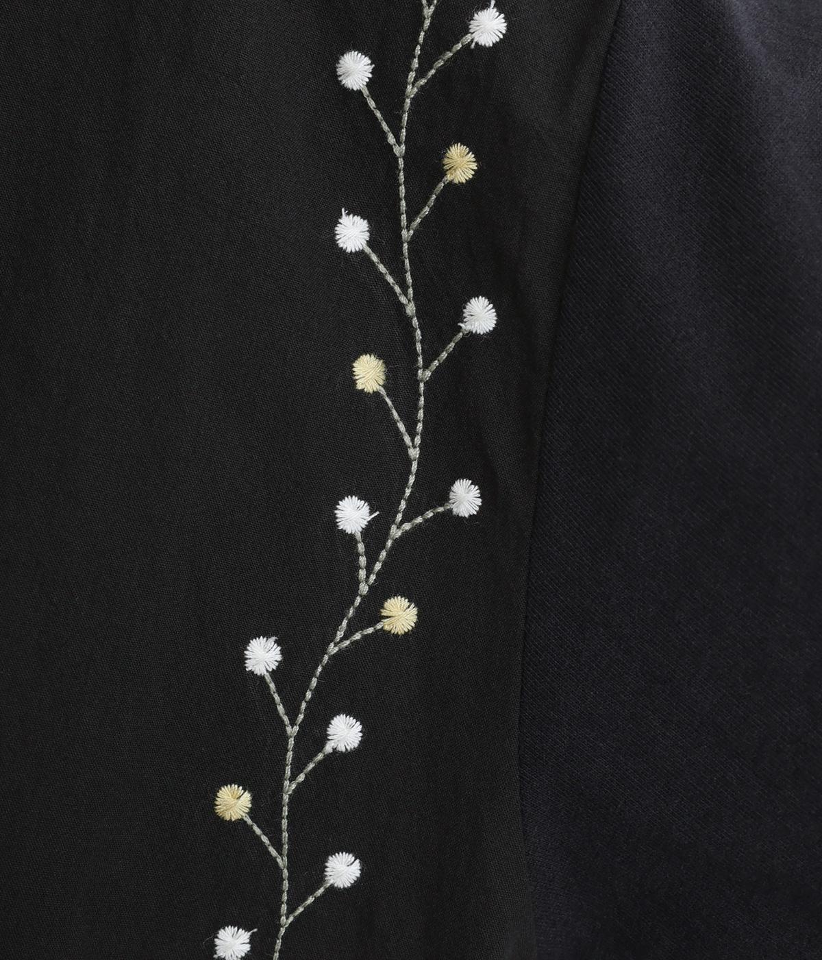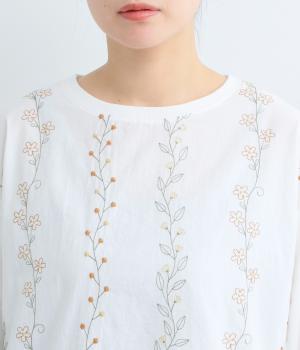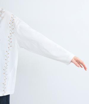 前身頃には型崩れやシワになりづらい布帛、袖周りや後ろ身頃はやわらかいコットンのカットソー地で、使いやすさと着やすさを両立しました。前面には細やかなお花ししゅうをほどこしています。