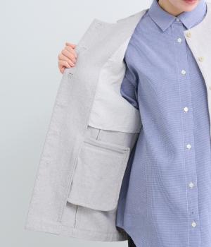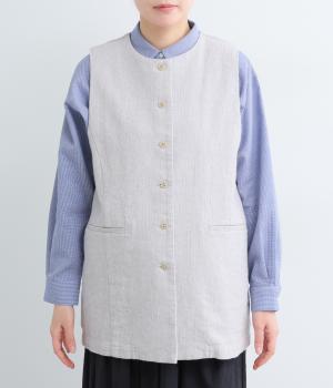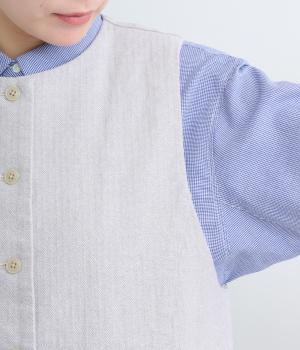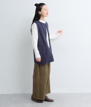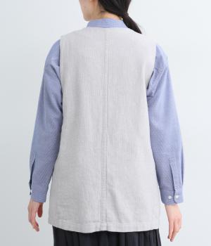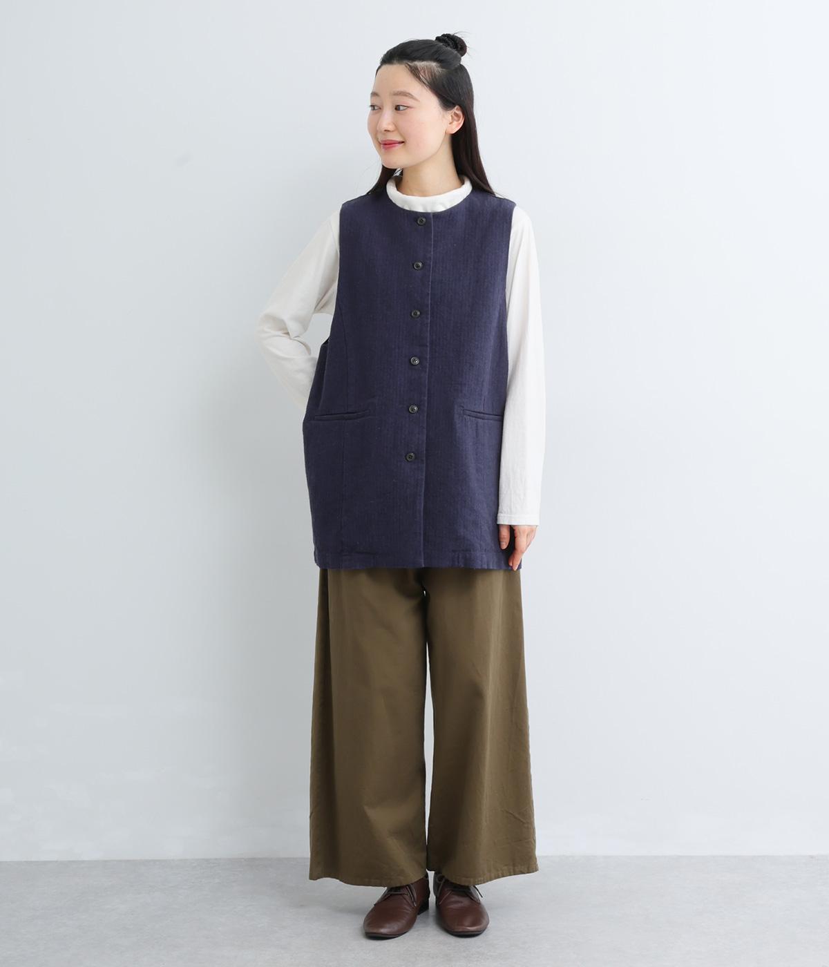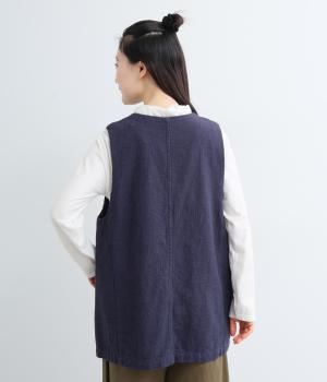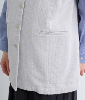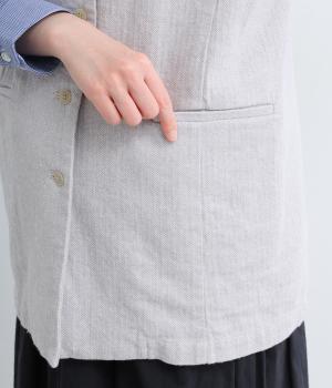 綿麻糸をヘリンボーンパターンに織り上げたツイードライクな素材です。肌寒い季節でも適度な暖かさとナチュラルな質感を持ち合わせています。裏地付きで着心地も快適です。