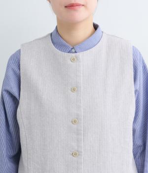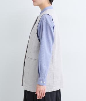 クルーネックのすっきりとしたシルエットで仕上げたベスト。ツイード調のマニッシュな雰囲気ながら、幅広いコーディネートに合わせやすい一着です。広めのアームホールでインナーを選ばず、前立てのボタンで着脱もスマートに決まります。