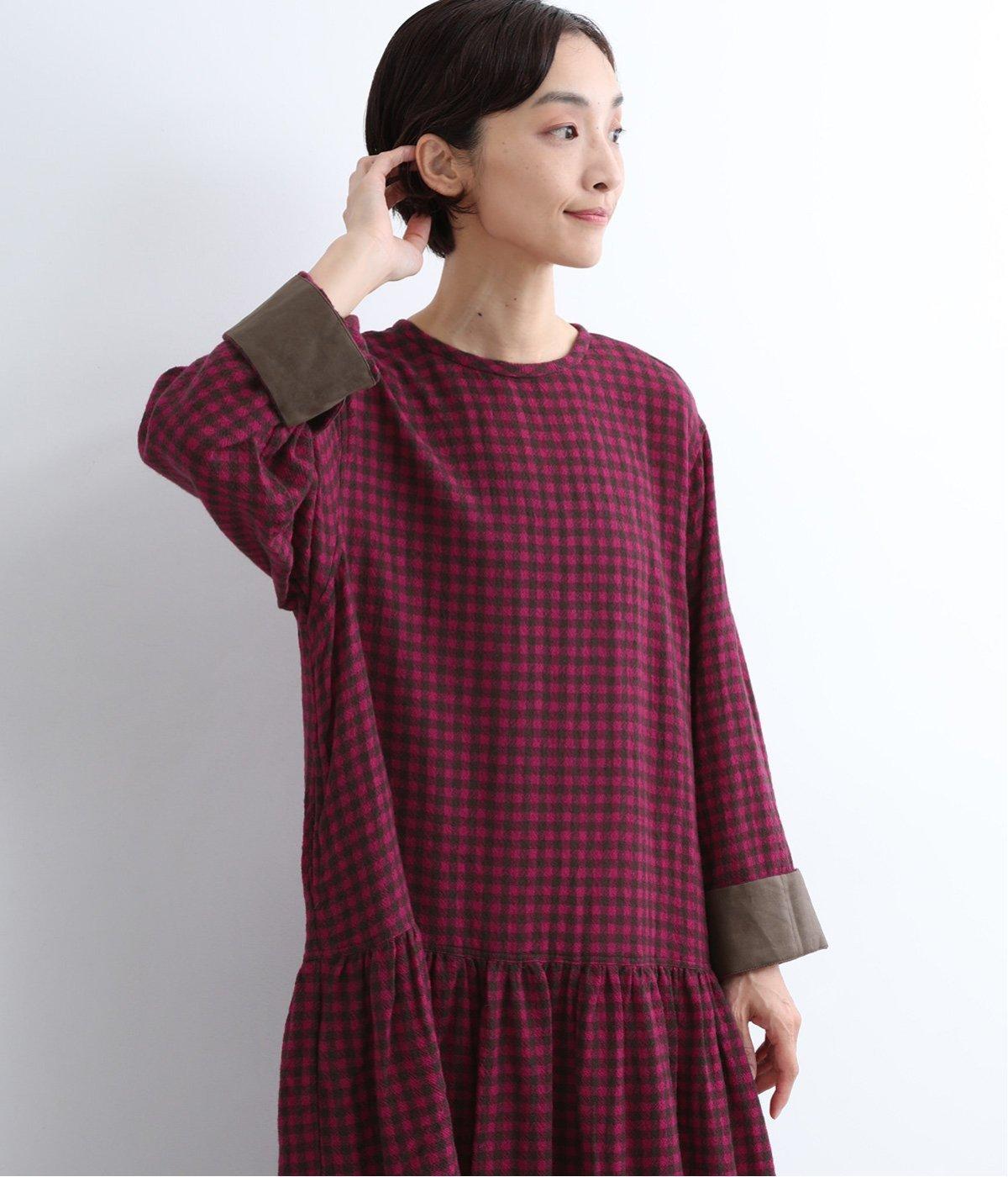 起毛感とチェック柄が表情豊かで、一枚着でスタイリングが完成する着映え力のあるワンピース。ギャザーでフレア感を出し、低めの位置で切り替えてリラックス感を演出。袖裏は無地の綿生地で、折り返してチラ見せするとちょうどいいアクセントに。