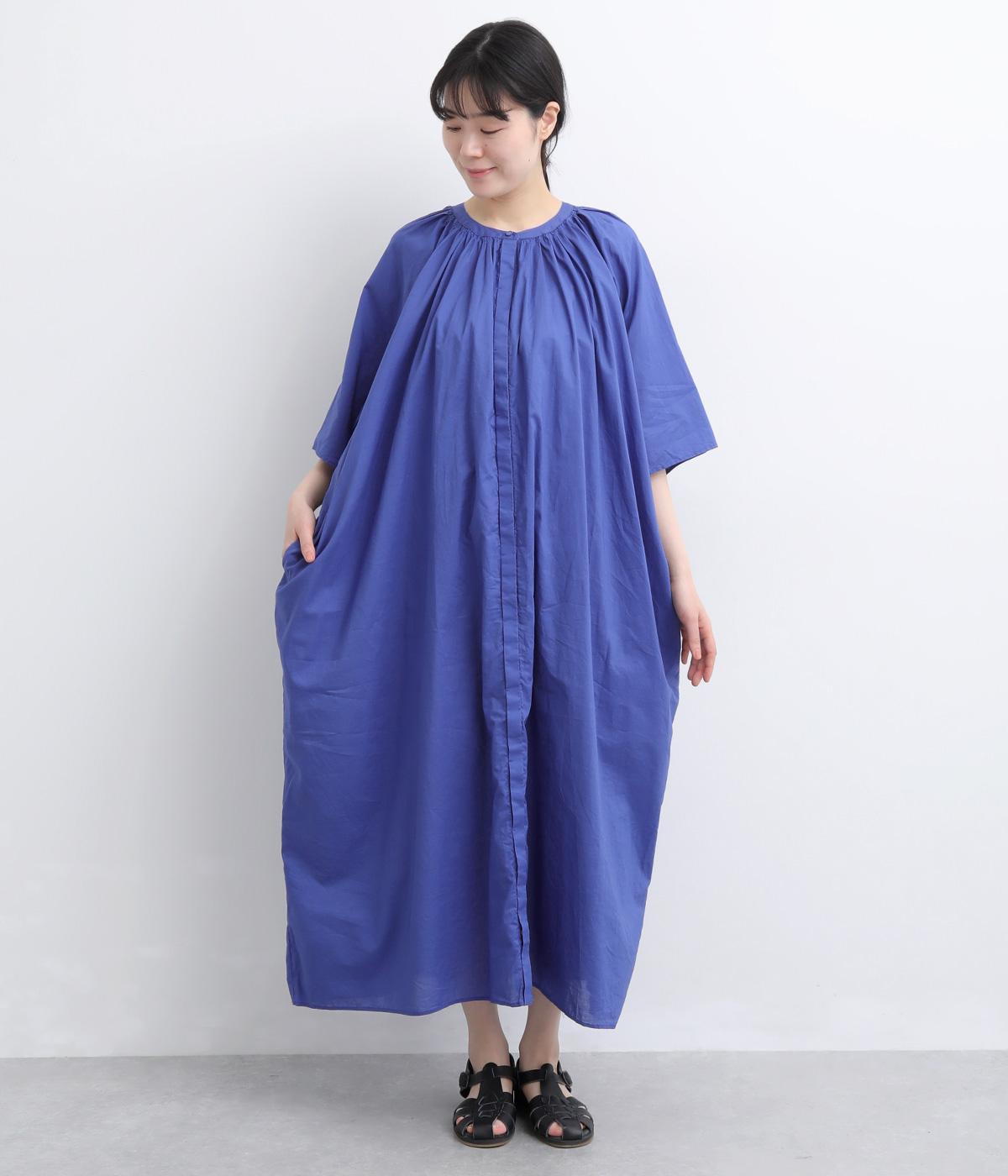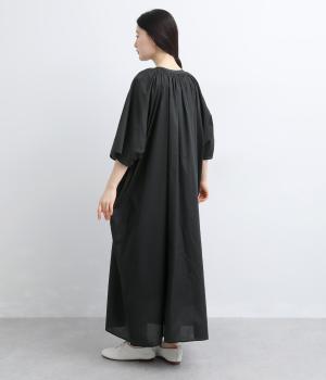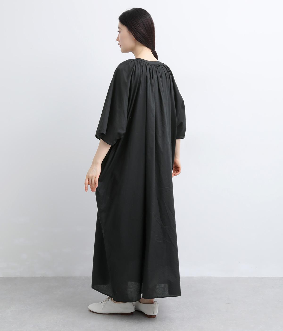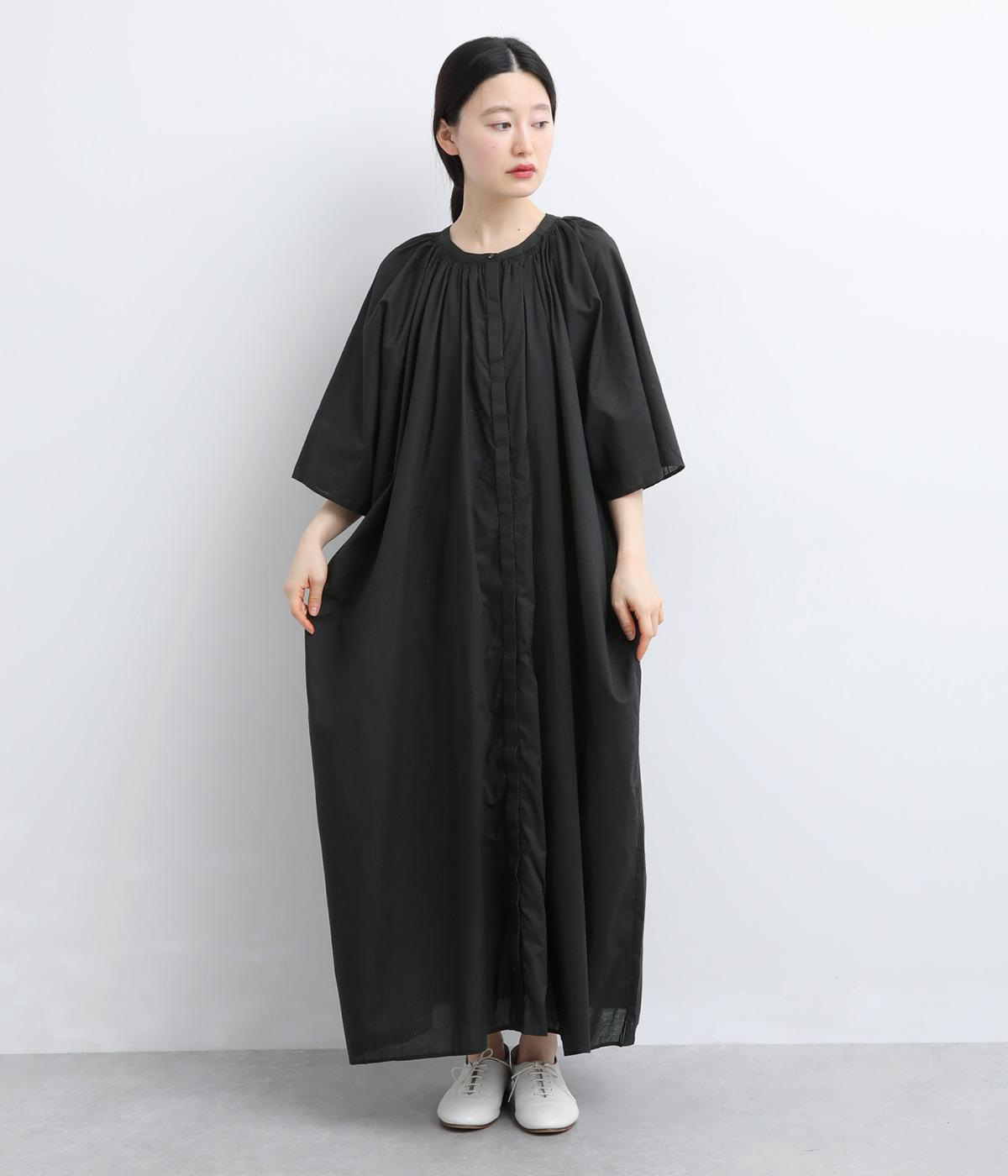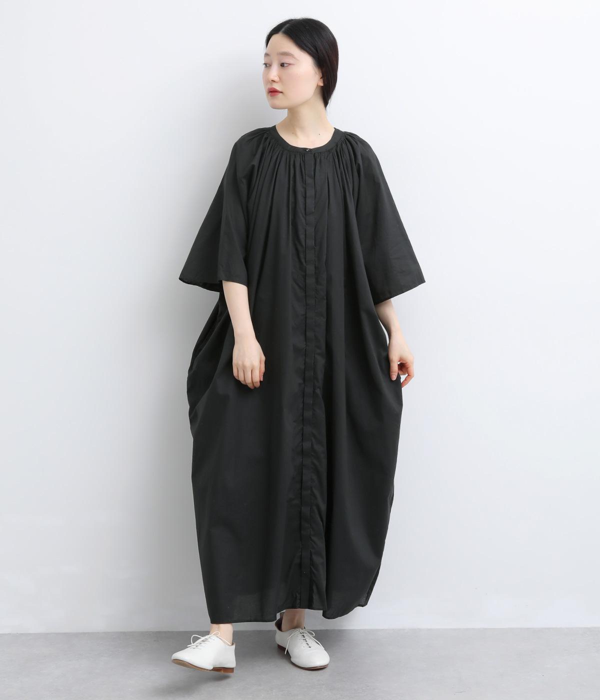 襟元の前後にたっぷりとギャザーを寄せた、ふんわりと広がるシルエットのワンピースです。ラグランスリーブで動きやすく、リラックス感のある着心地に仕上げました。フロントは比翼ボタンですっきりと整え、上品な印象もプラス。前をあけた羽織り風の着こなしもおすすめです。