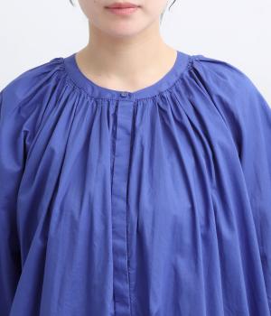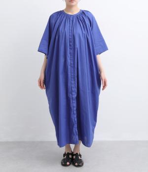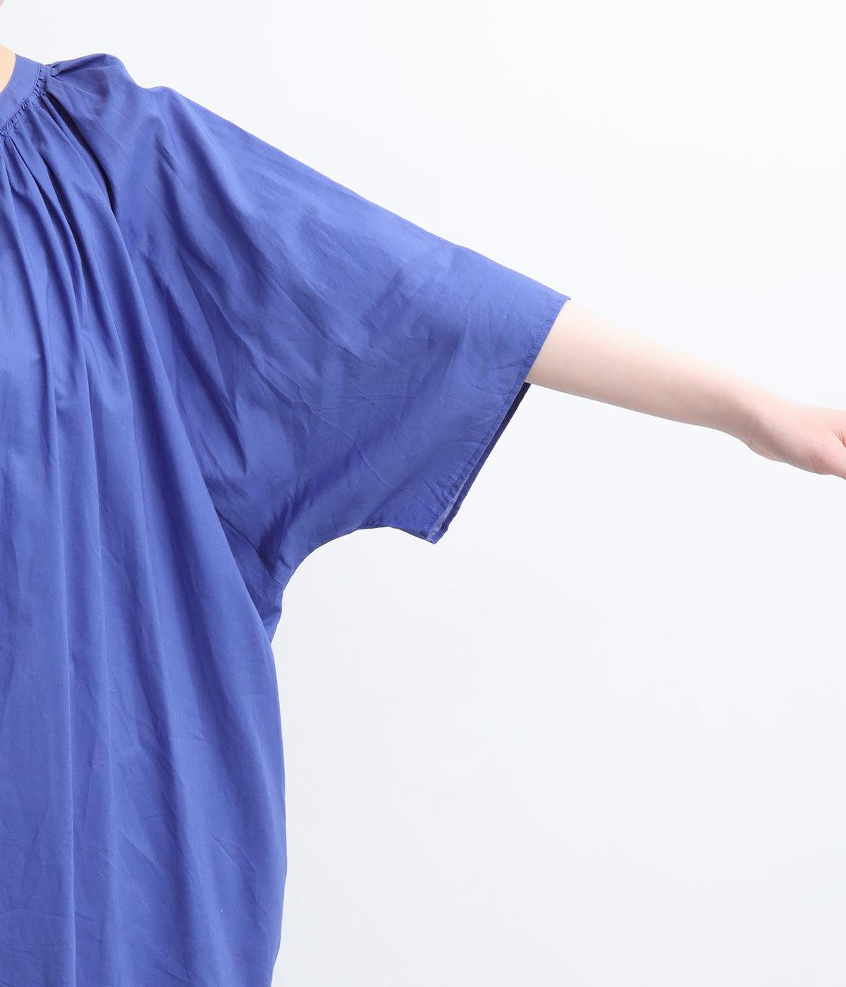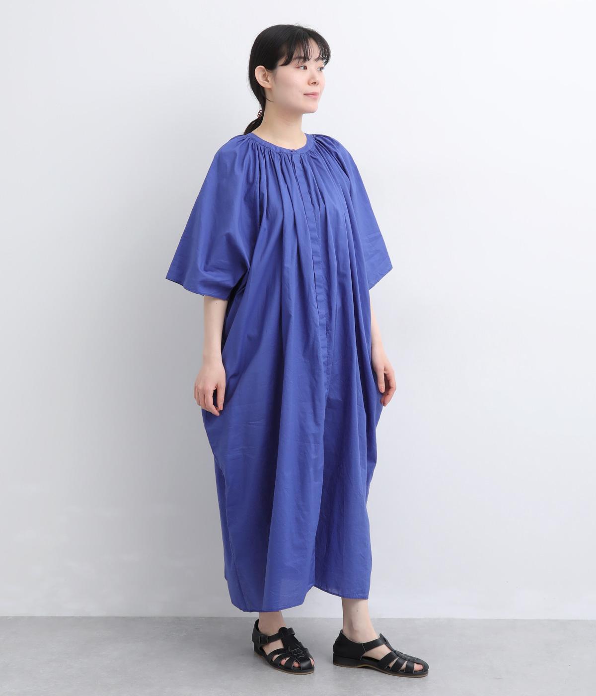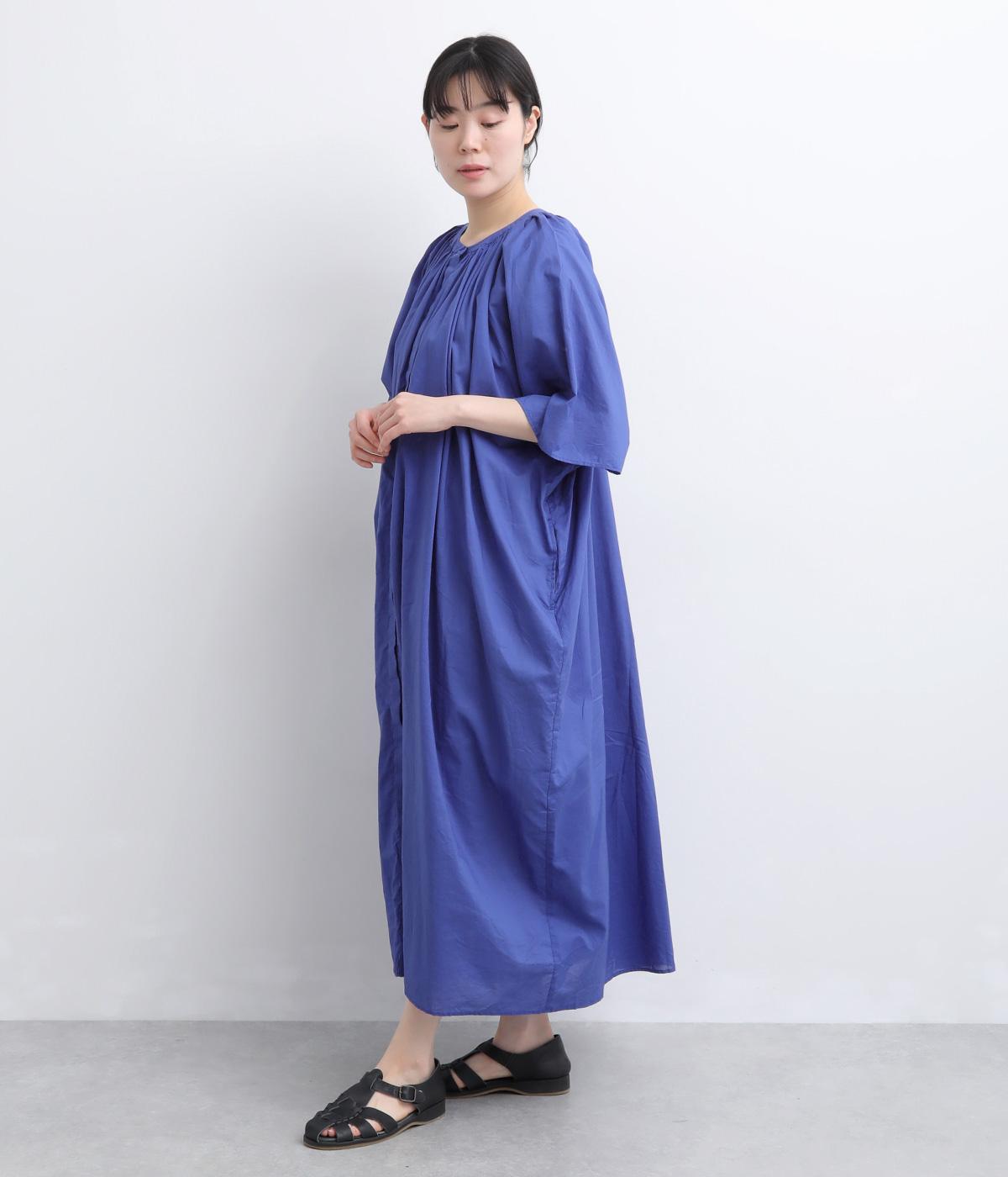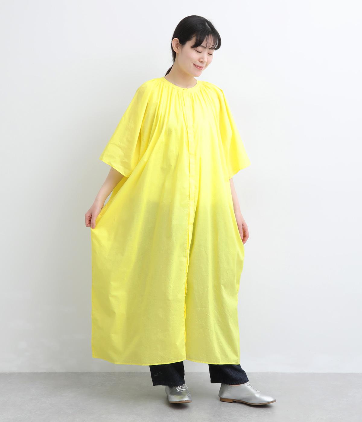 襟元の前後にたっぷりとギャザーを寄せた、ふんわりと広がるシルエットのワンピースです。ラグランスリーブで動きやすく、リラックス感のある着心地に仕上げました。フロントは比翼ボタンですっきりと整え、上品な印象もプラス。前をあけた羽織り風の着こなしもおすすめです。