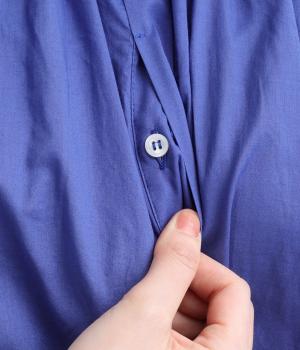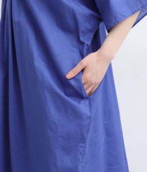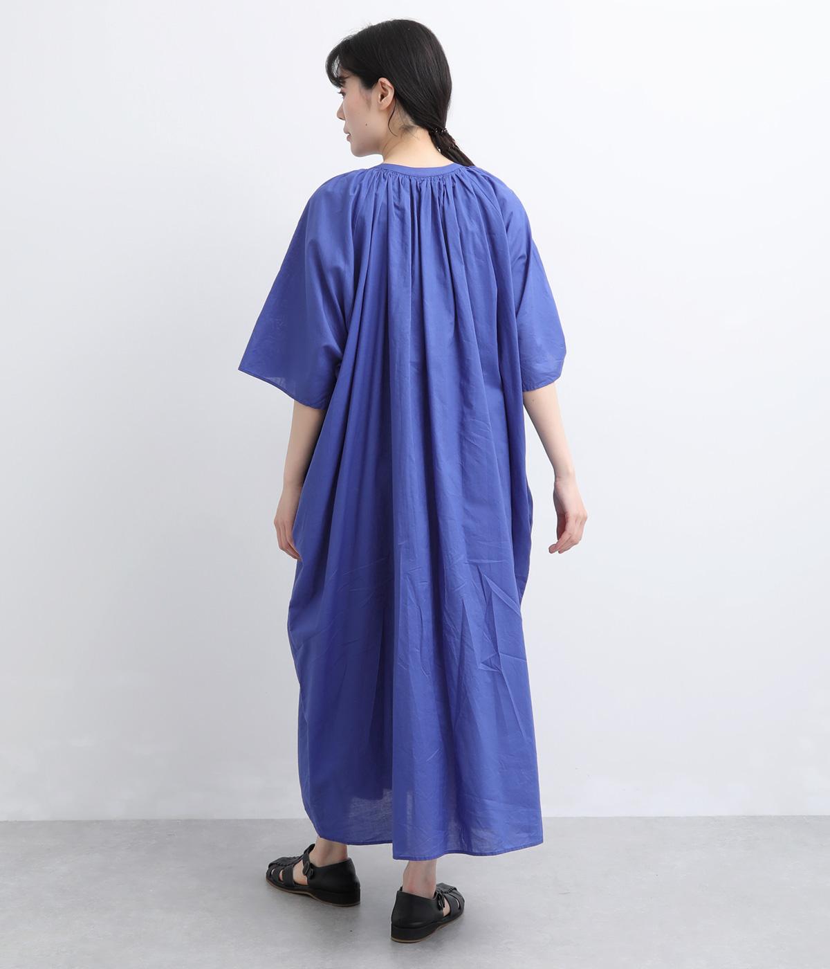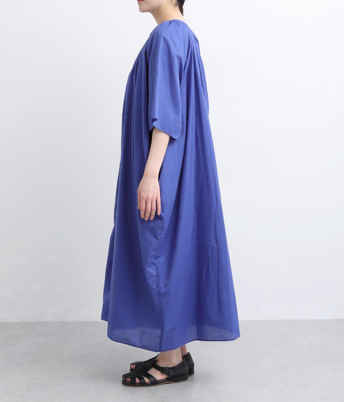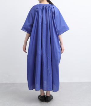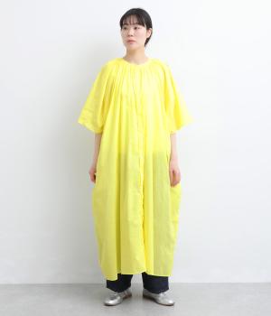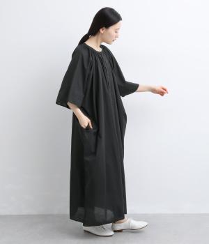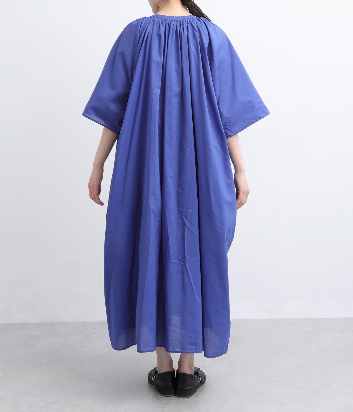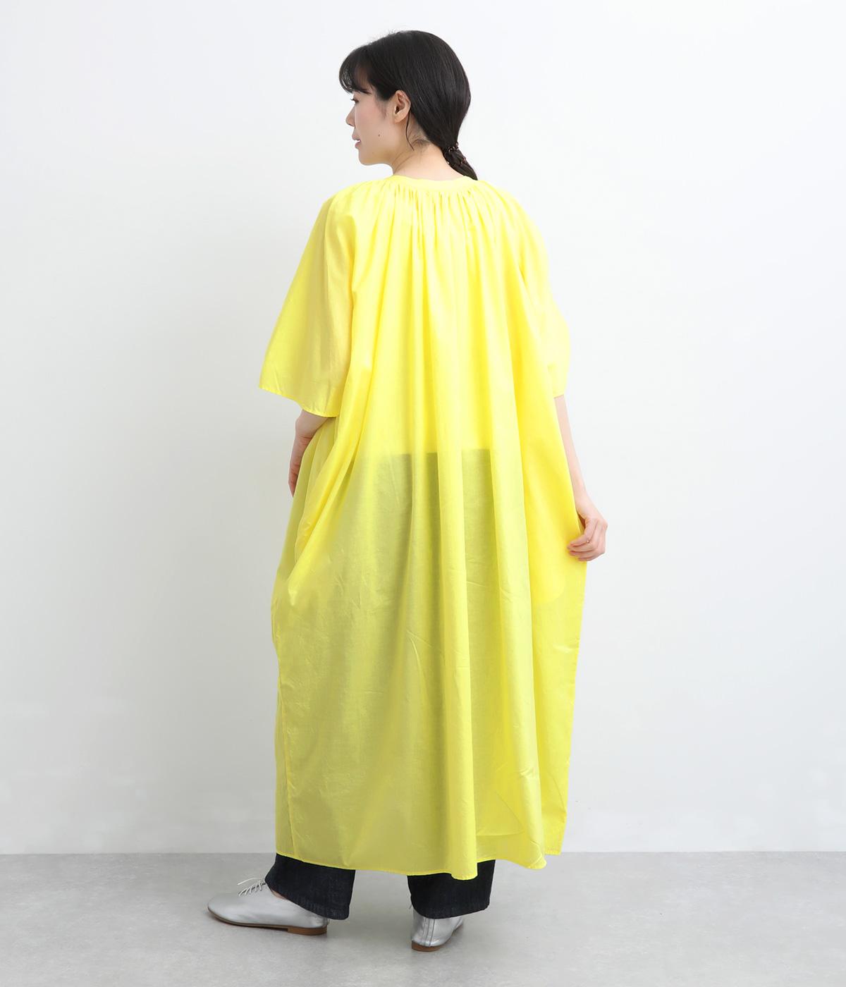 襟元の前後にたっぷりとギャザーを寄せた、ふんわりと広がるシルエットのワンピースです。ラグランスリーブで動きやすく、リラックス感のある着心地に仕上げました。フロントは比翼ボタンですっきりと整え、上品な印象もプラス。前をあけた羽織り風の着こなしもおすすめです。