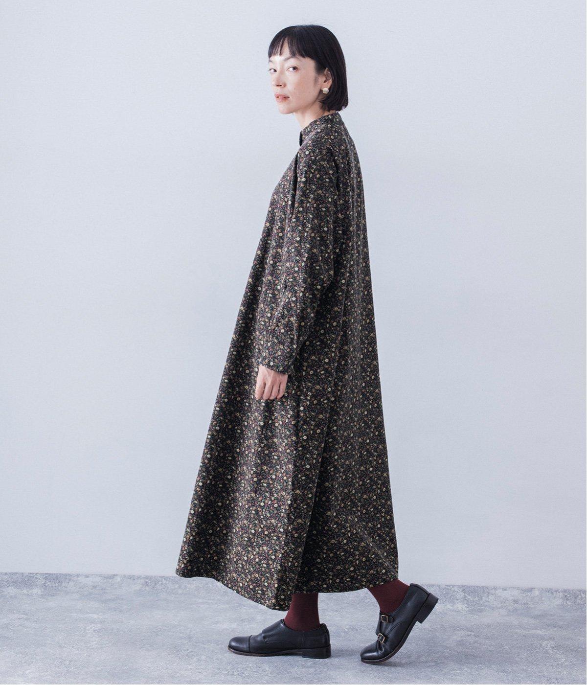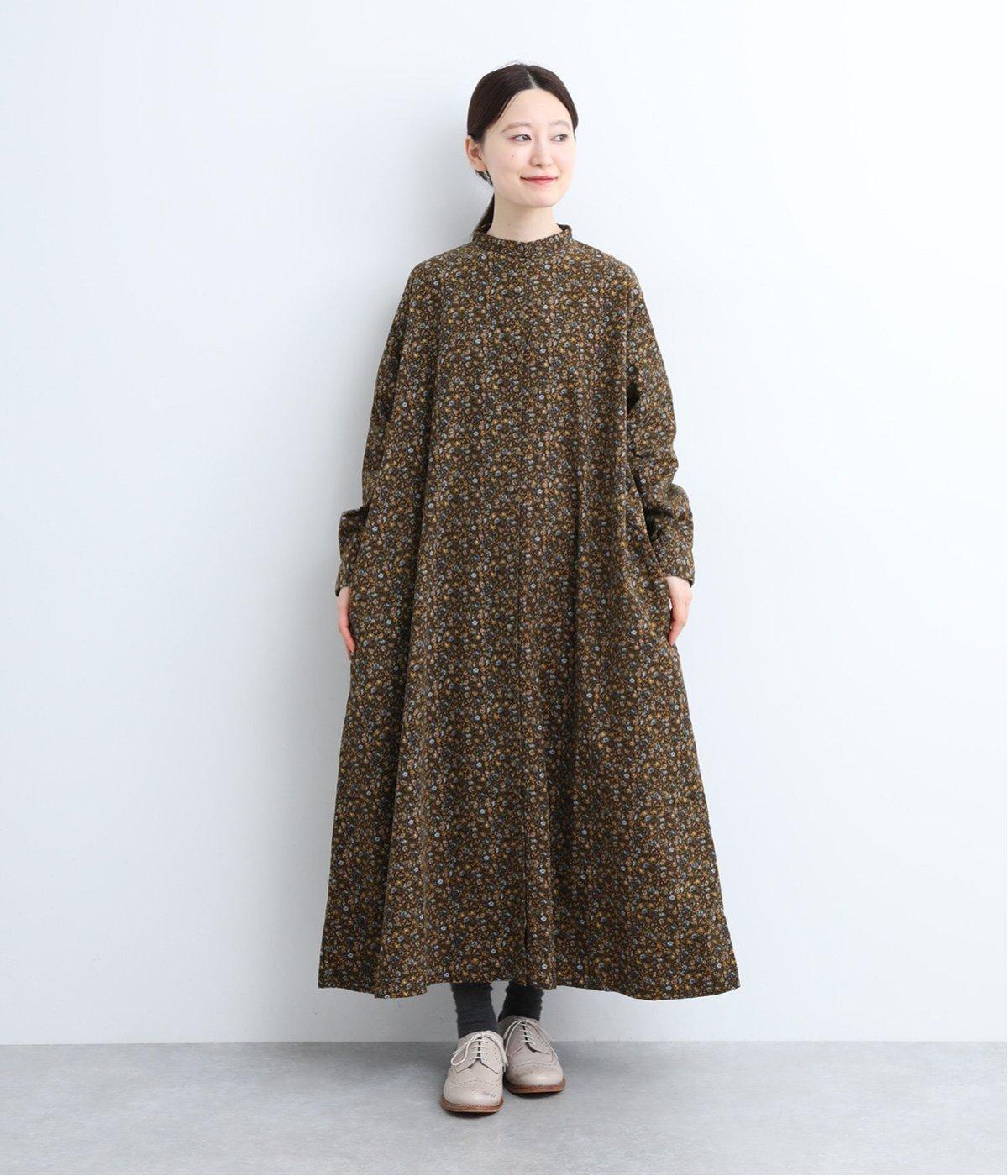 レトロさのあるクラシカルな総花柄で着映え力のあるワンピース。ゆるやかに広がるシンプルなAラインシルエットも雰囲気を盛り上げ、顔まわりはバンドカラーですっきりバランスよく。前あきの羽織りスタイルもお洒落度アップ。