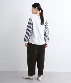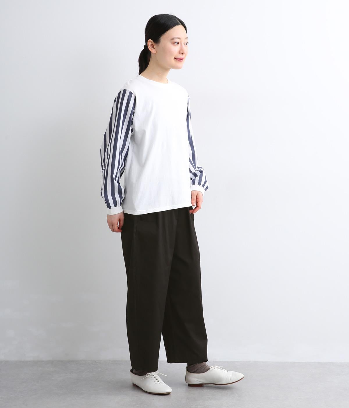 コットンにポリウレタンを混紡した、とても軽くストレッチのきいた生地です。肌にまとわりつかないさらりとした質感で、ストレスフリーなはき心地を叶えます。