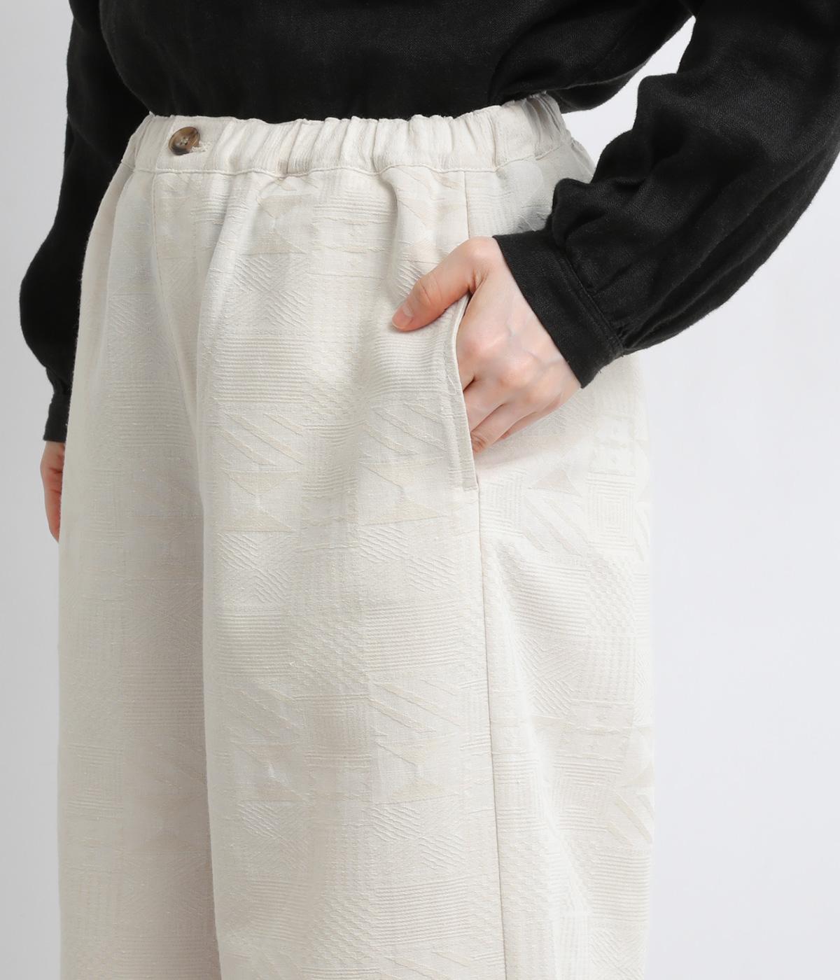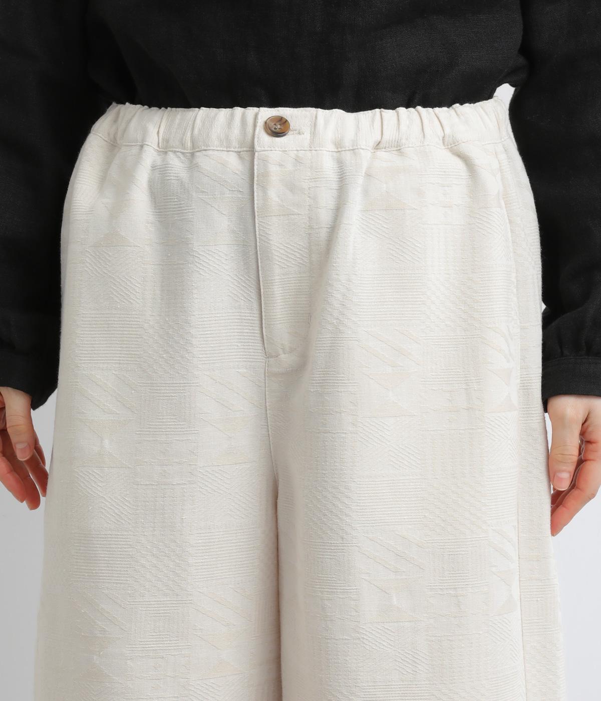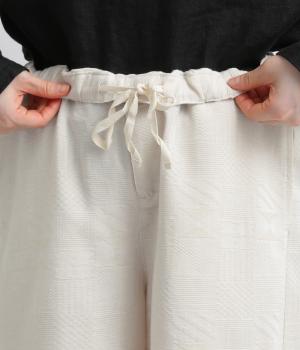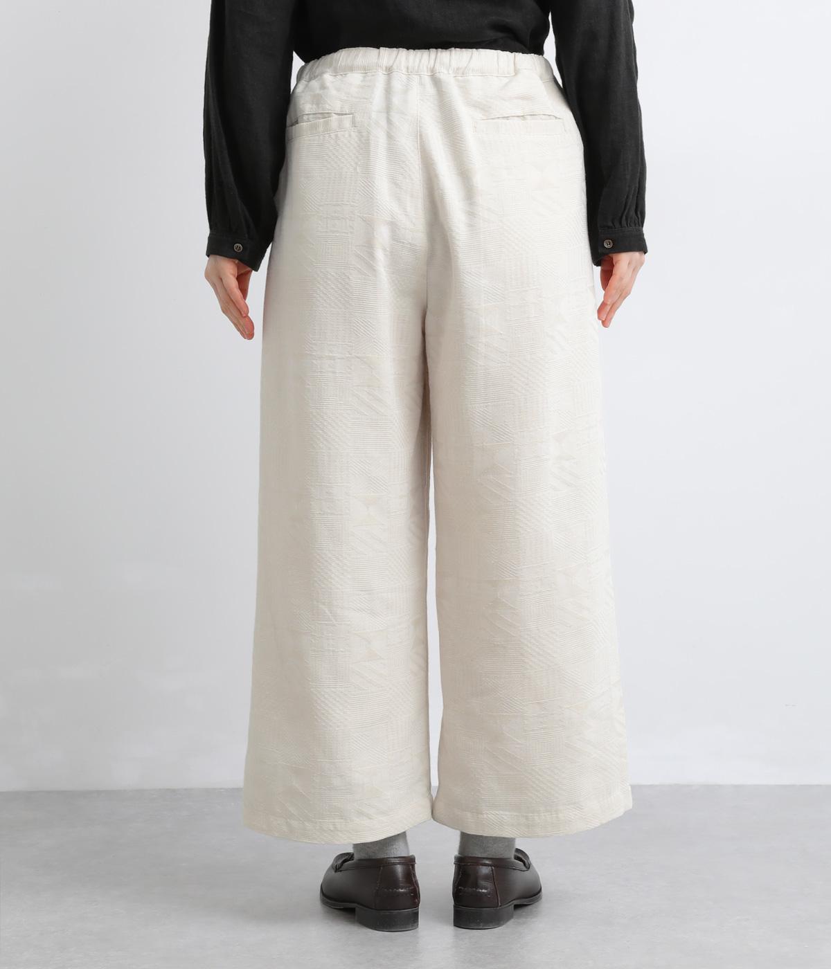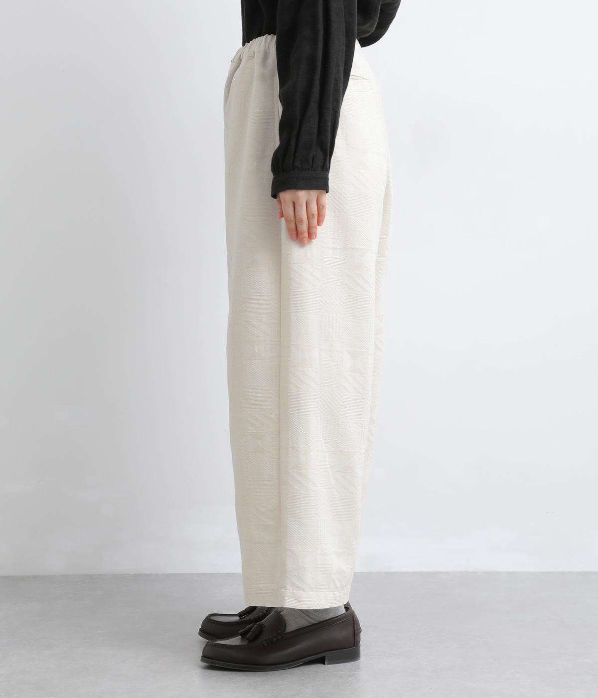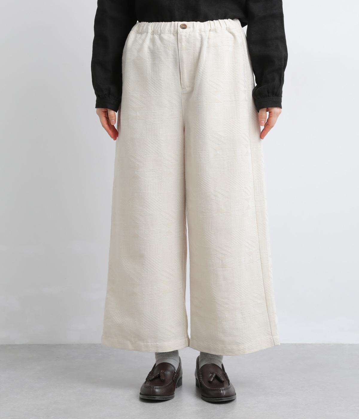 ゆとりのあるセミワイドシルエットに、ジャカード織りの幾何学模様がさりげない立体感を添える一本です。織り柄が光によって表情を変え、シンプルながらも奥行きのある印象に。ウエストはゴム仕様で、リラックスしたはき心地です。フロントのボタンがほどよく引き締め、きちんと感も演出します。