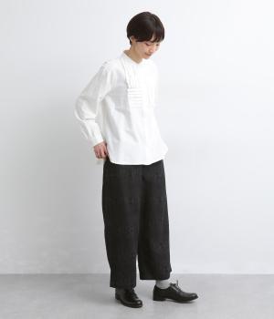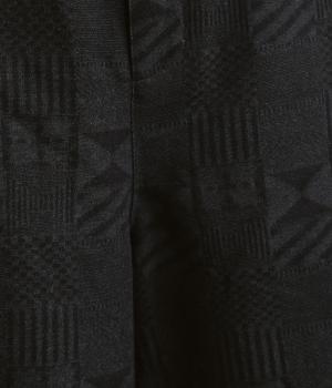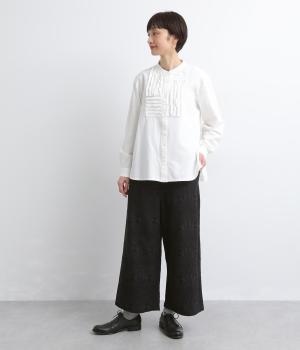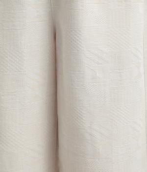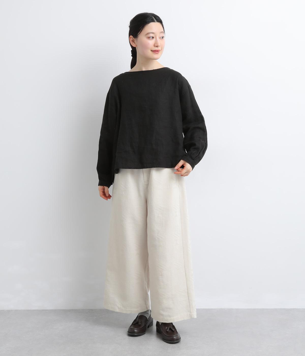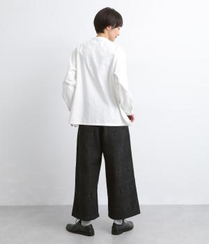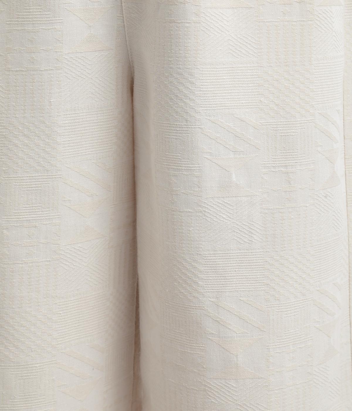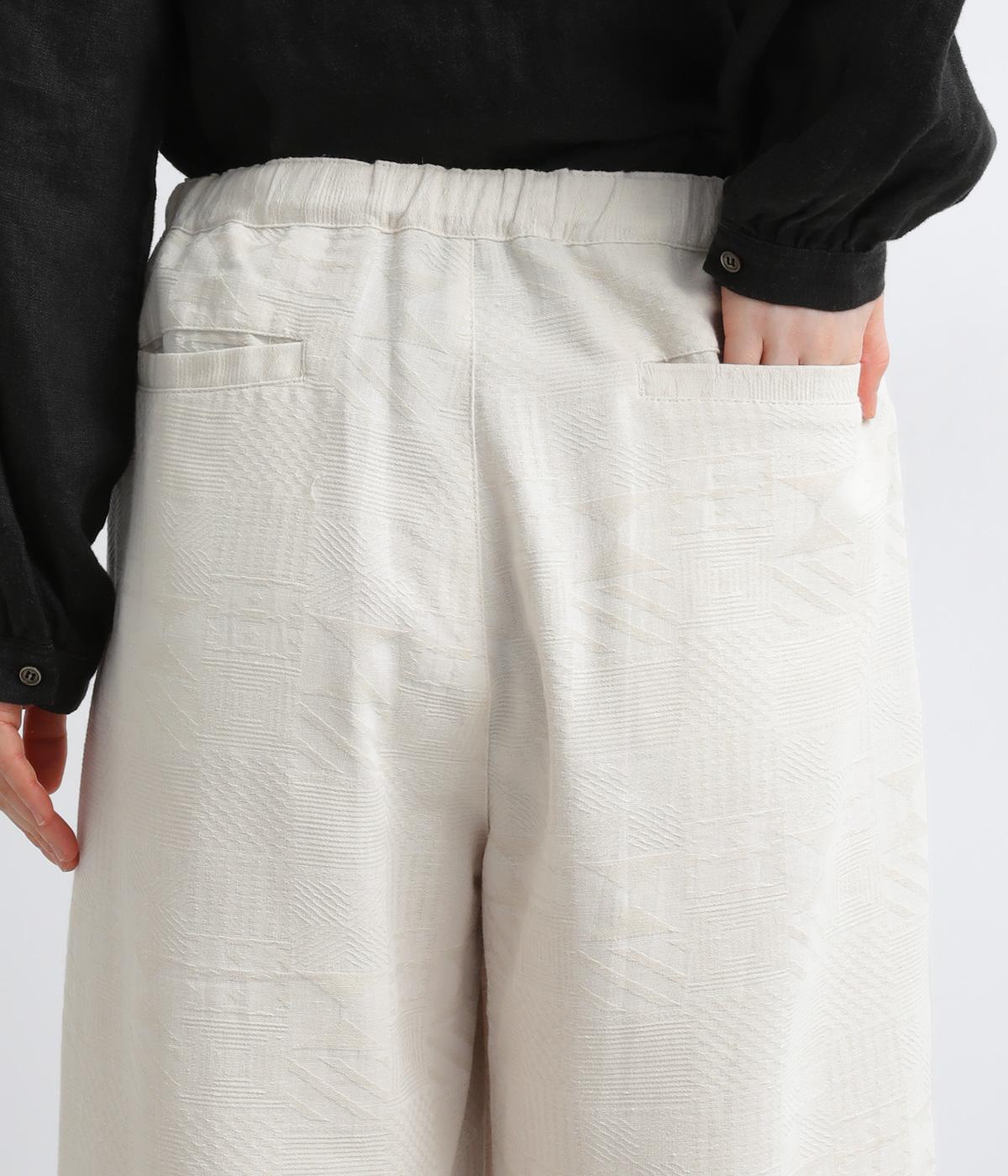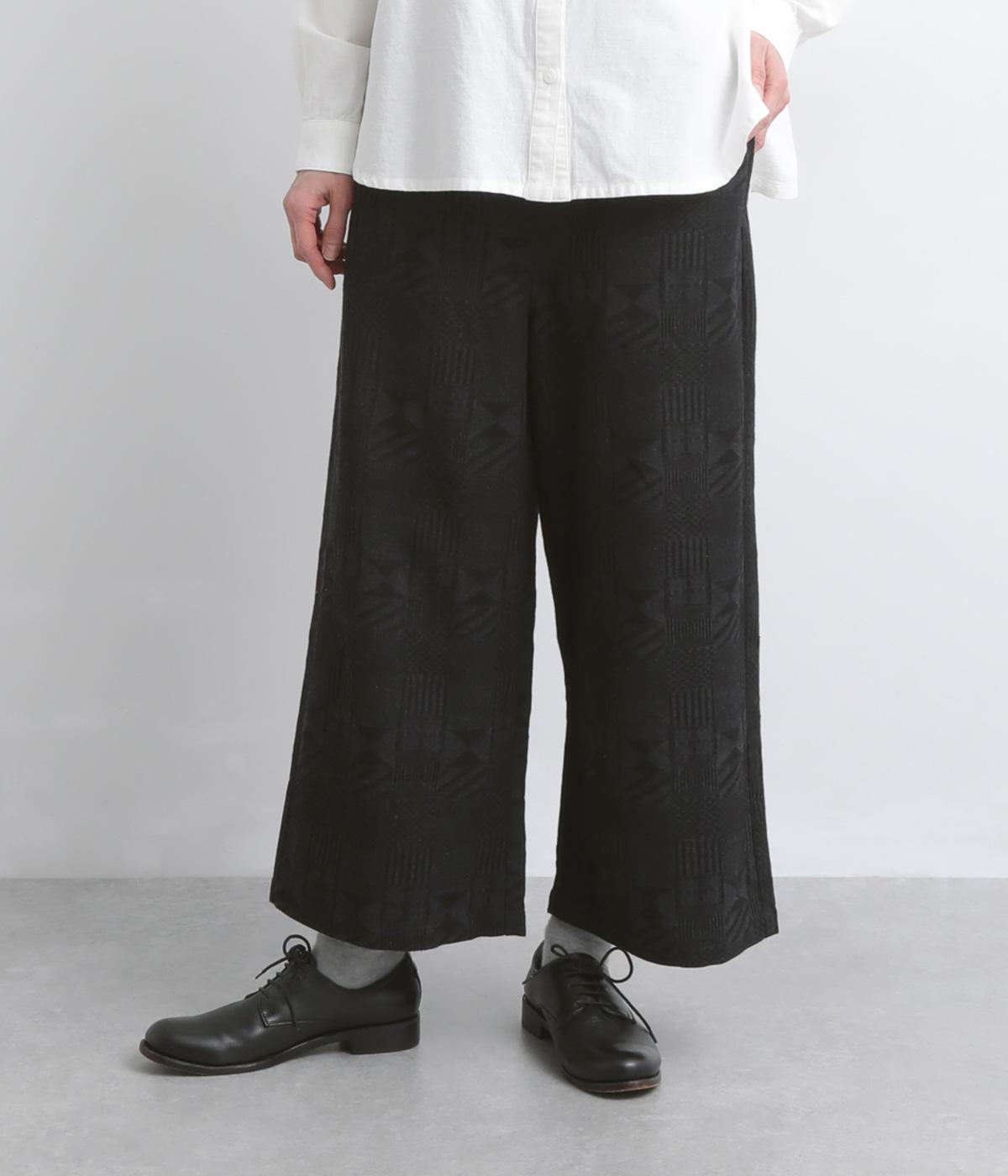 ゆとりのあるセミワイドシルエットに、ジャカード織りの幾何学模様がさりげない立体感を添える一本です。織り柄が光によって表情を変え、シンプルながらも奥行きのある印象に。ウエストはゴム仕様で、リラックスしたはき心地です。フロントのボタンがほどよく引き締め、きちんと感も演出します。