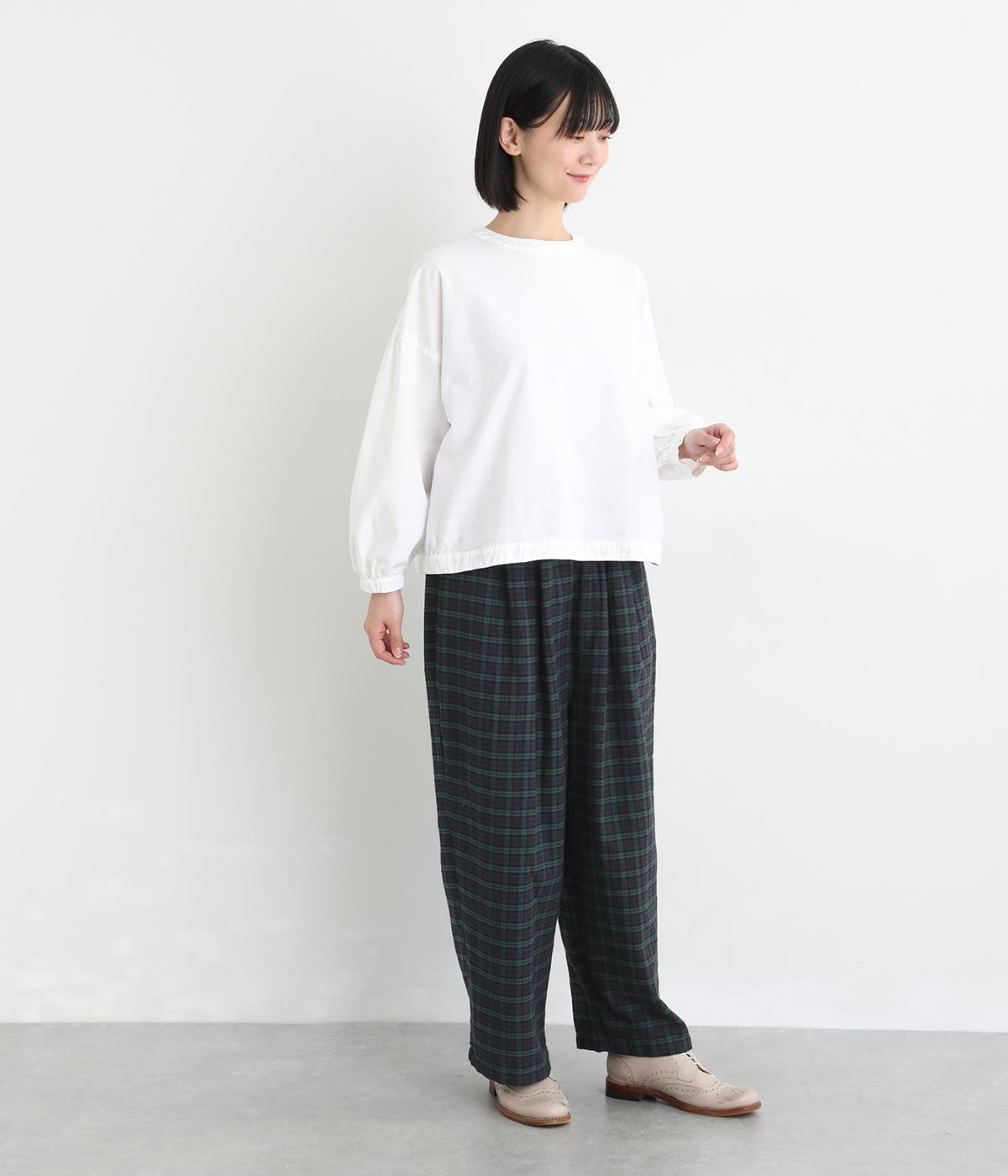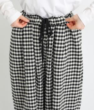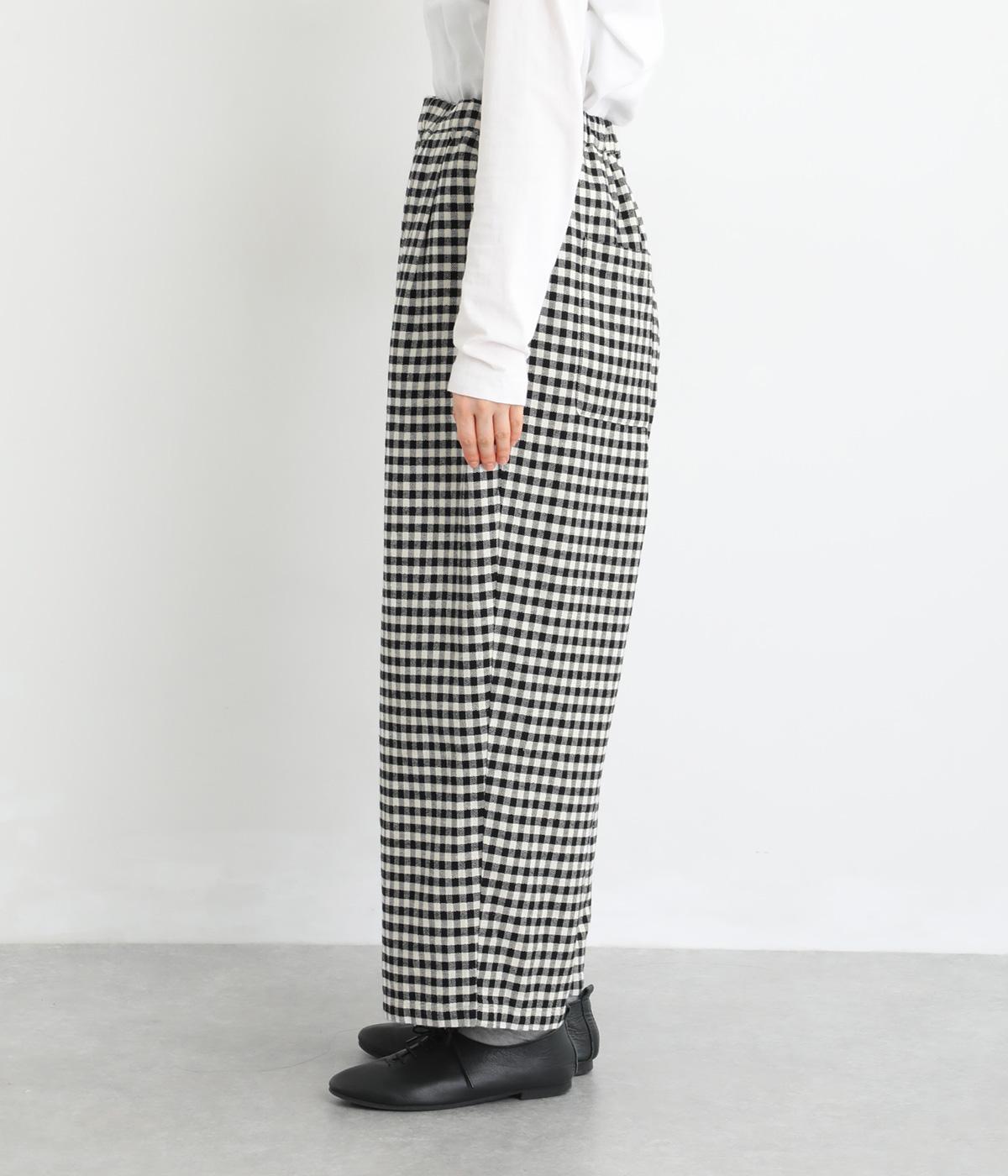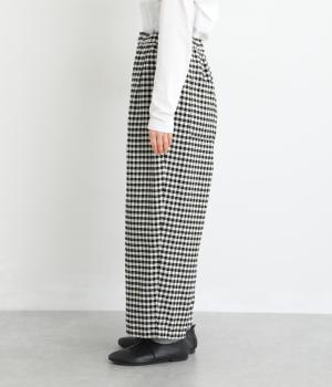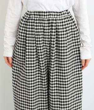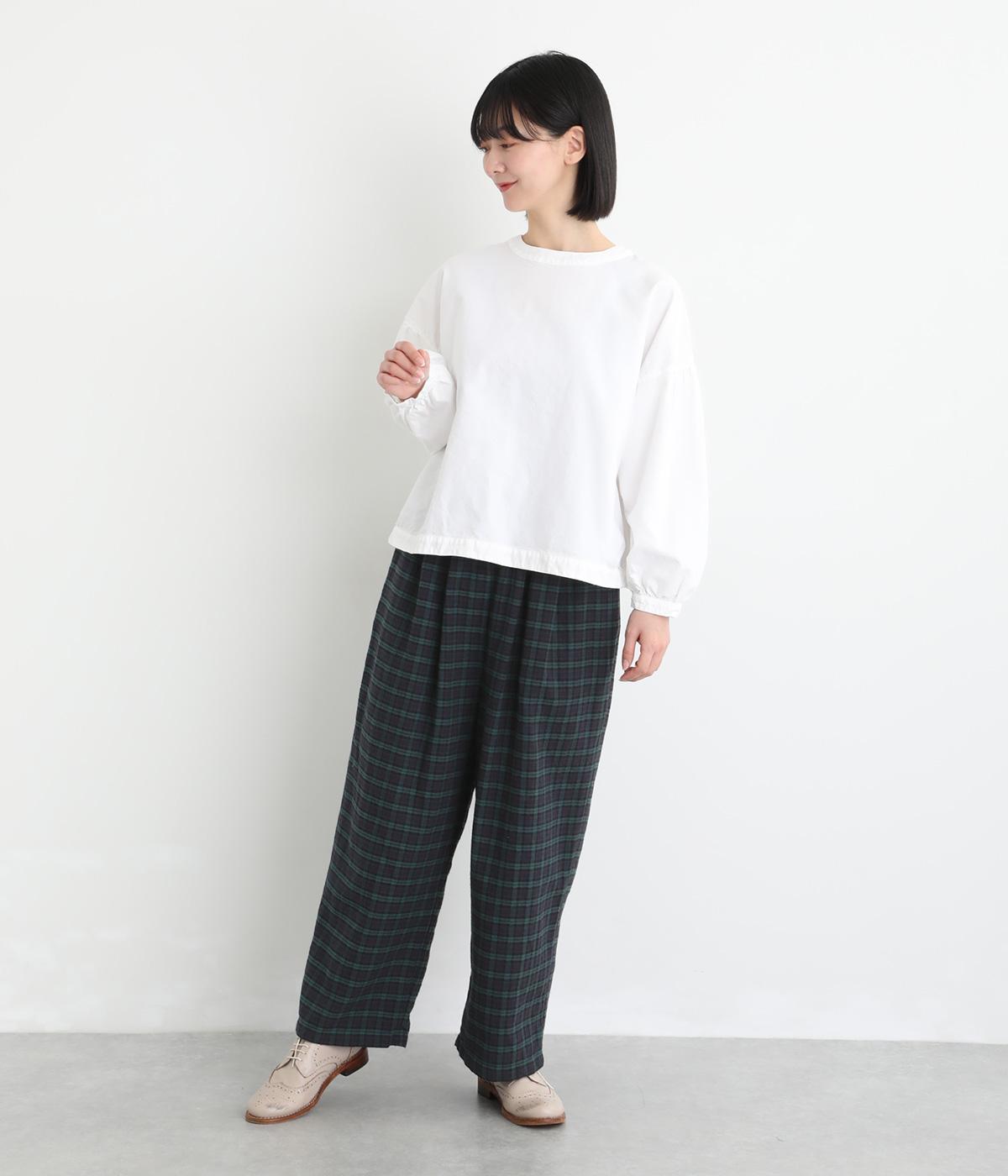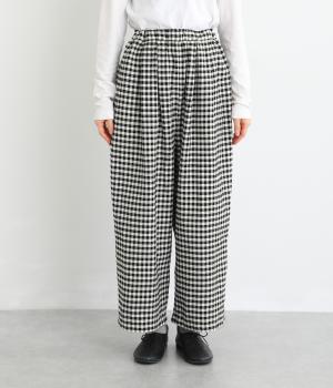 フロントにタックをほどこし、腰まわりにゆとりを持たせながら、裾へすとんと落ちるワイドシルエットに仕立てました。広がりすぎないラインで、すっきりとした印象に。ウエストはぐるりとゴム仕様で、リラックスしたはき心地も魅力です。プレーンなデザインで幅広いコーディネートに活躍します。