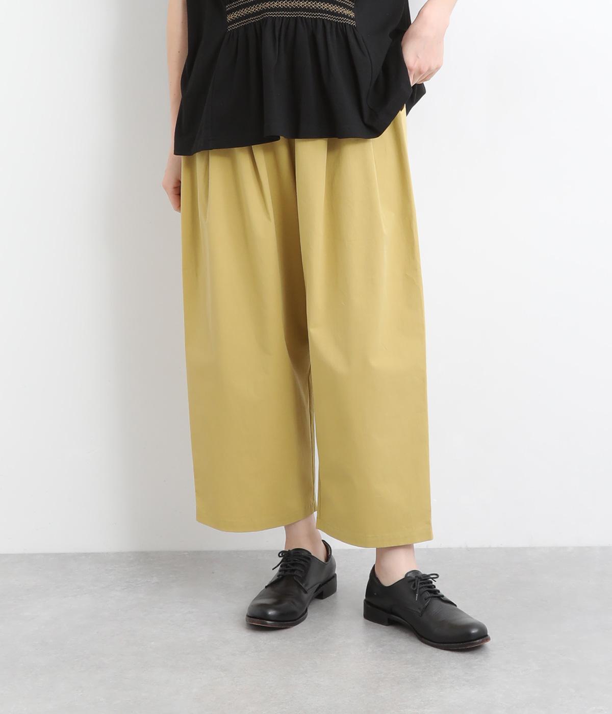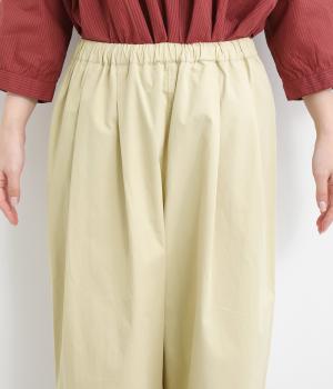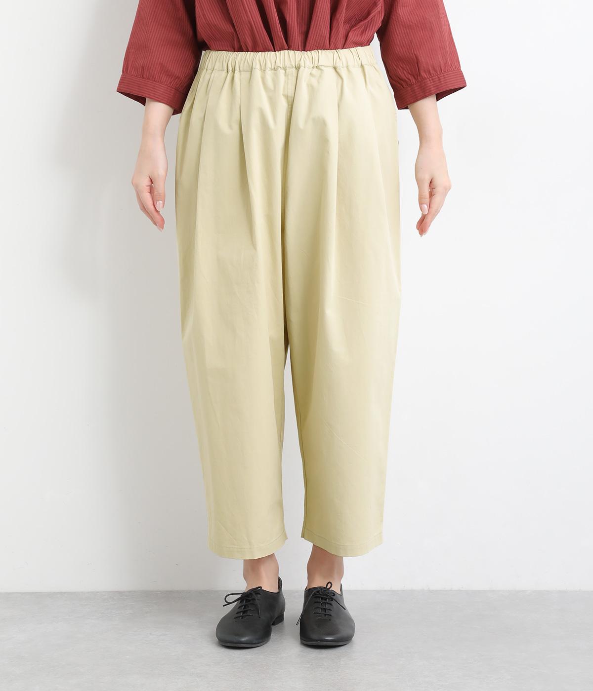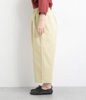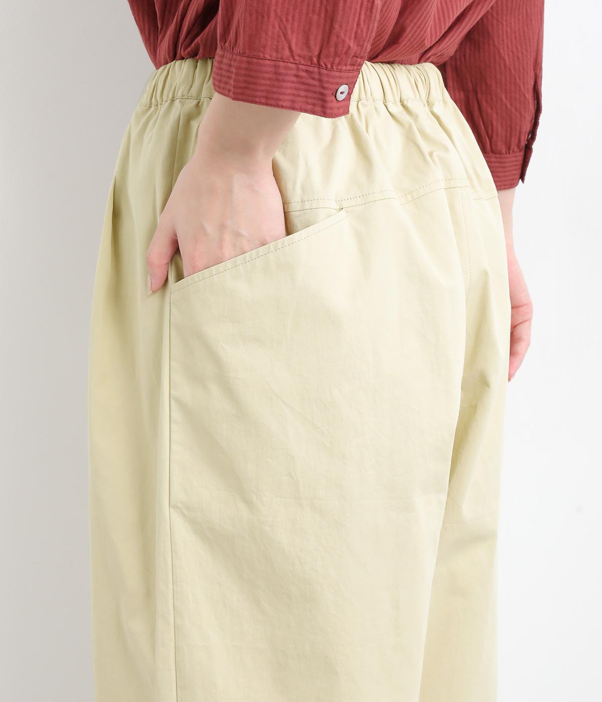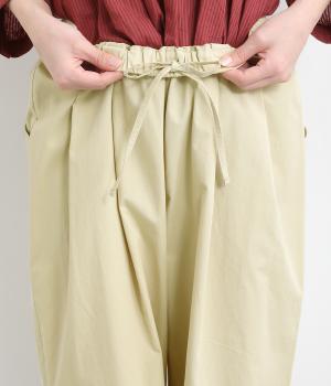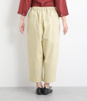 後ろ身頃のサイド部分についたポケットデザインが特徴的なテーパードパンツです。ゆとりを持たせたサイジングで、足元を軽快に見せるクロップド丈。ウエストは総ゴム&内紐でサイズ調整も楽にできる仕様です。