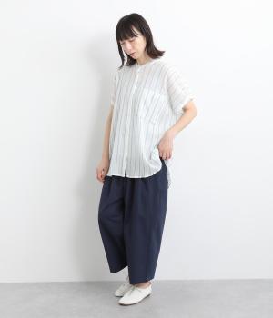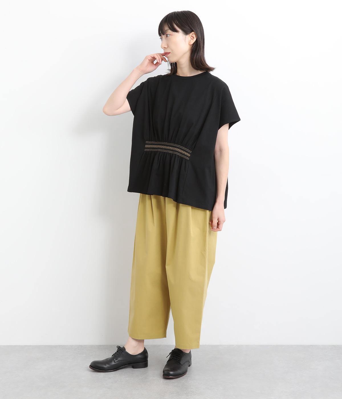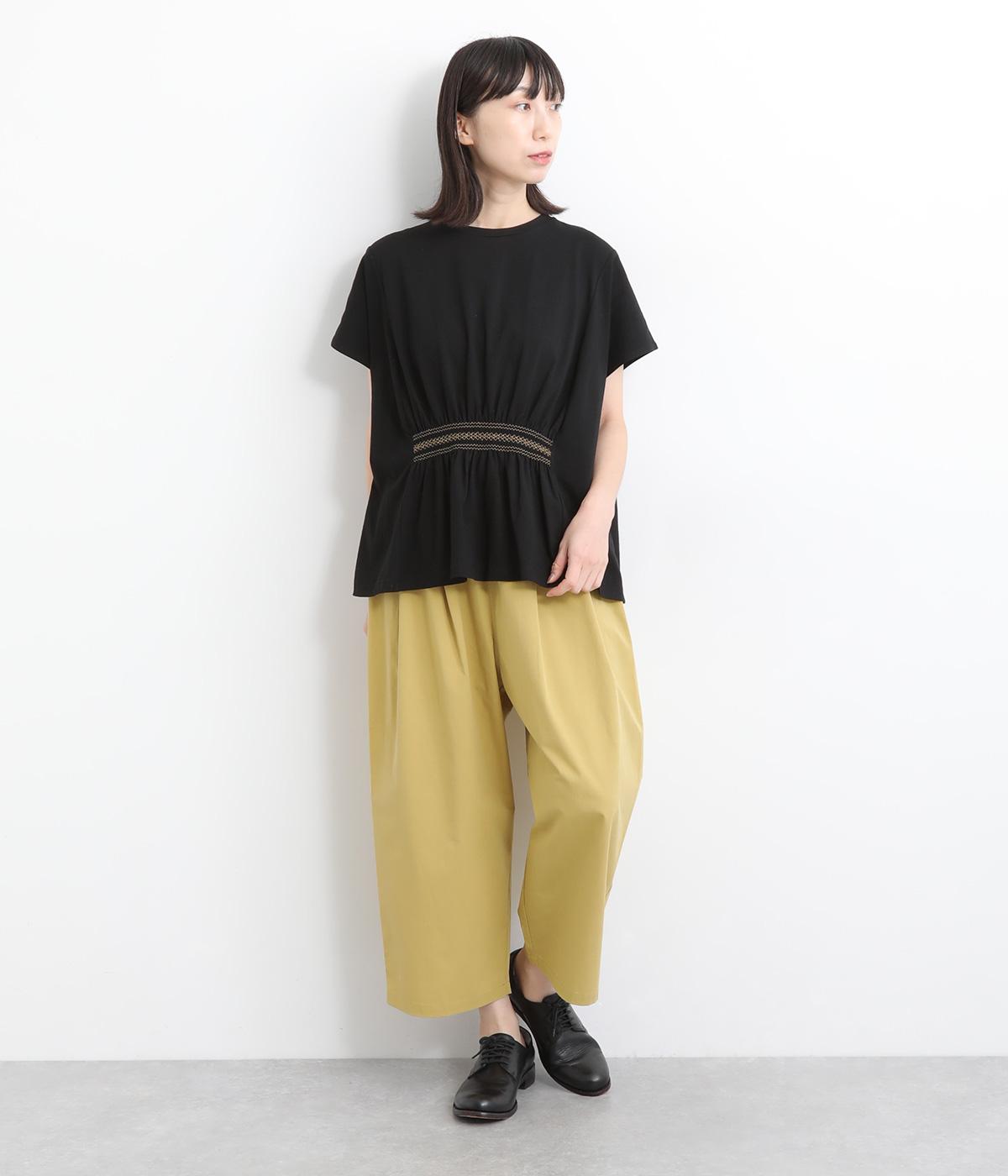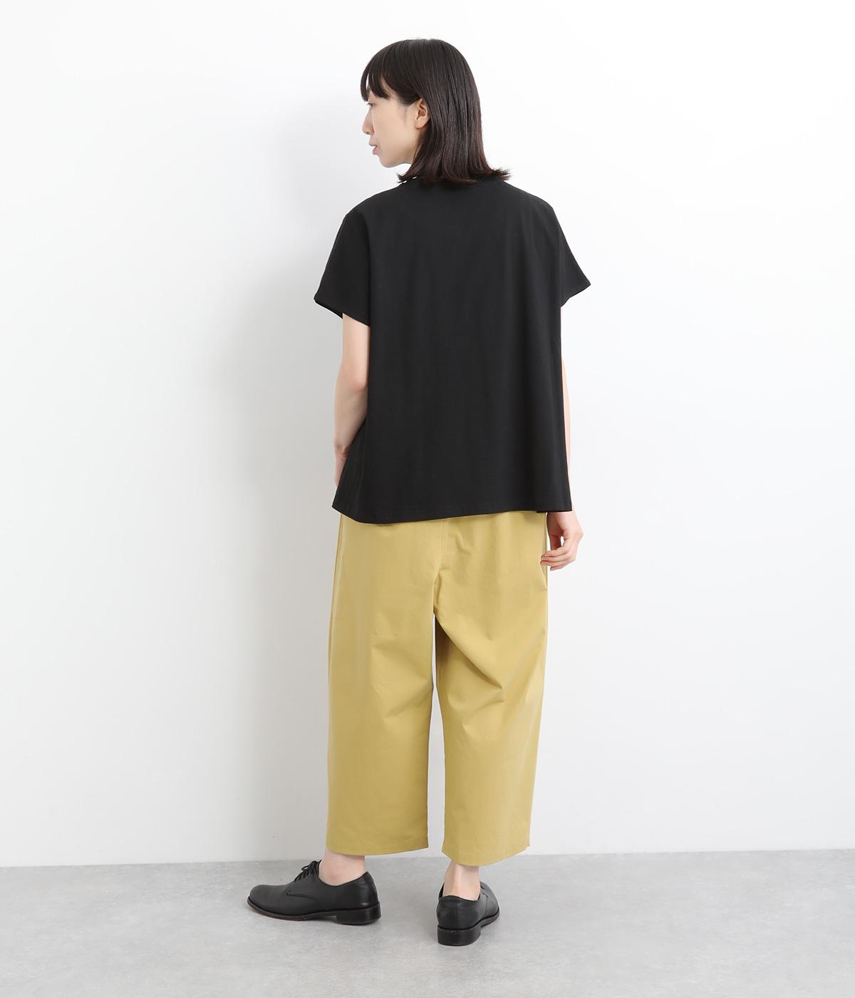 後ろ身頃のサイド部分についたポケットデザインが特徴的なテーパードパンツです。ゆとりを持たせたサイジングで、足元を軽快に見せるクロップド丈。ウエストは総ゴム&内紐でサイズ調整も楽にできる仕様です。