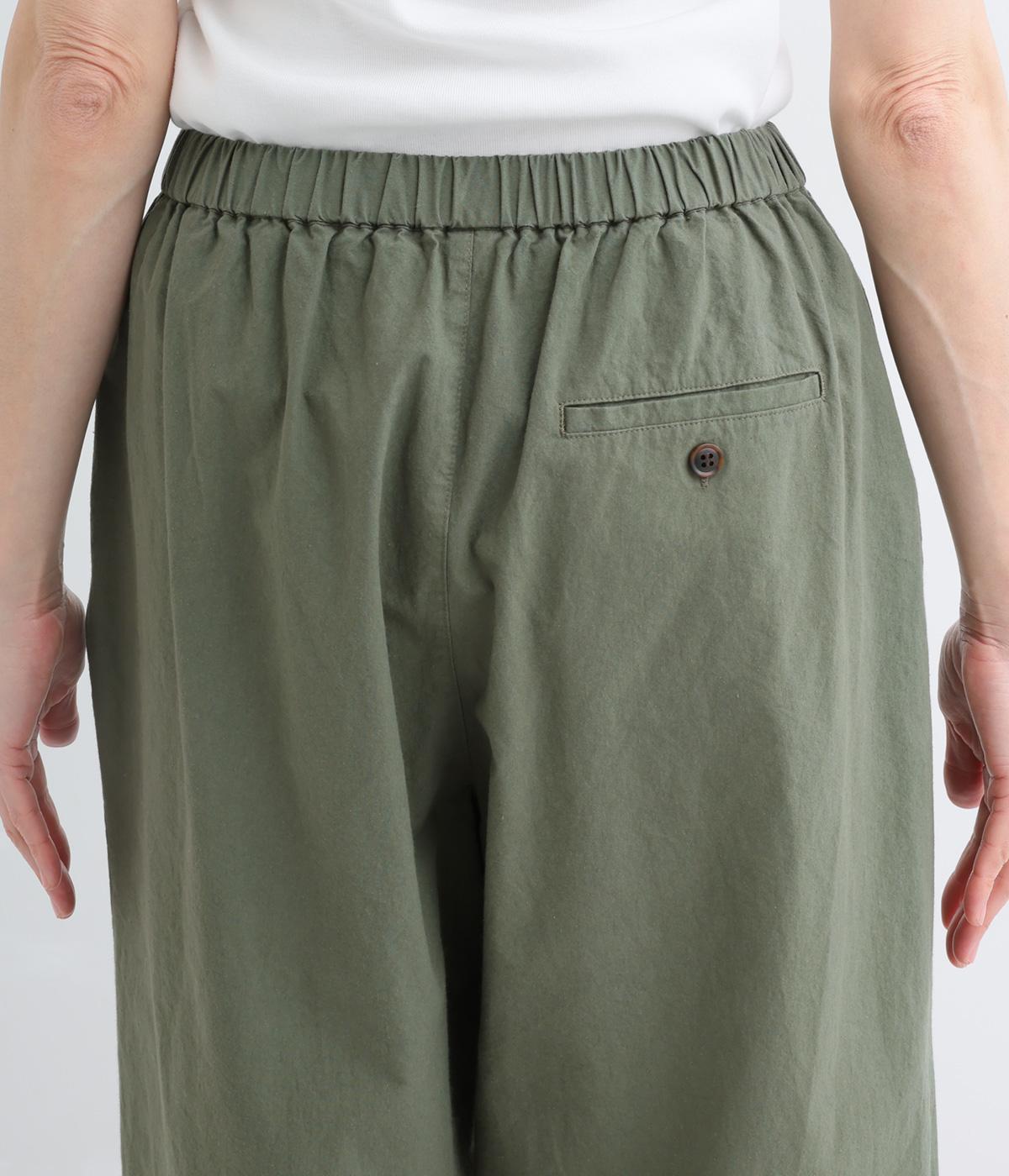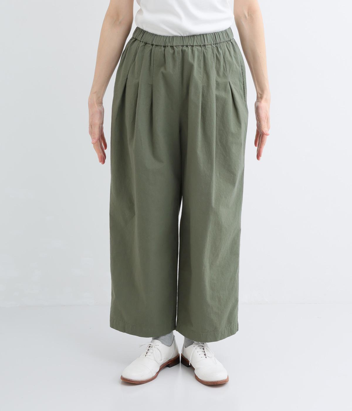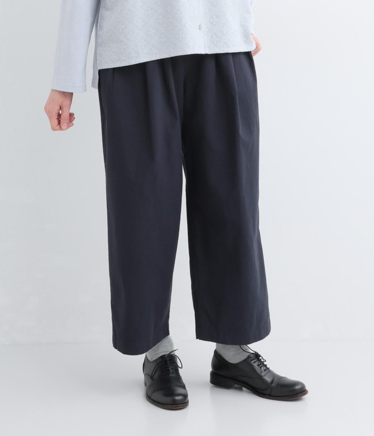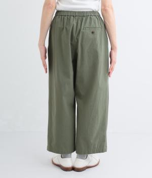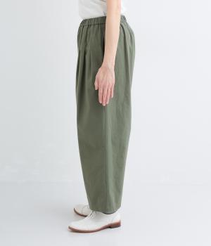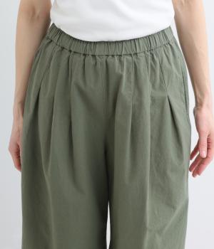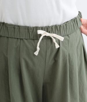 ゆるやかなテーパードシルエットで脚のラインを拾いにくく、たっぷりとほどこしたタックが腰まわりをカバーします。ウエストは総ゴムでリラックス感のある穿き心地。内紐でサイズ調節も可能です。